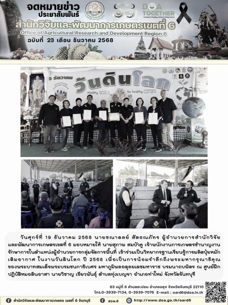 สวพ.6 เข้าร่วมเป็นวิทยากรฐานเรียนรู้การผลิตปุ๋ยหมักเติมอากาศ ในงานวันดินโลก ปี 2568 19 ธันวาคม 2025 admin กิจกรรม สวพ.6, ข่าว วันศุกร์ที่ 19 ธันวาคม 2568 นายชณาดลย์ สัตธณภัทร ผู้อำนวยการสำนักวิจัยและพัฒนาการเกษตรเขตที่ 6 มอบหมายให้ นายสุภาพ สมบัวคู เจ้าพนักงานการเกษตรชำนาญงาน รักษาการในตำแหน่งผู้อำนวยการกลุ่มจัดการพื้นที่ เข้าร่วมเป็นวิทยากรฐานเรียนรู้การผลิตปุ๋ยหมักเติมอากาศ ในงานวันดินโลก ปี 2568 เพื่อเป็นการน้อมรำลึกถึงพระมหากรุณาธิคุณของพระบาทสมเด็จพระบรมชนกาธิเบศร มหาภูมิพลอดุลยเดชมหาราช บรมนาถบพิตร ณ ศูนย์ฝึกปฏิบัติหมอดินอาสา นายวิชาญ เขียวพันธุ์ ตำบลทุ่งเบญจา อำเภอท่าใหม่ จังหวัดจันทบุรี FacebookFacebookXXLINELine