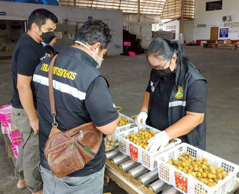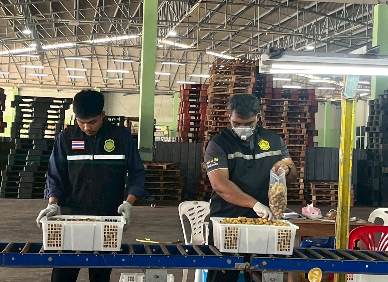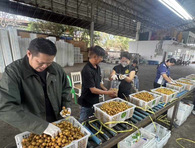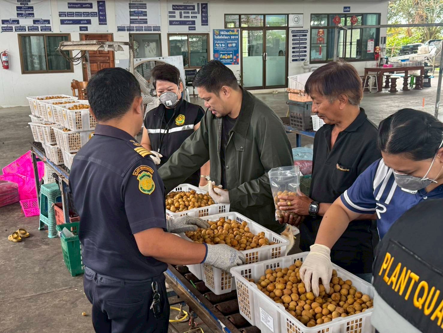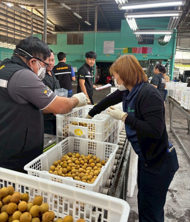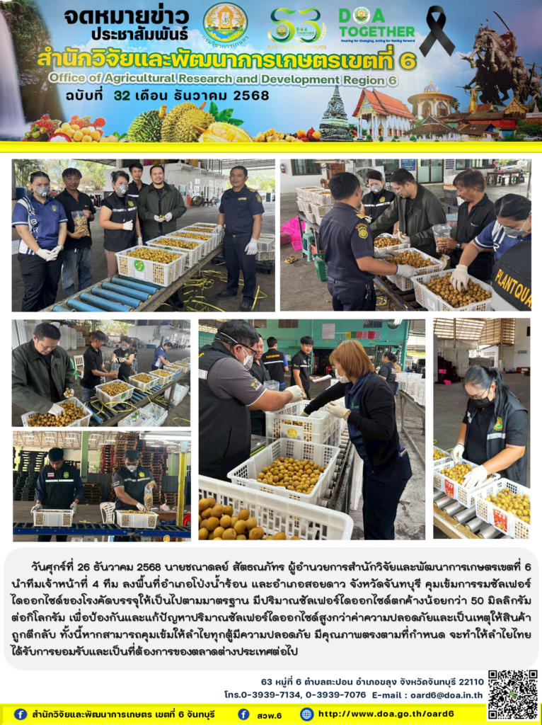 นายชณาดลย์ สัตธณภัทร ผู้อำนวยการสำนักวิจัยและพัฒนาการเกษตรเขตที่ 6 นำทีมเจ้าหน้าที่ 4 ทีม ลงพื้นที่อำเภอโป่งน้ำร้อน และอำเภอสอยดาว จังหวัดจันทบุรี คุมเข้มการรมซัลเฟอร์ไดออกไซด์ของโรงคัดบรรจุให้เป็นไปตามมาตรฐาน 26 ธันวาคม 2025 admin กิจกรรม สวพ.6, ข่าว วันศุกร์ที่ 26 ธันวาคม 2568 นายชณาดลย์ สัตธณภัทร ผู้อำนวยการสำนักวิจัยและพัฒนาการเกษตรเขตที่ 6 นำทีมเจ้าหน้าที่ 4 ทีม ลงพื้นที่อำเภอโป่งน้ำร้อน และอำเภอสอยดาว จังหวัดจันทบุรี คุมเข้มการรมซัลเฟอร์ ไดออกไซด์ของโรงคัดบรรจุให้เป็นไปตามมาตรฐาน มีปริมาณซัลเฟอร์ไดออกไซด์ตกค้างน้อยกว่า 50 มิลลิกรัมต่อกิโลกรัม เพื่อป้องกันและแก้ปัญหาปริมาณซัลเฟอร์ไดออกไซด์สูงกว่าค่าความปลอดภัยและเป็นเหตุให้สินค้าถูกตีกลับ ทั้งนี้หากสามารถคุมเข้มให้ลำไยทุกตู้มีความปลอดภัย มีคุณภาพตรงตามที่กำหนด จะทำให้ลำไยไทยได้รับการยอมรับและเป็นที่ต้องการของตลาดต่างประเทศต่อไป FacebookFacebookXXLINELine