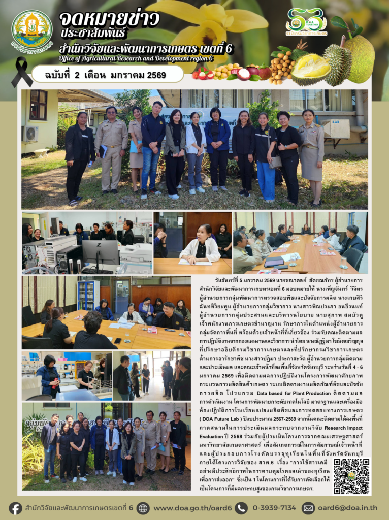 วันจันทร์ที่ 5 มกราคม 2569 นายชณาดลย์ สัตธณภัทร ผู้อำนวยการสำนักวิจัยและพัฒนาการเกษตรเขตที่ 6 มอบหมายให้ นางเพ็ญจันทร์ วิจิตร ผู้อำนวยการกลุ่มพัฒนาการตรวจสอบพืชและปัจจัยการผลิต นางเกษสิริ ฉันทพิริยะพูน ผู้อำนวยการกลุ่มวิชาการ นางสาวพิณประภา ธนธีรนนท์ ผู้อำนวยการกลุ่มประสานและบริหารนโยบาย นายสุภาพ สมบัวคู เจ้าพนักงานการเกษตรชำนาญงาน รักษาการในตำแหน่งผู้อำนวยการกลุ่มจัดการพื้นที่ พร้อมด้วยเจ้าหน้าที่ที่เกี่ยวข้อง ร่วมรับคณะติดตามผลการปฏิบัติงานจากกองแผนงานและวิชาการ นำโดย นางณัฏฐิมา โฆษิตเจริญกุล ที่ปรึกษาอธิบดีกรมวิชาการเกษตรและที่ปรึกษากรมวิชาการเกษตร ด้านการอารักขาพืช นางสาวปฏิมา ประภาสะวัต ผู้อำนวยการกลุ่มติดตามและประเมินผล และคณะเจ้าหน้าที่ลงพื้นที่จังหวัดจันทบุรี ระหว่างวันที่ 4 – 6 มกราคม 2569 เพื่อติดตามผลการปฏิบัติงานโครงการพัฒนาศักยภาพกระบวนการผลิตสินค้าเกษตร ระบบติดตามงานผลิตภัณฑ์พืชและปัจจัยการผลิต โปรแกรม Data-based-for-Plant-Production ติดตามผลการดำเนินงาน โครงการพัฒนายกระดับเทคโนโลยี มาตรฐานและเครื่องมือห้องปฏิบัติการโรงเรือนแปลงผลิตพืชและการทดสอบทางการเกษตร ( DOA-Future-Lab ) ปีงบประมาณ 2567-2569 จากนั้นคณะติดตามได้ลงพื้นที่ภาคสนามในการประเมินผลกระทบจากงานวิจัย Research-Impact Evaluation ปี 2568 ร่วมกับผู้ประเมินโครงการจากคณะเศรษฐศาสตร์ มหาวิทยาลัยเกษตรศาสตร์ เพื่อสังเกตการณ์ในการสัมภาษณ์เจ้าหน้าที่และผู้ประกอบการโรงคัดบรรจุทุเรียนในพื้นที่จังหวัดจันทบุรี ภายใต้โครงการวิจัยของ สวพ.6 เรื่อง “การใช้สารเคมีอย่างมีประสิทธิภาพในการควบคุมโรคผลเน่าของทุเรียน เพื่อการส่งออก” ซึ่งเป็น 1 ในโครงการที่ได้รับการคัดเลือกให้เป็นโครงการที่มีผลกระทบสูงของกรมวิชาการเกษตร.