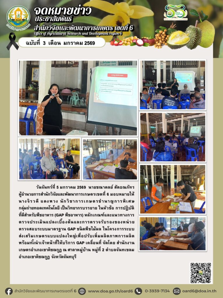 สวพ.6 เป็นวิทยากรบรรยาย ในหัวข้อ การปฏิบัติที่ดีสำหรับพืชอาหาร (GAP พืชอาหาร) หลักเกณฑ์และแนวทางการตรวจประเมินแปลงเบื้องต้นและการตรวจรับรองของหน่วยตรวจสอบระบบมาตรฐาน GAP ชนิดพืชไม้ผล 5 มกราคม 2026 admin กิจกรรม สวพ.6, ข่าว วันจันทร์ที่ 5 มกราคม 2569 นายชณาดลย์ สัตธณภัทร ผู้อำนวยการสำนักวิจัยและพัฒนาการเกษตรเขตที่ 6 มอบหมายให้ นางจิรวดี แดงพวง นักวิชาการเกษตรชำนาญการพิเศษ กลุ่มถ่ายทอดเทคโนโลยี เป็นวิทยากรบรรยาย ในหัวข้อ การปฏิบัติที่ดีสำหรับพืชอาหาร (GAP พืชอาหาร) หลักเกณฑ์และแนวทางการตรวจประเมินแปลงเบื้องต้นและการตรวจรับรองของหน่วยตรวจสอบระบบมาตรฐาน GAP ชนิดพืชไม้ผล ในโครงการระบบส่งเสริมเกษตรแบบแปลงใหญ่เพื่อปรับเพิ่มผลิตภาพการผลิต พร้อมทั้งนำเจ้าหน้าที่ให้บริการ GAP เคลื่อนที่ จัดโดย สำนักงานเกษตรอำเภอเขาคิชฌกูฏ ณ ศาลาหมู่บ้าน หมู่ที่ 2 ตำบลจันทเขลม อำเภอเขาคิชฌกูฏ จังหวัดจันทบุรี FacebookFacebookXXLINELine