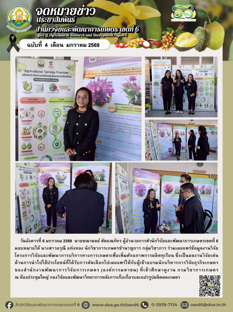 ผู้อำนวยการสำนักวิจัยและพัฒนาการเกษตรเขตที่ 6 มอบหมายให้ นางสาวอรุณี แท่งทอง นักวิชาการเกษตรชำนาญการ กลุ่มวิชาการ ร่วมเผยแพร่ข้อมูลงานวิจัย โครงการวิจัยและพัฒนาการบริการทางการเกษตรเพื่อเพิ่มศักยภาพการผลิตทุเรียน 6 มกราคม 2026 admin กิจกรรม สวพ.6, ข่าว วันอังคารที่ 6 มกราคม 2569 นายชณาดลย์ สัตธณภัทร ผู้อำนวยการสำนักวิจัยและพัฒนาการเกษตรเขตที่ 6 มอบหมายให้ นางสาวอรุณี แท่งทอง นักวิชาการเกษตรชำนาญการ กลุ่มวิชาการ ร่วมเผยแพร่ข้อมูลงานวิจัย โครงการวิจัยและพัฒนาการบริการทางการเกษตรเพื่อเพิ่มศักยภาพการผลิตทุเรียน ซึ่งเป็นผลงานวิจัยเด่น ด้านการนำไปใช้ประโยชน์ที่ได้รับการคัดเลือกไปเผยแพร่ให้กับผู้เข้าอบรมนักบริหารการวิจัยธุรกิจเกษตรของสำนักงานพัฒนาการวิจัยการเกษตร (องค์การมหาชน) ที่เข้าศึกษาดูงาน กรมวิชาการเกษตรณ ห้องประชุมใหญ่ กองวิจัยและพัฒนาวิทยาการหลังการเก็บเกี่ยวและแปรรูปผลิตผลเกษตร FacebookFacebookXXLINELine