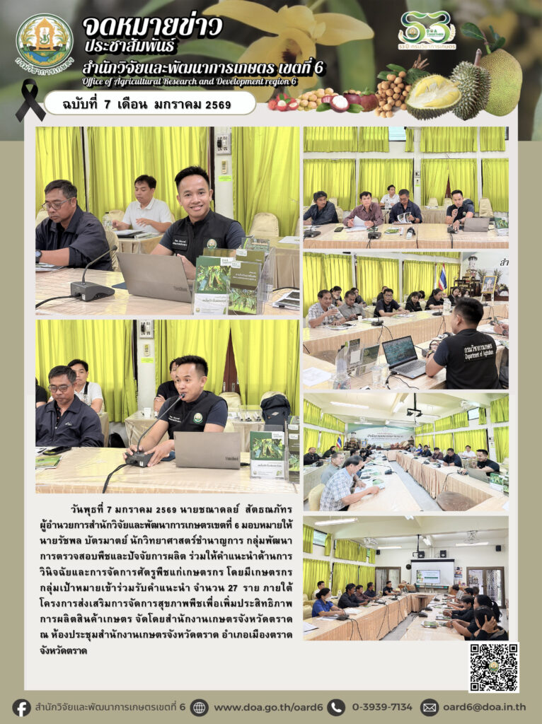 ผู้อำนวยการสำนักวิจัยและพัฒนาการเกษตรเขตที่ 6 มอบหมายให้ นายรัชพล บัตรมาตย์ นักวิทยาศาสตร์ชำนาญการ กลุ่มพัฒนาการตรวจสอบพืชและปัจจัยการผลิต ร่วมให้คำแนะนำด้านการวินิจฉัยและการจัดการศัตรูพืชแก่เกษตรกร 9 มกราคม 2026 admin กิจกรรม สวพ.6, ข่าว วันพุธที่ 7 มกราคม 2569 นายชณาดลย์ สัตธณภัทร ผู้อำนวยการสำนักวิจัยและพัฒนาการเกษตรเขตที่ 6 มอบหมายให้ นายรัชพล บัตรมาตย์ นักวิทยาศาสตร์ชำนาญการ กลุ่มพัฒนาการตรวจสอบพืชและปัจจัยการผลิต ร่วมให้คำแนะนำด้านการวินิจฉัยและการจัดการศัตรูพืชแก่เกษตรกร โดยมีเกษตรกรกลุ่มเป้าหมายเข้าร่วมรับคำแนะนำ จำนวน 27oราย ภายใต้โครงการส่งเสริมการจัดการสุขภาพพืชเพื่อเพิ่มประสิทธิภาพการผลิตสินค้าเกษตร จัดโดยสำนักงานเกษตรจังหวัดตราด ณ ห้องประชุมสำนักงานเกษตรจังหวัดตราด อำเภอเมืองตราด จังหวัดตราด FacebookFacebookXXLINELine