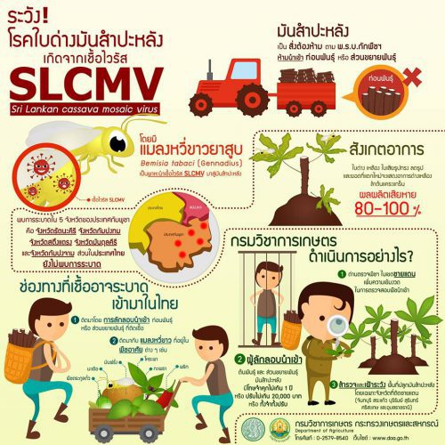 ***กรมวิชาการเกษตรกำหนดแนวทางป้องกันและเฝ้าระวังโรคเชื้อไวรัส Sri Lankan cassava mosaic virus (SLCMV) ใน 3 แนวทางด้วยกัน คือห้ามไม่ให้มีการนำเข้าท่อนพันธุ์และส่วนขยายพันธุ์ของมันสำปะหลังอย่างเด็ดขาด, ควบคุมและป้องกันการลักลอบนำเข้าท่อนพันธุ์หรือส่วนขยายพันธุ์ของมันสำปะหลังเข้ามาในประเทศและการขอความร่วมมือผู้เกี่ยวข้อง ภาครัฐ เอกชนร่วมมือช่วยกันเฝ้าระวังเพื่อมิให้เกิดผลกระทบต่ออุตสาหกรรมมันสำปะหลังของไทยในภาพรวม