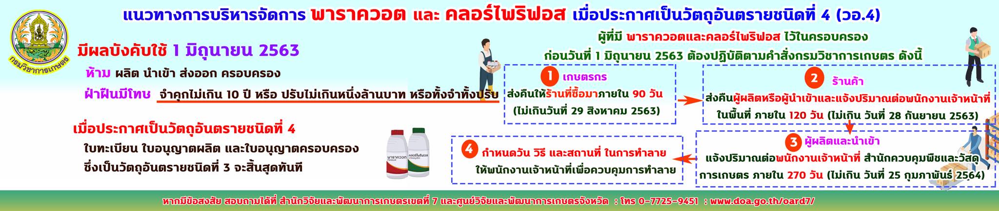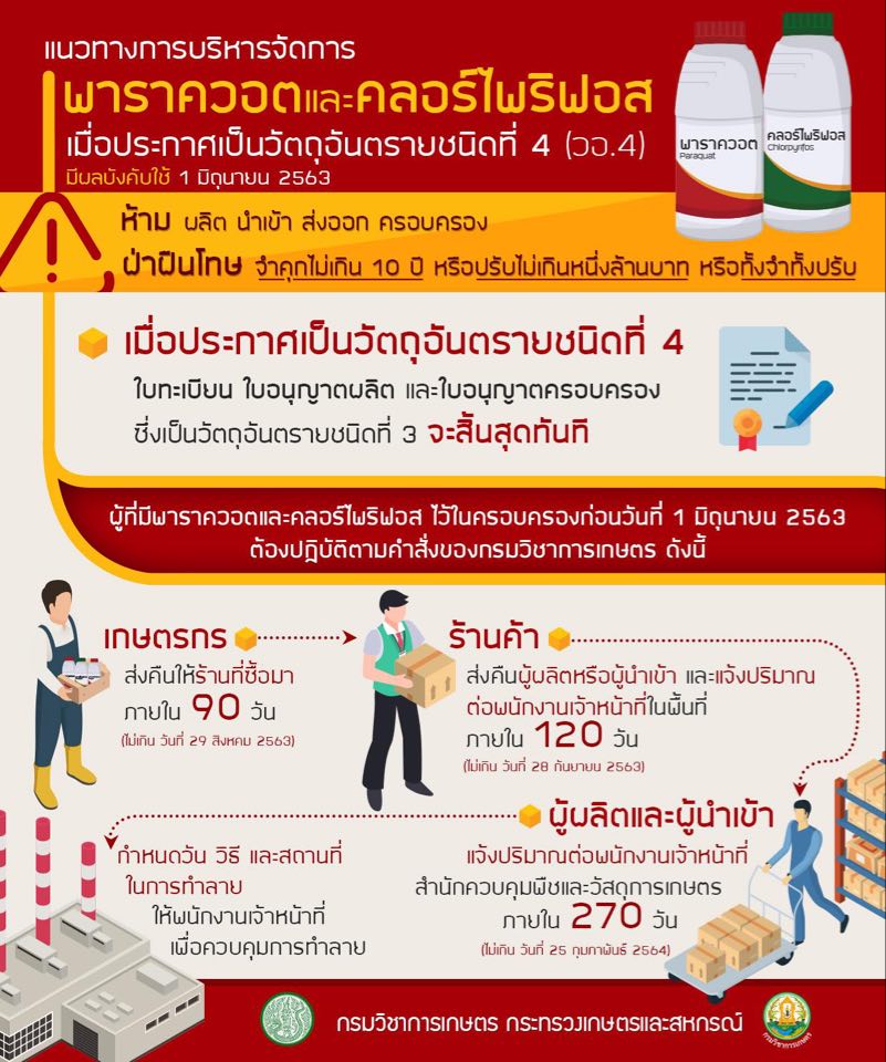 แนวทางการบริหารจัดการพาราควอตและคลอร์ไพริฟอสเมื่อประกาศเป็นวัตถุอันตรายชนิดที่4(วอ.4) Posted on 2563-06-052020-06-05