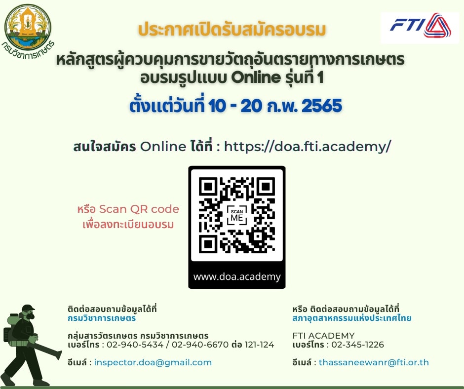 ประกาศรับสมัครผู้สนใจอบรมหลักสูตร “ผู้ควบคุมการวัตถุอันตรายทางการเกษตร” ปี 2565 Posted on 2565-02-112022-02-11 แบบออนไลน์ (Online) รุ่นที่ 1 เปิดรับสมัคร วันที่ 11-20 กุมภาพันธ์ 2565 สมัครตรงนี้ >>>> https://doa.fti.academy/auth/apply สอบถามขั้นตอนการสมัครและการชำระเงิน โทร. 02-3451226 สอบถามรายละเอียดและเนื้อหาการอบรม โทร. 02-9405434