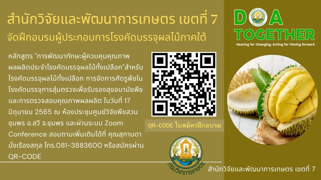 รับสมัคร ผู้ประกอบการโรงคัดบรรจุผลไม้ภาคใต้ อบรมหลักสูตรการพัฒนาทักษะผู้ควบคุมคุณภาพผลผลิตประจำ โรงคัดบรรจุผลไม้ทั้งเปลือก Posted on 2565-06-012022-06-01