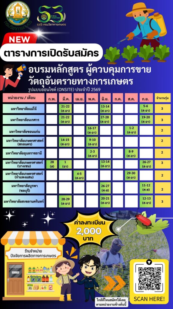 แผนการอบรมหลักสูตร ผู้ควบคุมการขายวัตถุอันตรายทางการเกษตร ปี 2569 Posted on 2569-01-212026-01-21 สอบถามรายละเอียดเพิ่มเติม ได้ที่ 1453 กด 12 หรือ แสกนคิวอาร์โค้ดด้านล่าง