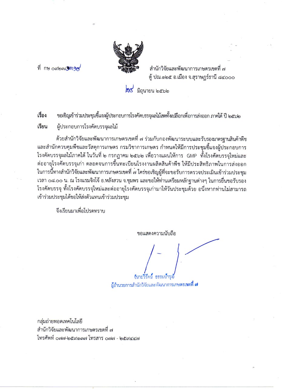 ประชุมชี้แจงผู้ประกอบการโรงคัดบรรจุผลไม้สดทั้งเปลือกเพื่อการส่งออกภาคใต้ปี62 Posted on 2562-06-252019-07-08 x ประชุมชี้แจงผู้ประกอบการโรงคัดบรรจุผลไม้สดทั้งเปลือกเพื่อการส่งออกภาคใต้ปี62 สอบถามรายละเอียดเพิ่มเติมได้ที่ กลุ่มถ่ายทอดเทคโนโลยี โทร 077-259137