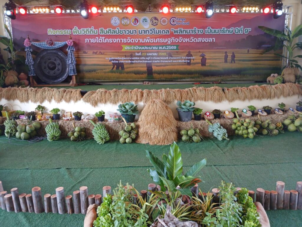 วันที่ 23 เมษายน 2569 นายไพศอล หะยีสาและ ผู้อำนวยการสำนักงานวิจัยและพัฒนาการเกษตรเขตที่ 8 พร้อมด้วยนายระพีพัฒน์ ชะนีทอง ผู้อำนวยการกลุ่มจัดการพื้นที่ สวพ.8 ,นางสาวพรทิพย์ แย้มสุวรรณ หัวหน้าด่านตรวจพืชบ้านประกอบ และเจ้าหน้าที่จากศูนย์วิจัยและพัฒนาการเกษตรสงขลาเข้าร่วมจัดนิทรรศการและร่วมพิธีเปิดงานกิจกรรม ฟื้นวิถีถิ่น สืบศิลป์ชาวนา นาทวีโมเดล “พลิกนาร้าง เป็นนารักษ์ ปีที่ 9” โดยภายในงานได้มีกิจกรรมให้ความรู้และแจกจ่ายจุลินทรีย์สลายตอซังข้าว,ปุ๋ยชีวภาพพีจีพีอาร์2 และเชื้อไตรโคเดอร์ม่า เพื่อให้เกษตรกรลดต้นทุนในการผลิตข้าว นอกจากนี้ยังได้มีการแจกผลไม้สดพร้อมทานอีกด้วย ณ ศูนย์การเรียนรู้พระอาจารย์ภัตร อริโย หมู่ที่ 3 ตำบลนาหมอศรี อำเภอนาทวี จังหวัดสงขลา