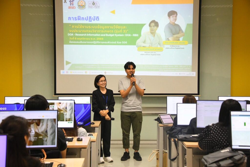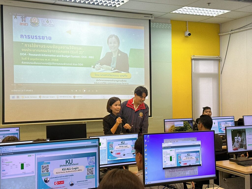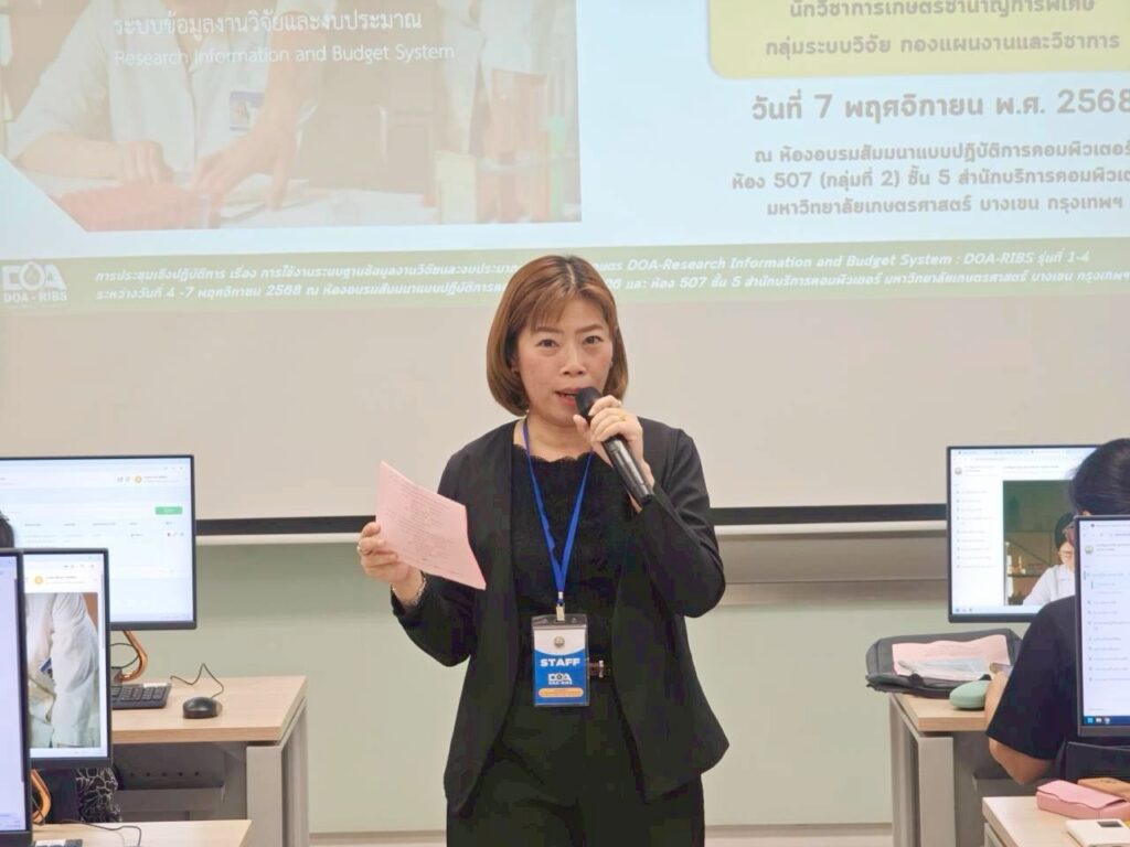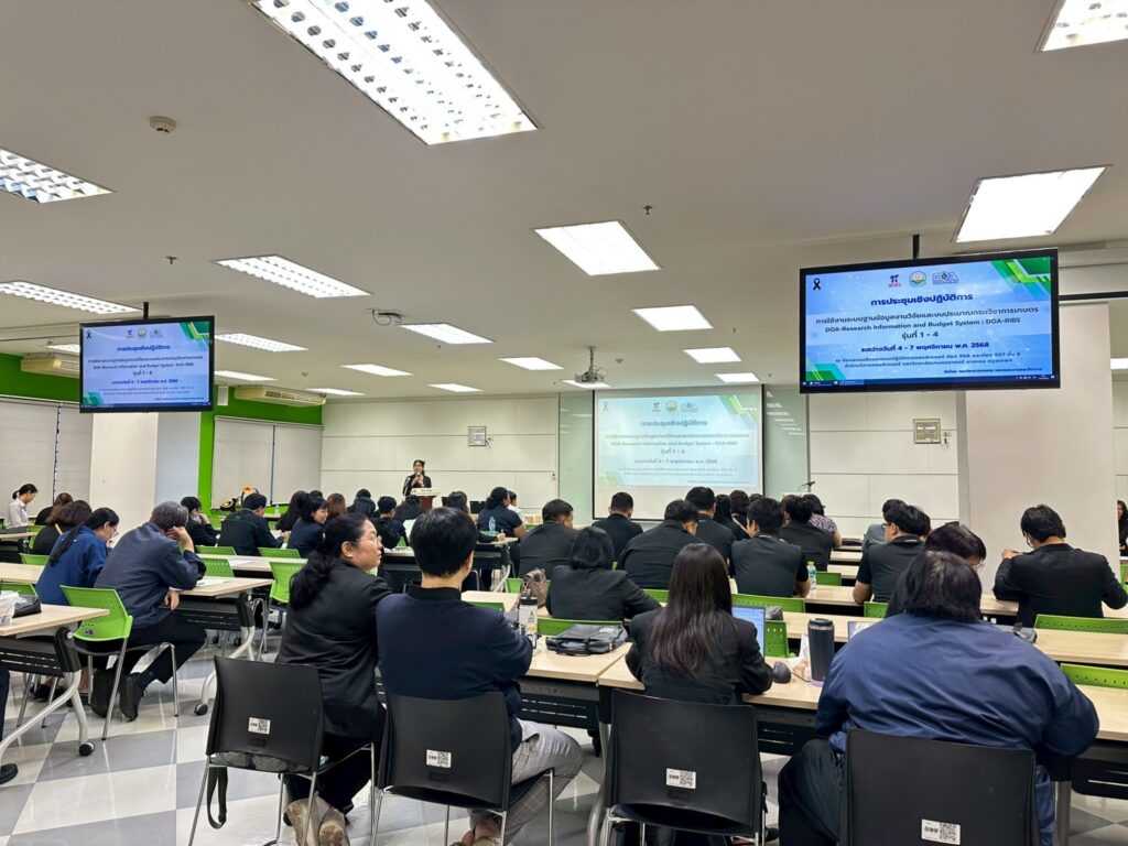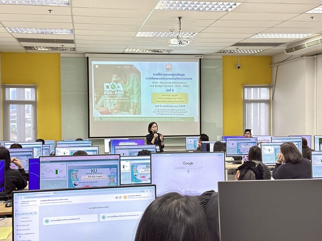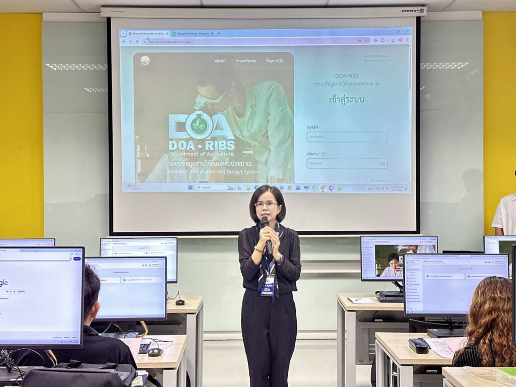 วันศุกร์ที่ 7 พฤศจิกายน 2568 นายรพีภัทร์ จันทรศรีวงศ์ อธิบดีกรมวิชาการเกษตร ได้มอบหมายให้ กองแผนงานและวิชาการ จัดการประชุมเชิงปฏิบัติการ เรื่อง การใช้งานระบบฐานข้อมูลงานวิจัยและงบประมาณ กรมวิชาการเกษตร DOA-Research Information and Budget System : DOA-RIBS รุ่นที่ 4 (กำหนดจัด 4 รุ่น ๆ ละ 1 วัน ระหว่างวันที่ 4 – 7 พฤศจิกายน 2568) ณ ห้องอบรมสัมมนาแบบปฏิบัติการคอมพิวเตอร์ ห้อง 506 และห้อง 507 ชั้น 5 สำนักบริการคอมพิวเตอร์ มหาวิทยาลัยเกษตรศาสตร์ บางเขน กรุงเทพมหานคร มีวัตถุประสงค์เพื่อให้ผู้เข้าร่วม จำนวน 110 คน ประกอบด้วย ผู้อำนวยการแผนงานวิจัย หัวหน้าโครงการวิจัย นักวิจัย ผู้ประสานงานระดับกรมและระดับหน่วยงาน เจ้าหน้าที่การเงิน เจ้าหน้าที่รายงานการวิจัย และผู้เกี่ยวข้อง จาก สถาบันวิจัยพืชไร่และพืชทดแทนพลังงาน สำนักวิจัยพัฒนาการอารักขาพืช กองวิจัยพัฒนาปัจจัยการผลิตทางการเกษตร กองวิจัยพัฒนาพืชเศรษฐกิจใหม่และการจัดการก๊าซเรือนกระจกสำหรับภาคเกษตร กองแผนงานและวิชาการ ได้เรียนรู้และฝึกปฏิบัติการใช้งานระบบ DOA-RIBS ซึ่งเป็นระบบฐานข้อมูลและเครื่องมือบริหารจัดการงบประมาณสนับสนุนการดำเนินงานมูลฐาน (Fundamental Fund : FF) ของกรมวิชาการเกษตร ที่ได้รับงบประมาณสนับสนุนจาก กองทุนส่งเสริมวิทยาศาสตร์ วิจัยและนวัตกรรม (กองทุน ววน.) สำนักงานคณะกรรมการส่งเสริมวิทยาศาสตร์ วิจัยและนวัตกรรม (สกสว.)