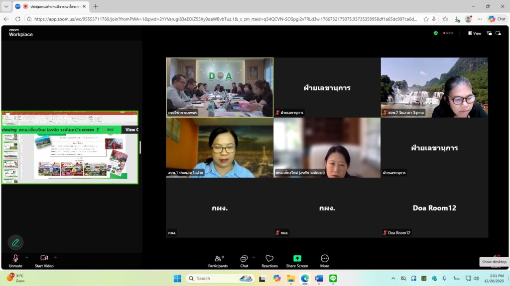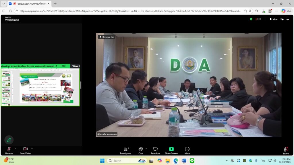 วันที่ 29 ธันวาคม 2568 นายรพีภัทร์ จันทรศรีวงศ์ อธิบดีกรมวิชาการเกษตร ได้มอบหมาย นายสุริพัฒน์ ไทยเทศ ผู้เชี่ยวชาญด้านปรับปรุงพันธุ์พืชไร่ รักษาการในตำแหน่ง ผู้อำนวยการสำนักผู้เชี่ยวชาญ เป็นประธานการประชุมคณะทำงานพิจารณาโครงการวิจัยด้านการเกษตร ครั้งที่ 2/2568 (ตามคำสั่งคณะกรรมการบริหารการดำเนินงานวิจัยด้านการเกษตร ที่ 1/2568 ลงวันที่ 20 พฤศจิกายน พ.ศ. 2568) ณ ห้องประชุมผู้บริหาร ชั้น 2 อาคารศูนย์ปฏิบัติการฝึกอบรมและถ่ายทอดเทคโนโลยี กรมวิชาการเกษตร เพื่อรับทราบสรุปผลการดำเนินงานที่เกี่ยวข้องกับเงินรายได้การดำเนินงานวิจัยด้านการเกษตร และร่วมกันพิจารณากลั่นกรองข้อเสนอโครงการวิจัยที่หน่วยงานเสนอขอรับสนับสนุนการวิจัยจากเงินรายได้การดำเนินงานวิจัยด้านการเกษตร ในประเด็นการพัฒนาต้นแบบศูนย์ท่องเที่ยวเชิงอนุรักษ์ด้านการเกษตร “การท่องเที่ยวคาร์บอนต่ำ” การขยายผลการผลิตการใช้หัวเชื้อจุลินทรีย์ย่อยสลายวัสดุอินทรีย์ของกรมวิชาการเกษตรเพื่อย่อยสลายตอซังฟางข้าว และวัสดุอินทรีย์อื่นในพื้นที่เกษตร และการขยายผลการผลิตต้นกล้าชา Camellia sinensis “Chiang Mai 1” (DOA) เพื่อพัฒนาอุตสาหกรรมชาภาคเหนือ ตามหลักเกณฑ์และเงื่อนไขของเงินรายได้การดำเนินงานวิจัยด้านการเกษตร กรมวิชาการเกษตร