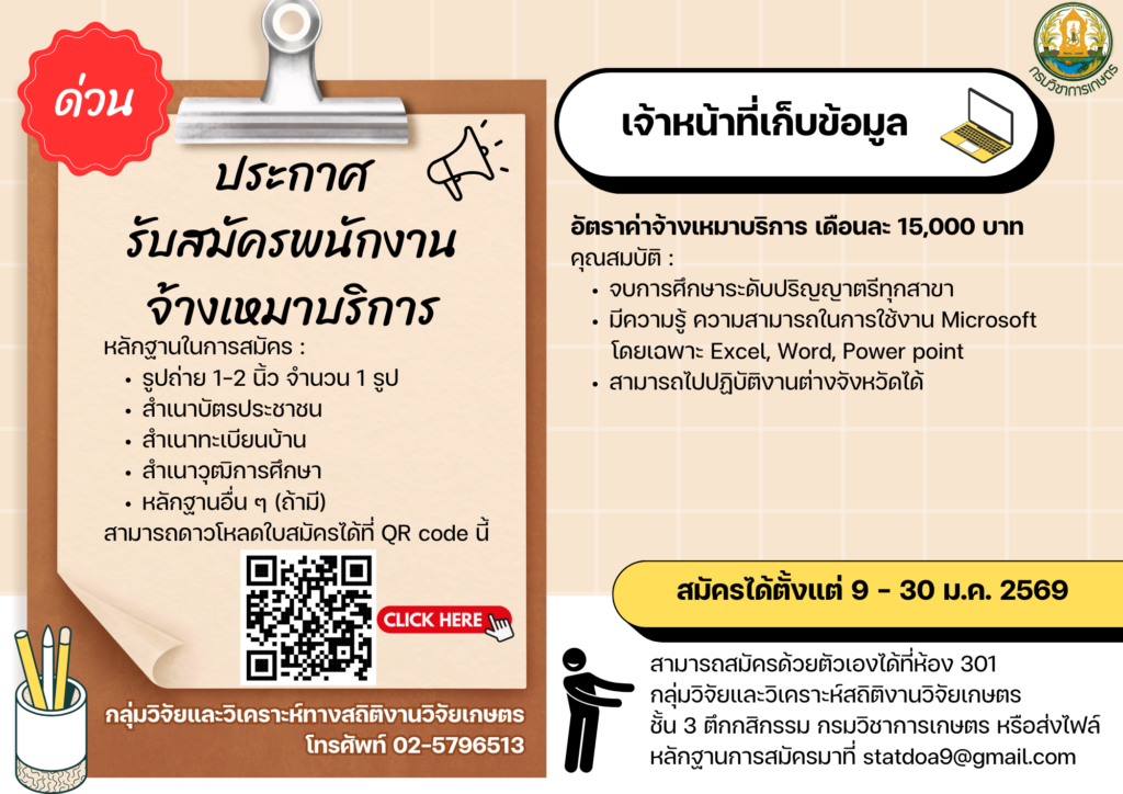 Posted on 10/02/256610/02/2023 by กลุ่มระบบวิจัย รับสมัครคัดเลือกเพื่อบรรจุและแต่งตั้งบุคคลเป็นลูกจ้างชั่วคราวรายเดือน จากเงินนอกงบประมาณประเภทเงินรายได้ ตำแหน่งนักวิชาการเกษตรDownload