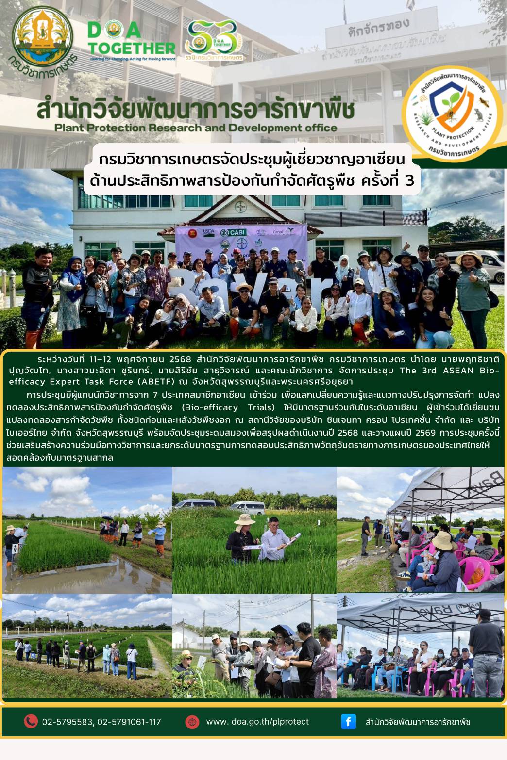 ระหว่างวันที่ 11-12 พฤศจิกายน 2568 นายพฤทธิชาติ ปุญวัฒโท นางสาวมะลิดา ชูรินทร์ นายสิริชัย สาธุวิจารณ์ และนักวิชาการของสำนักวิจัยพัฒนาการอารักขาพืช ร่วมจัดการประชุม The 3rd ASEAN Bio-efficacy Expert Task Force (ABETF) ณ จังหวัดสุพรรณบุรีและพระนครศรีอยุธยา ร่วมกับตัวแทนนักวิชาการจาก 7 ประเทศในเอเชีย เพื่อแลกเปลี่ยนและปรับปรุงข้อมูลการจัดทำแปลงทดลองประสิทธิภาพสารป้องกันกำจัดศัตรูพืชของอาเซียน โดยมีการทัศนศึกษาแปลงทดลองประสิทธิภาพสารกำจัดวัชพืชประเภทก่อนวัชพืชงอกและหลังวัชพืชงอกระหว่างแปลงทดลองประสิทธิภาพสารป้องกันกำจัดศัตรูพืชของกรมวิชาการเกษตรกับแปลงทดลองประสิทธิภาพสารป้องกันกำจัดศัตรูพืชของอาเซียนที่สำนักวิจัยพัฒนาการอารักขาพืชได้การสนัสสนุนให้จัดทำ ณ สถานีวิจัยของ บริษัท ซินเจนทา ครอป โปรเทคชั่น จำกัด และบริษัท ไบเออร์ไทย จำกัด ณ อำเภอศรีประจัน จังหวัดสุพรรณบุรี และมีการประชุมระดมสมองเพื่อสรุปผลการดำเนินงานปี 2568 และแผนการดำเนินงานปี 2569 ซึ่งเป็นแนวทางที่ประโยชน์ต่อการปรับปรุงเพื่อประสิทธิภาพการทำแปลงทดลองประสิทธิภาพวัตถุอันตรายทางการเกษตรเพื่อการขึ้นทะเบียนของประเทศไทยต่อไป