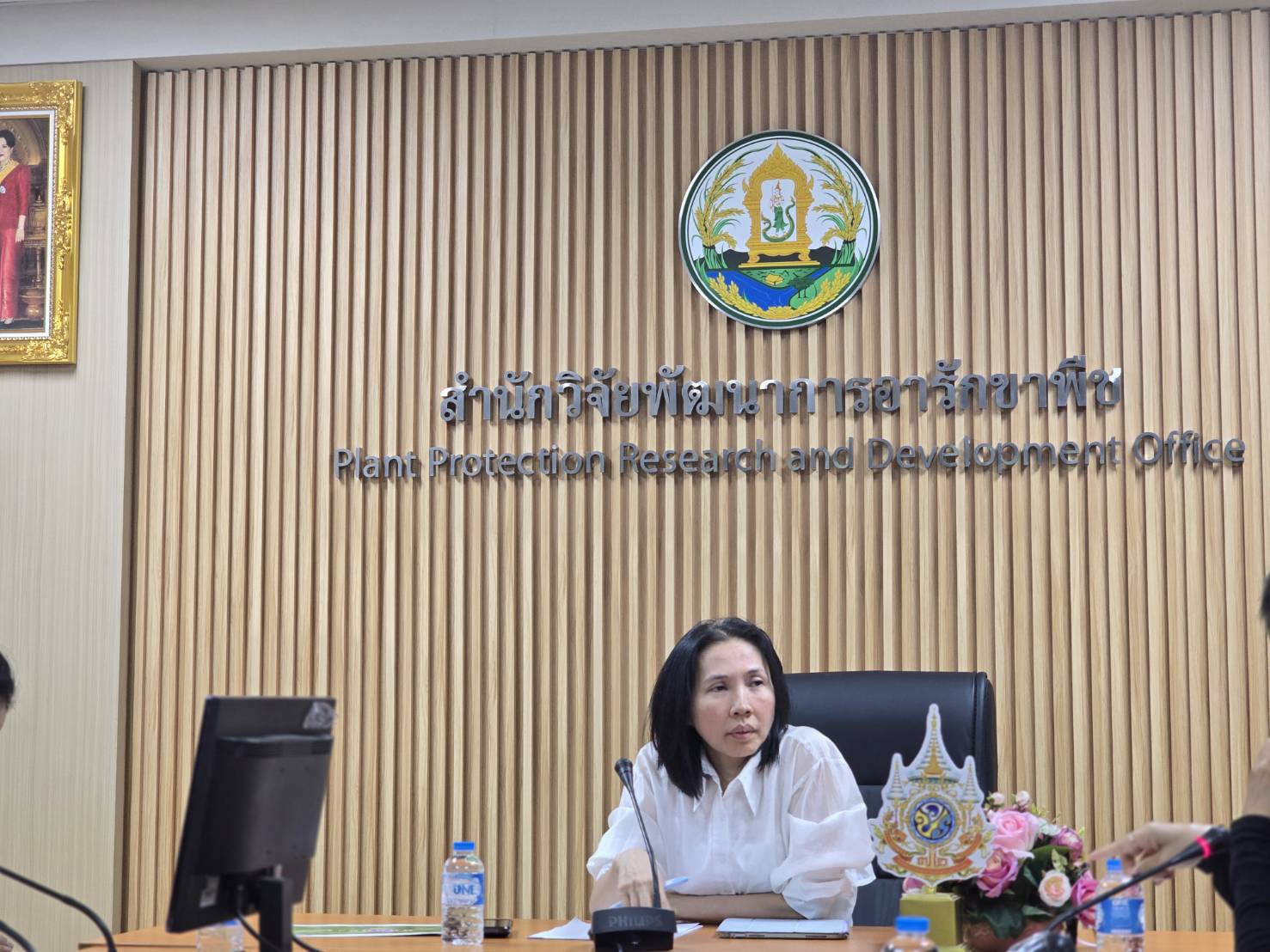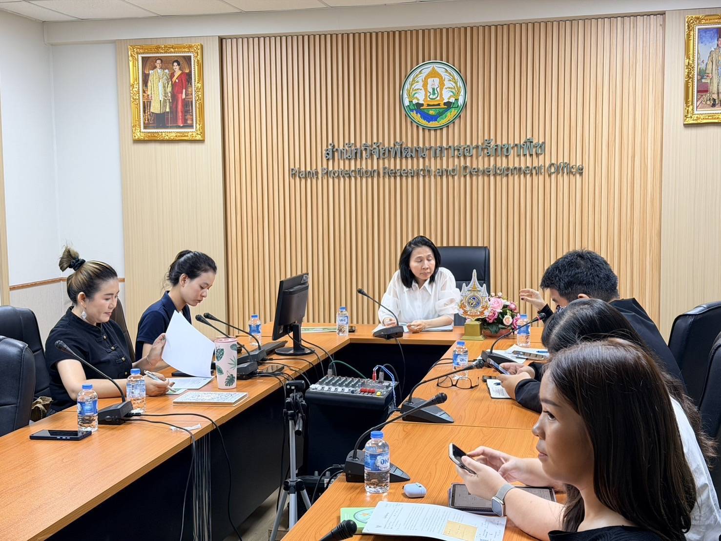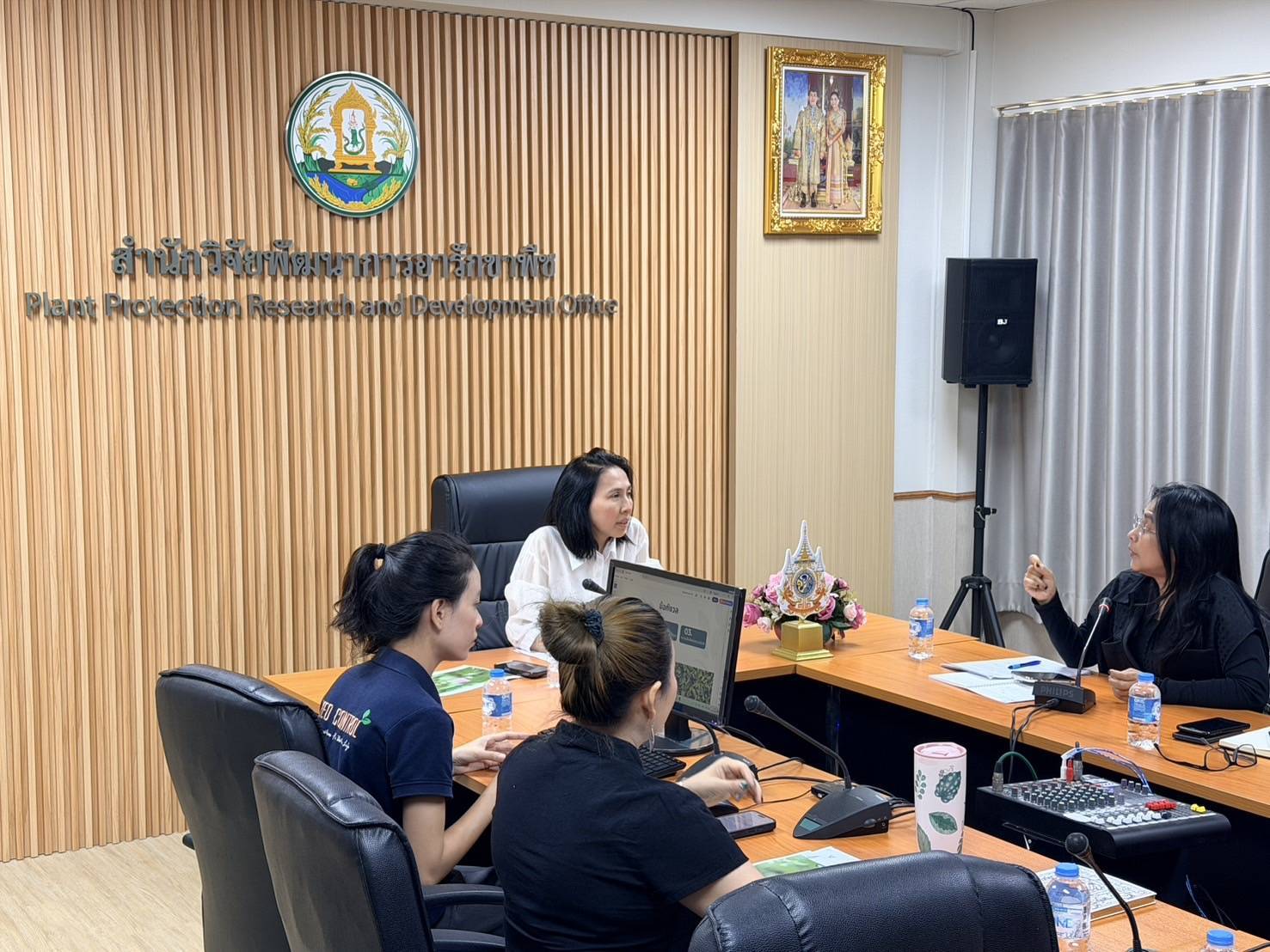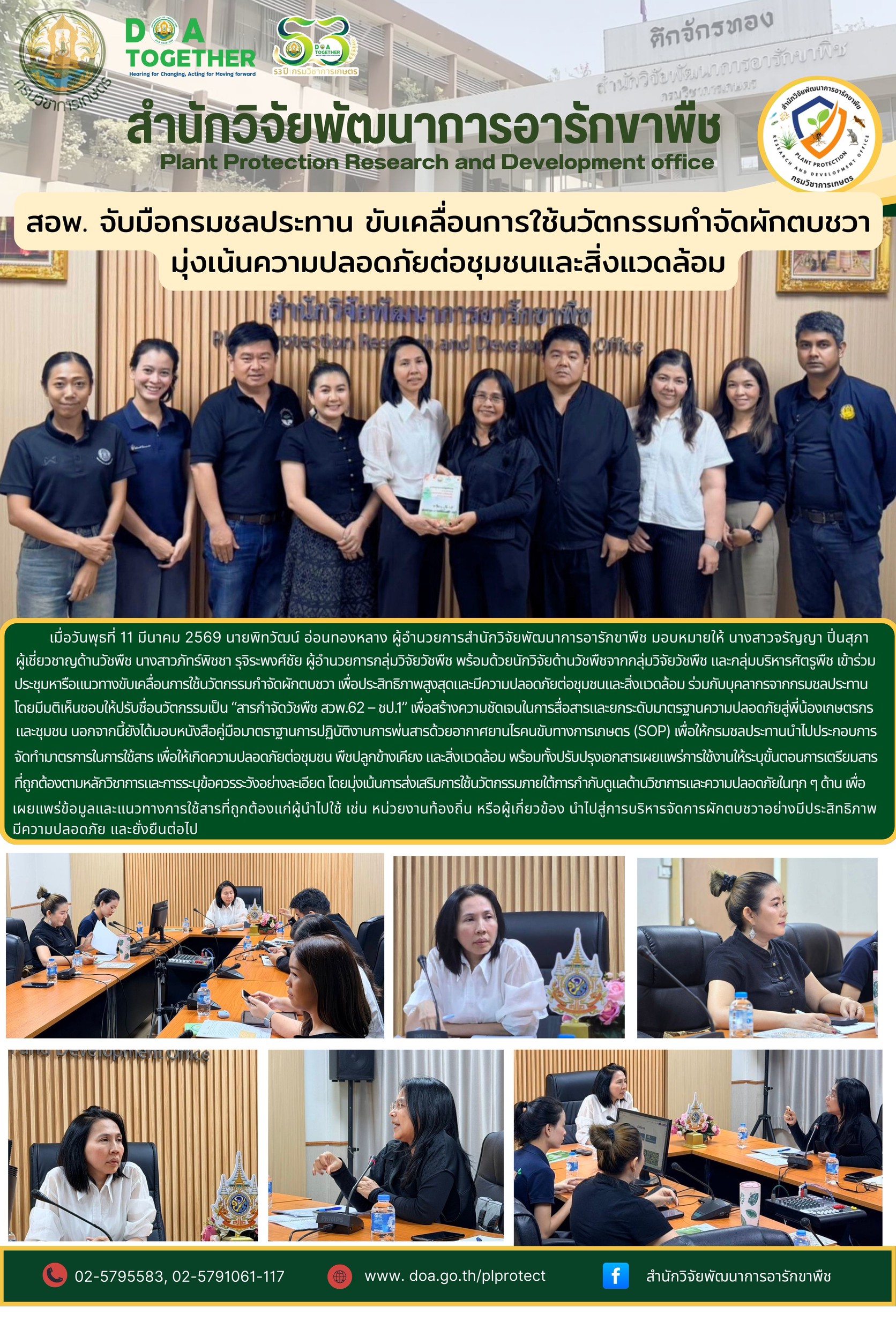 เมื่อวันพุธที่ 11 มีนาคม 2569 นายพิทวัฒน์ อ่อนทองหลาง ผู้อำนวยการสำนักวิจัยพัฒนาการอารักขาพืช มอบหมายให้ นางสาวจรัญญา ปิ่นสุภา ผู้เชี่ยวชาญด้านวัชพืช นางสาวภัทร์พิชชา รุจิระพงศ์ชัย ผู้อำนวยการกลุ่มวิจัยวัชพืช พร้อมด้วยนักวิจัยด้านวัชพืชจากกลุ่มวิจัยวัชพืช และกลุ่มบริหารศัตรูพืช เข้าร่วมประชุมหารือแนวทางขับเคลื่อนการใช้นวัตกรรมกำจัดผักตบชวา เพื่อประสิทธิภาพสูงสุดและมีความปลอดภัยต่อชุมชนและสิ่งแวดล้อม ร่วมกับบุคลากรจากกรมชลประทาน โดยมีมติเห็นชอบให้ปรับชื่อนวัตกรรมเป็น “สารกำจัดวัชพืช สวพ.62 – ชป.1” เพื่อสร้างความชัดเจนในการสื่อสารและยกระดับมาตรฐานความปลอดภัยสู่พี่น้องเกษตรกร และชุมชน นอกจากนี้ยังได้มอบหนังสือคู่มือมาตราฐานการปฏิบัติงานการพ่นสารด้วยอากาศยานไรคนขับทางการเกษตร (SOP) เพื่อให้กรมชลประทานนำไปประกอบการจัดทำมาตรการในการใช้สาร เพื่อให้เกิดความปลอดภัยต่อชุมชน พืชปลูกข้างเคียง และสิ่งแวดล้อม พร้อมทั้งปรับปรุงเอกสารเผยแพร่การใช้งานให้ระบุขั้นตอนการเตรียมสารที่ถูกต้องตามหลักวิชาการและการระบุข้อควรระวังอย่างละเอียด โดยมุ่งเน้นการส่งเสริมการใช้นวัตกรรมภายใต้การกำกับดูแลด้านวิชาการและความปลอดภัยในทุก ๆ ด้าน เพื่อเผยแพร่ข้อมูลและแนวทางการใช้สารที่ถูกต้องแก่ผู้นำไปใช้ เช่น หน่วยงานท้องถิ่น หรือผู้เกี่ยวข้อง นำไปสู่การบริหารจัดการผักตบชวาอย่างมีประสิทธิภาพ