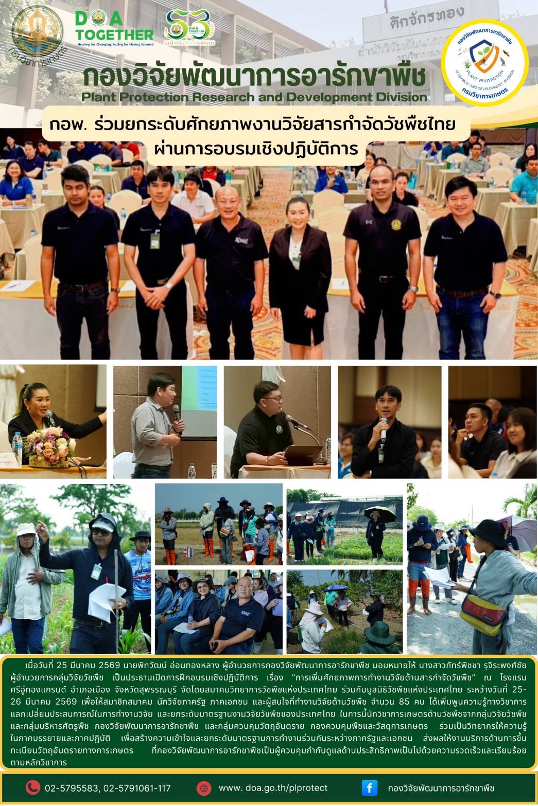 เมื่อวันที่ 25 มีนาคม 2569 นายพิทวัฒน์ อ่อนทองหลาง ผู้อำนวยการกองวิจัยพัฒนาการอารักขาพืช มอบหมายให้ นางสาวภัทร์พิชชา รุจิระพงศ์ชัย ผู้อำนวยการกลุ่มวิจัยวัชพืช เป็นประธานเปิดการฝึกอบรมเชิงปฏิบัติการ เรื่อง “การเพิ่มศักยภาพการทำงานวิจัยด้านสารกำจัดวัชพืช” ณ โรงแรมศรีอู่ทองแกรนด์ อำเภอเมือง จังหวัดสุพรรณบุรี จัดโดยสมาคมวิทยาการวัชพืชแห่งประเทศไทย ร่วมกับมูลนิธิวัชพืชแห่งประเทศไทย ระหว่างวันที่ 25-26 มีนาคม 2569 เพื่อให้สมาชิกสมาคม นักวิจัยภาครัฐ ภาคเอกชน และผู้สนใจที่ทำงานวิจัยด้านวัชพืช จำนวน 85 คน ได้เพิ่มพูนความรู้ทางวิชาการ แลกเปลี่ยนประสบการณ์ในการทำงานวิจัย และยกระดับมาตรฐานงานวิจัยวัชพืชของประเทศไทย ในการนี้นักวิชาการเกษตรด้านวัชพืชจากกลุ่มวิจัยวัชพืช และกลุ่มบริหารศัตรูพืช กองวิจัยพัฒนาการอารักขาพืช และกลุ่มควบคุมวัตถุอันตราย กองควบคุมพืชและวัสดุการเกษตรในภาคบรรยายและภาคปฏิบัติ เพื่อสร้างความเข้าใจและยกระดับมาตรฐานการทำงานร่วมกันระหว่างภาครัฐและเอกชน ส่งผลให้งานบริการด้านการขึ้นทะเบียนวัตถุอันตรายทางการเกษตร ที่กองวิจัยพัฒนาการอารักขาพืชเป็นผู้ควบคุมกำกับดูแลด้านประสิทธิภาพเป็นไปด้วยความรวดเร็วและเรียบร้อย ตามหลักวิชาการ