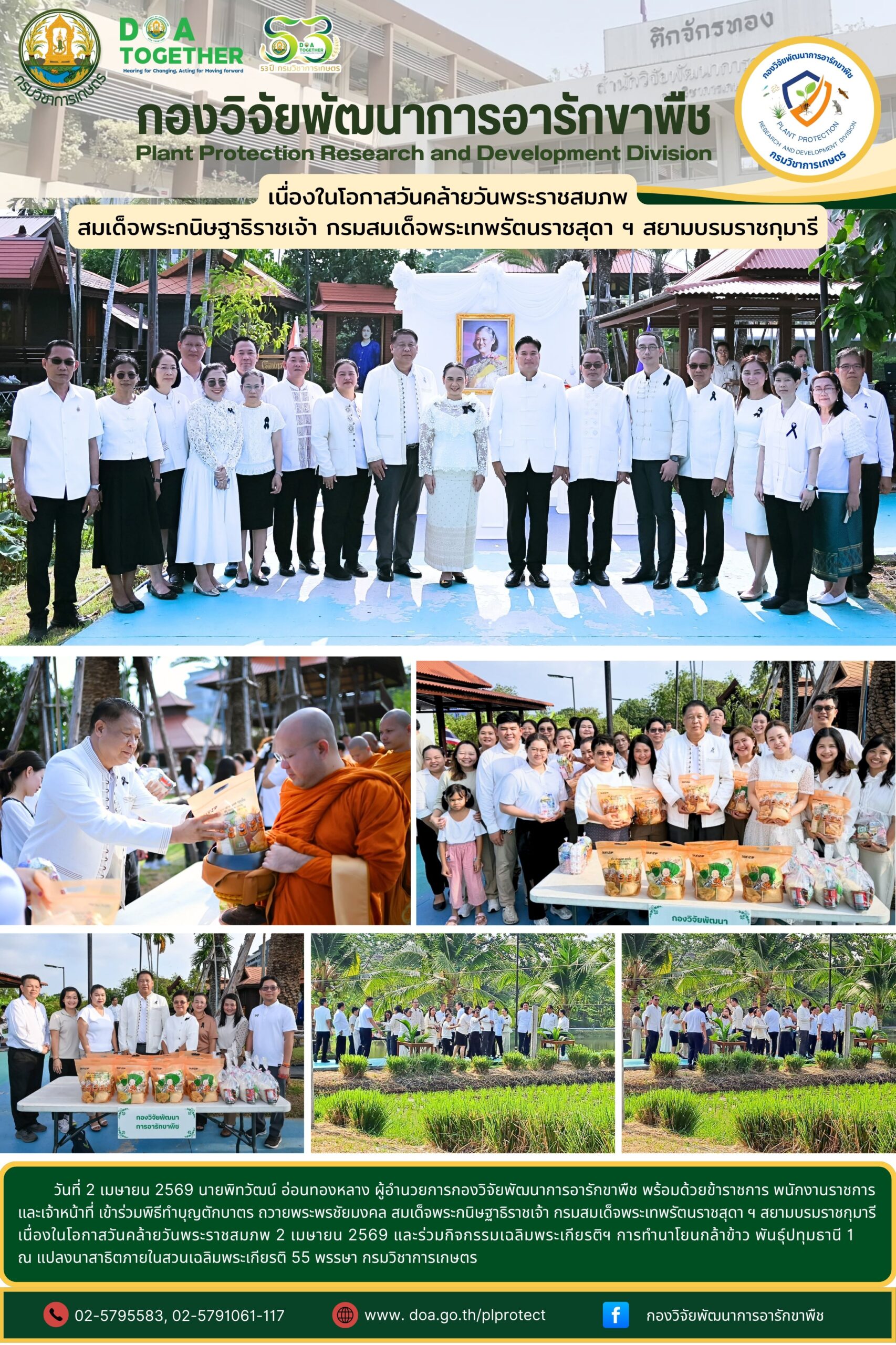 วันที่ 2 เมษายน 2569 นายพิทวัฒน์ อ่อนทองหลาง ผู้อำนวยการกองวิจัยพัฒนาการอารักขาพืช พร้อมด้วยข้าราชการ พนักงานราชการ และเจ้าหน้าที่ เข้าร่วมพิธีทำบุญตักบาตร ถวายพระพรชัยมงคล สมเด็จพระกนิษฐาธิราชเจ้า กรมสมเด็จพระเทพรัตนราชสุดา ฯ สยามบรมราชกุมารี เนื่องในโอกาสวันคล้ายวันพระราชสมภพ 2 เมษายน 2569 และร่วมกิจกรรมเฉลิมพระเกียรติฯ การทำนาโยนกล้าข้าว พันธุ์ปทุมธานี 1 ณ แปลงนาสาธิตภายในสวนเฉลิมพระเกียรติ 55 พรรษา กรมวิชาการเกษตร
