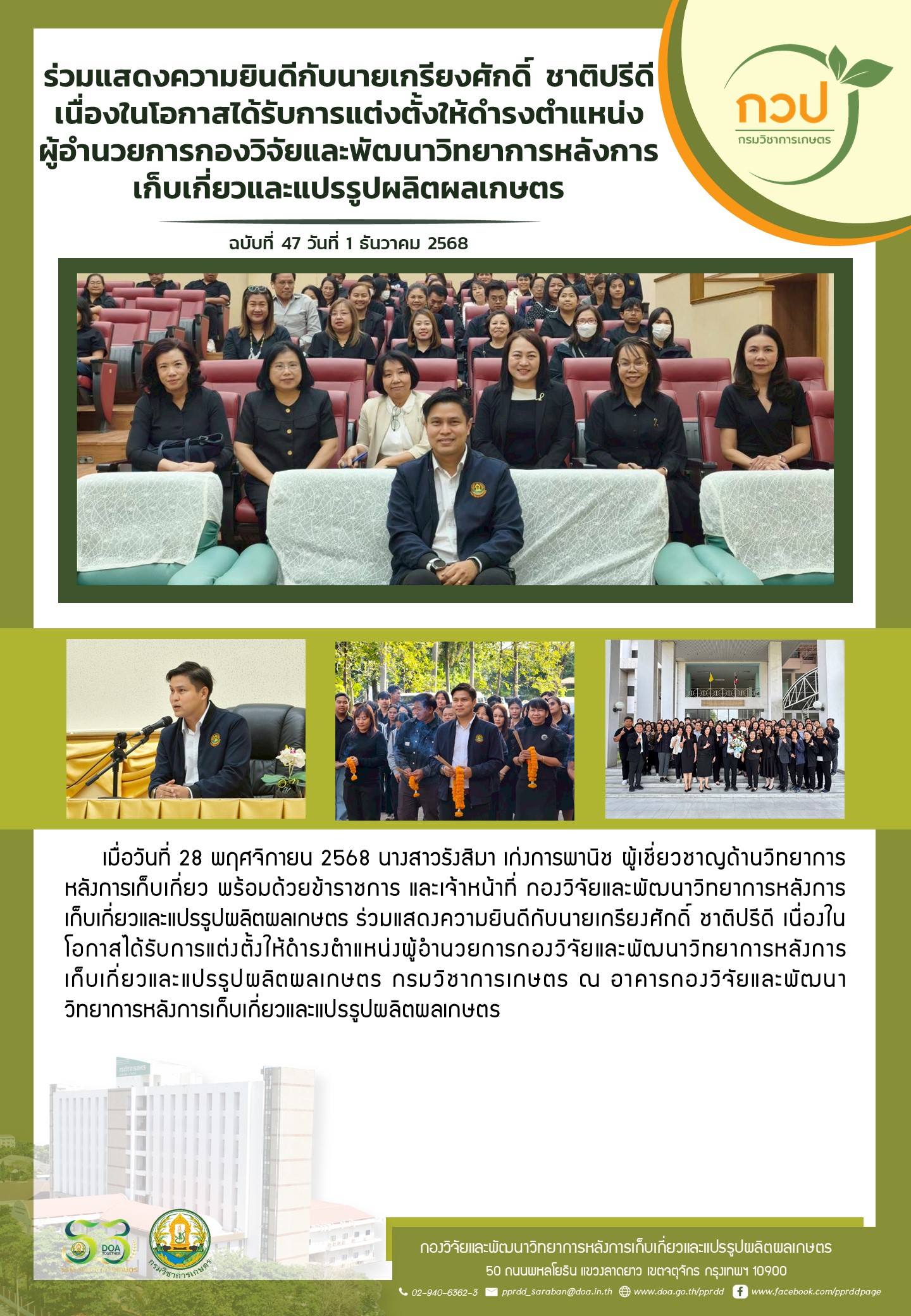 กิจกรรม กวป. ร่วมแสดงความยินดีกับนายเกรียงศักดิ์ ชาติปรีดี เนื่องในโอกาสได้รับการแต่งตั้งให้ดำรงตำแหน่งผู้อำนวยการกองวิจัยและพัฒนาวิทยาการหลังการเก็บเกี่ยวและแปรรูปผลิตผลเกษตร 1 ธันวาคม 2568 pprddadmin
