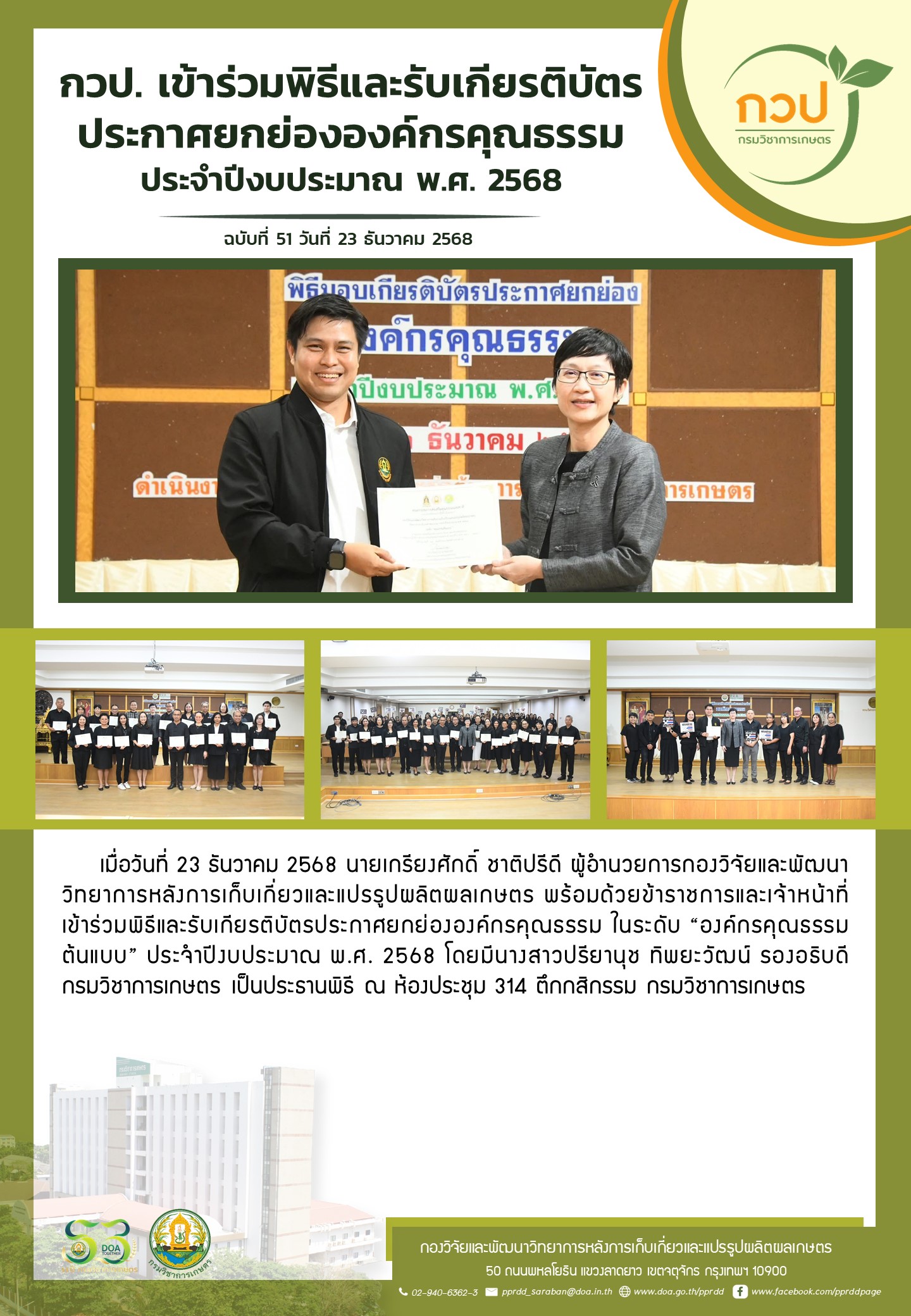 กิจกรรม กวป. กวป. เข้าร่วมพิธีและรับเกียรติบัตรประกาศยกย่ององค์กรคุณธรรม ประจำปีงบประมาณ พ.ศ. 2568 24 ธันวาคม 2568 pprddadmin