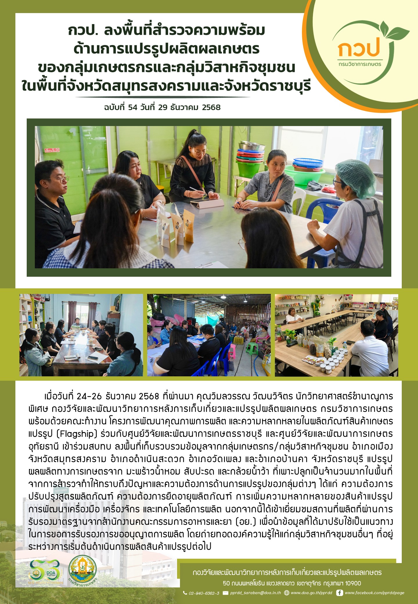 กิจกรรม กวป. กวป. ลงพื้นที่สำรวจความพร้อมด้านการแปรรูปผลิตผลเกษตรของกลุ่มเกษตรกรและกลุ่มวิสาหกิจชุมชนในพื้นที่จังหวัดสมุทรสงครามและจังหวัดราชบุรี 29 ธันวาคม 2568 pprddadmin