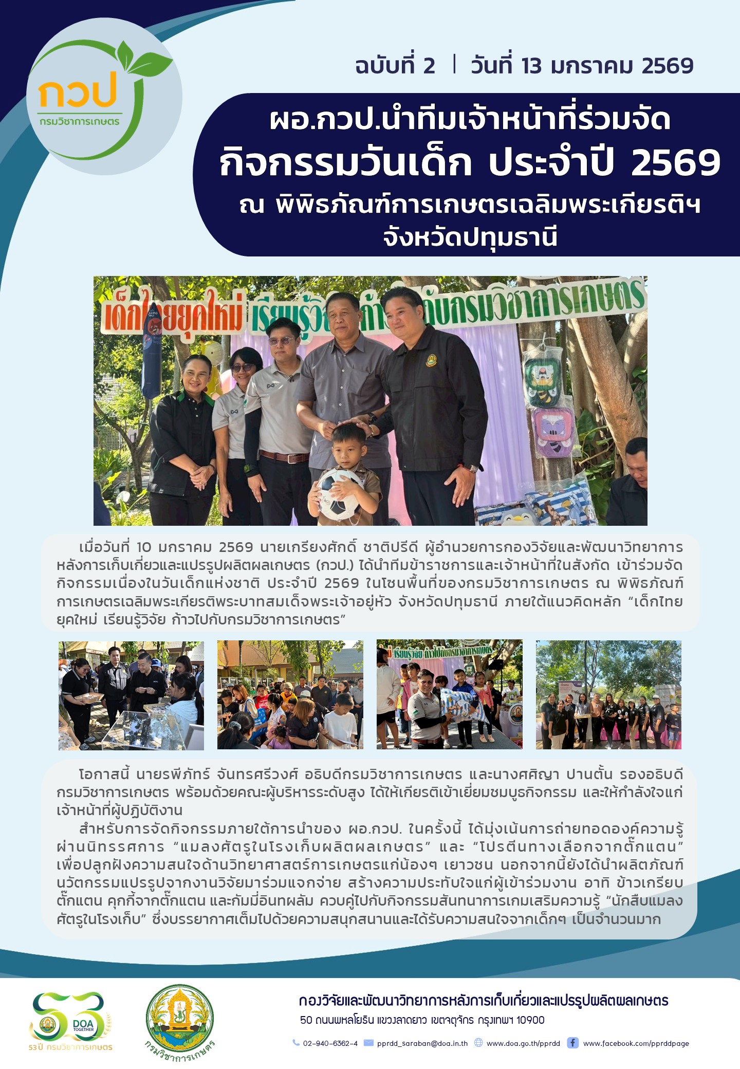 กิจกรรม กวป. ผอ.กวป. นำทีมเจ้าหน้าที่ร่วมจัดกิจกรรมวันเด็ก ณ พิพิธภัณฑ์การเกษตรเฉลิมพระเกียรติฯ จังหวัดปทุมธานี 13 มกราคม 2569 pprddadmin
