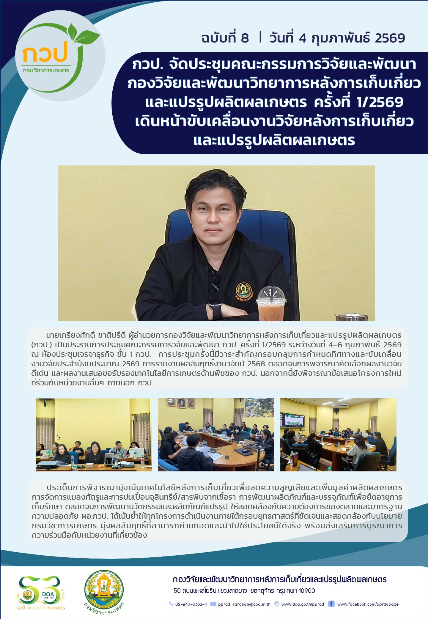 กิจกรรม กวป. กวป. จัดประชุมคณะกรรมการวิจัยและพัฒนากองวิจัยและพัฒนาวิทยาการหลังการเก็บเกี่ยวและแปรรูปผลิตผลเกษตร ครั้งที่ 1/2569 เดินหน้าขับเคลื่อนงานวิจัยหลังการเก็บเกี่ยวและแปรรูปผลิตผลเกษตร 6 กุมภาพันธ์ 2569 pprddadmin