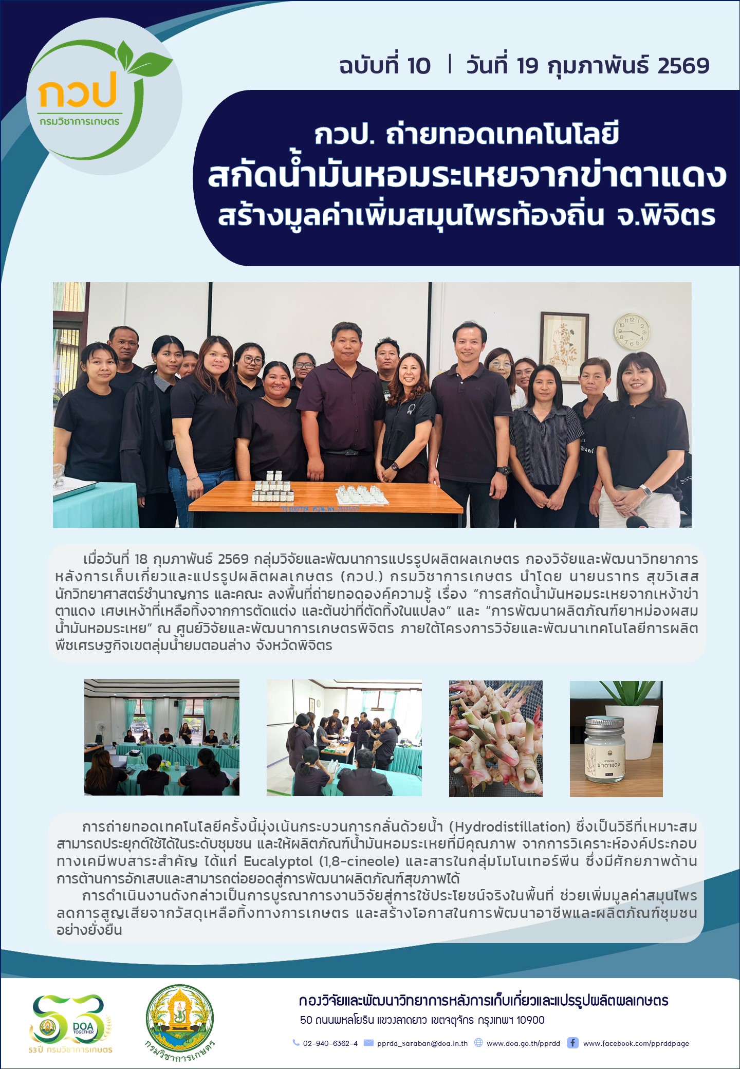 กิจกรรม กวป. กวป. ถ่ายทอดเทคโนโลยีสกัดน้ำมันหอมระเหยจากข่าตาแดง สร้างมูลค่าเพิ่มสมุนไพรท้องถิ่น จ.พิจิตร 20 กุมภาพันธ์ 2569 pprddadmin