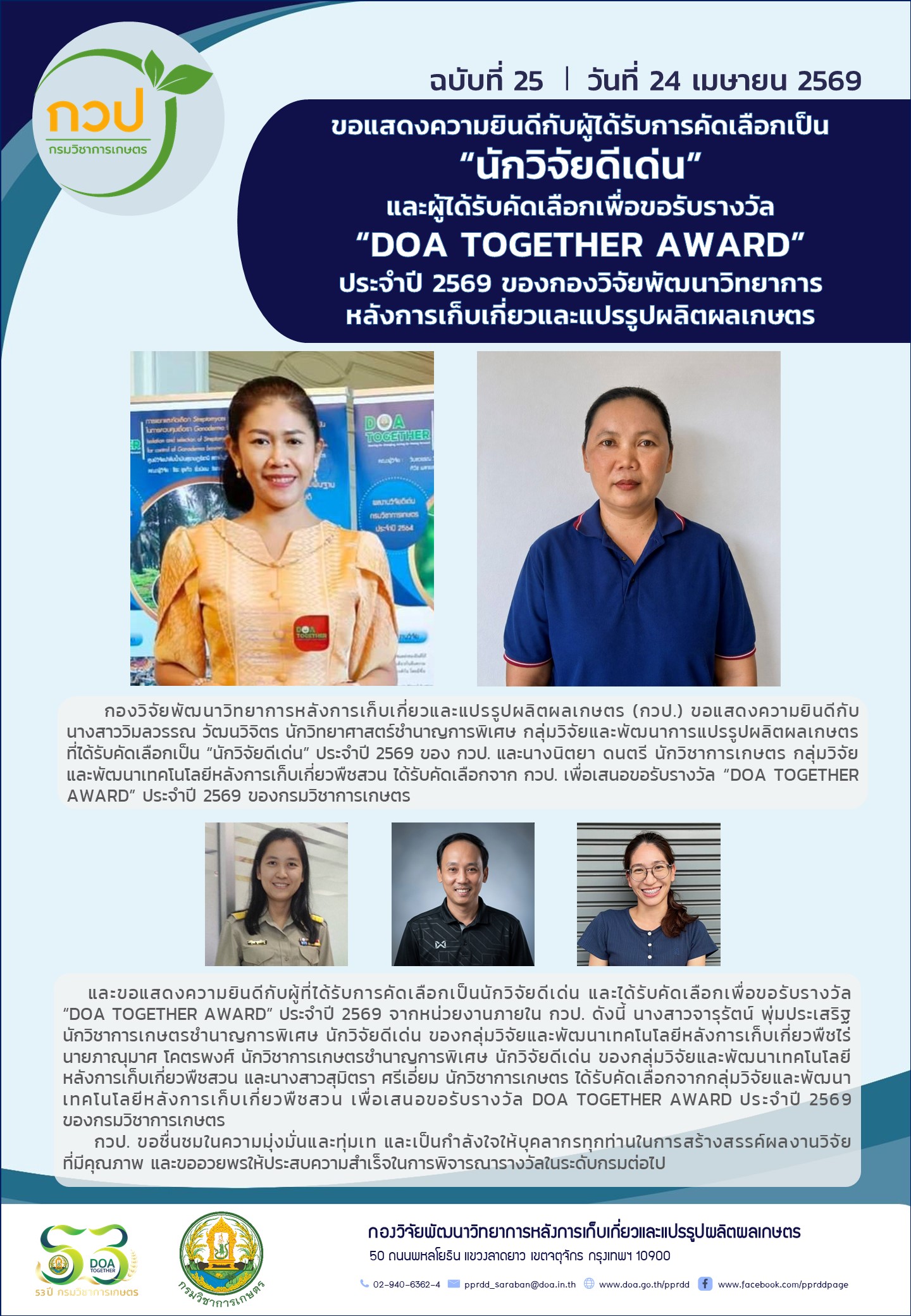 กิจกรรม กวป. ขอแสดงความยินดีกับผู้ได้รับการคัดเลือกเป็น “นักวิจัยดีเด่น” และผู้ได้รับคัดเลือกเพื่อขอรับรางวัล “DOA TOGETHER AWARD” ประจำปี 2569 ของกองวิจัยพัฒนาวิทยาการหลังการเก็บเกี่ยวและแปรรูปผลิตผลเกษตร 24 เมษายน 2569 pprddadmin