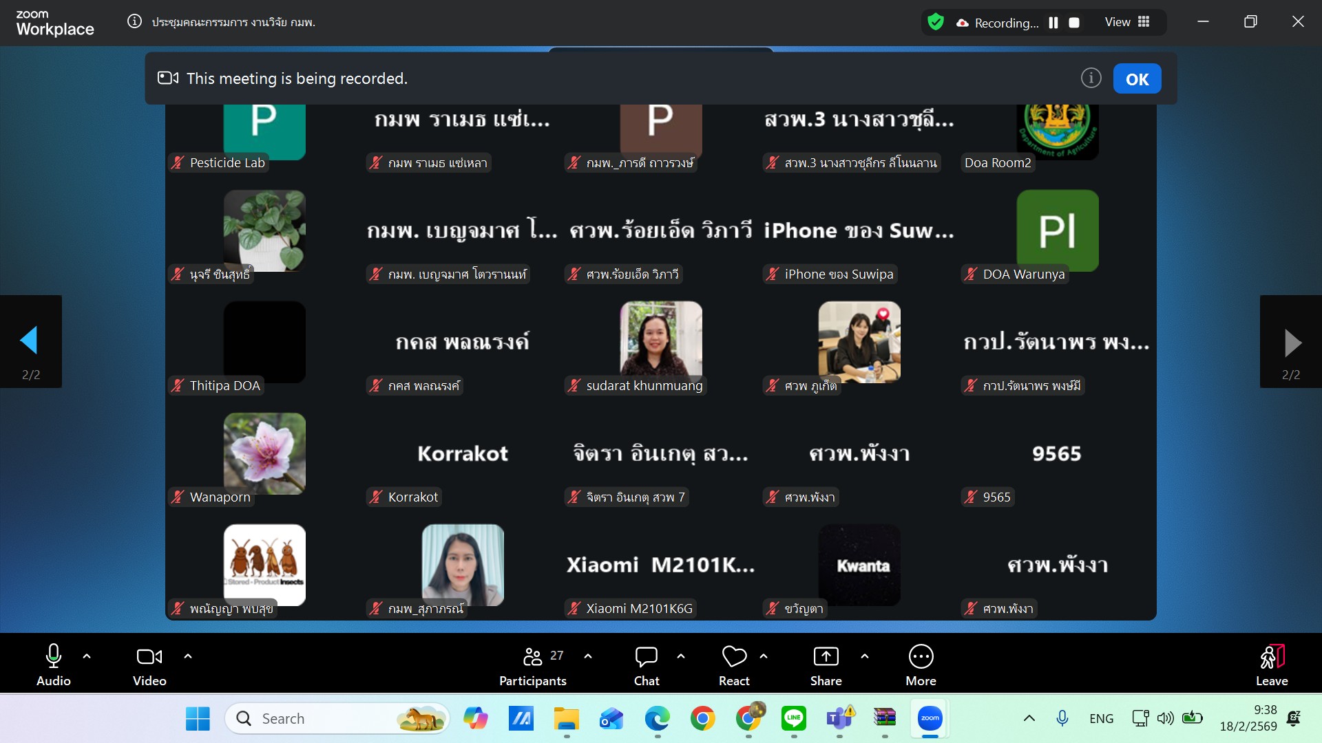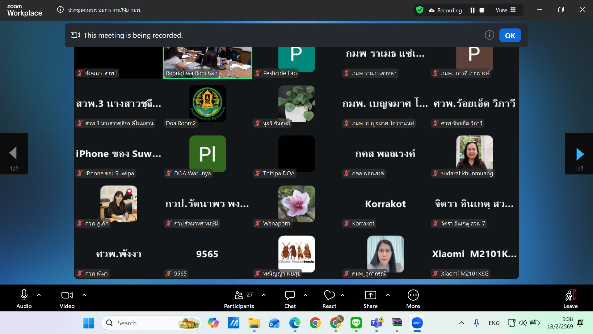 เมื่อวันพุทธที่ ๑๘ กุมภาพันธ์ ๒๕๖๙ นางสาวธิดากุญ แสนอุดม ผู้อำนวยการกองพัฒนาระบบและรับรองมาตรฐานสินค้าพืช มอบหมายให้นายเกรียงไกร สุภโตษะ ผู้เชี่ยวชาญด้านมาตรฐานคุณภาพสินค้าเกษตร เป็นประธานการประชุมคณะกรรมการวิจัยและพัฒนากองพัฒนาระบบและรับรองมาตรฐานสินค้าพืช ครั้งที่ ๓/๒๕๖๙ ณ ห้องประชุม เอ ชั้น ๒ อาคารกองวิจัยและพัฒนาวิทยาการหลังการเก็บเกี่ยวและแปรรูปผลิตผลเกษตร และประชุมผ่านระบบ Zoom meeting เพื่อพิจารณารายงานความก้าวหน้างานวิจัย ปี ๒๕๖๙ รอบ ๖ เดือน มีผู้เข้าร่วมประชุมจากสำนักวิจัยพัฒนาการอารักขาพืช กองพัฒนาระบบและรับรองมาตรฐานสินค้าพืช สำนักวิจัยพัฒนาเทคโนโลยีชีวภาพ สำนักวิจัยและพัฒนาการเกษตรเขตที่ ๑ สำนักวิจัยและพัฒนาการเกษตรเขตที่ ๓ ศูนย์วิจัยและพัฒนาการเกษตรพังงา และศูนย์วิจัยและพัฒนาการเกษตรภูเก็ต จำนวน ๔๐ คน