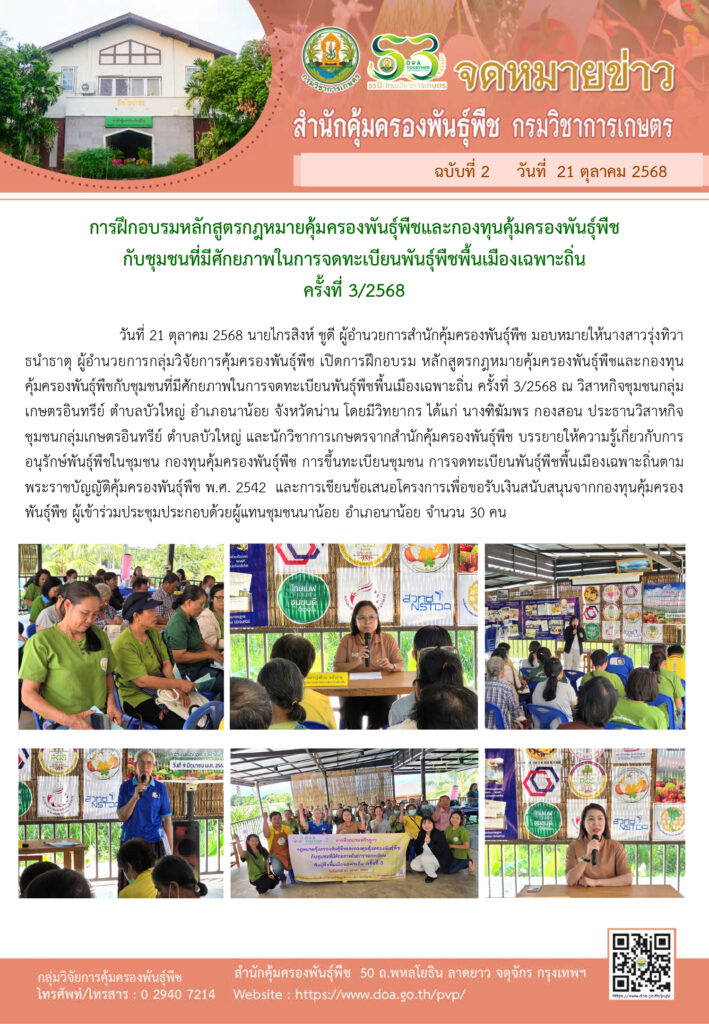นางสาวรุ่งทิวา ธนำธาตุ ผู้อำนวยการกลุ่มวิจัยการคุ้มครองพันธุ์พืช เปิดการฝึกอบรม หลักสูตรกฎหมายคุ้มครองพันธุ์พืชฯBy สำนักคุ้มครองพันธุ์พืช / 21 ตุลาคม 2568