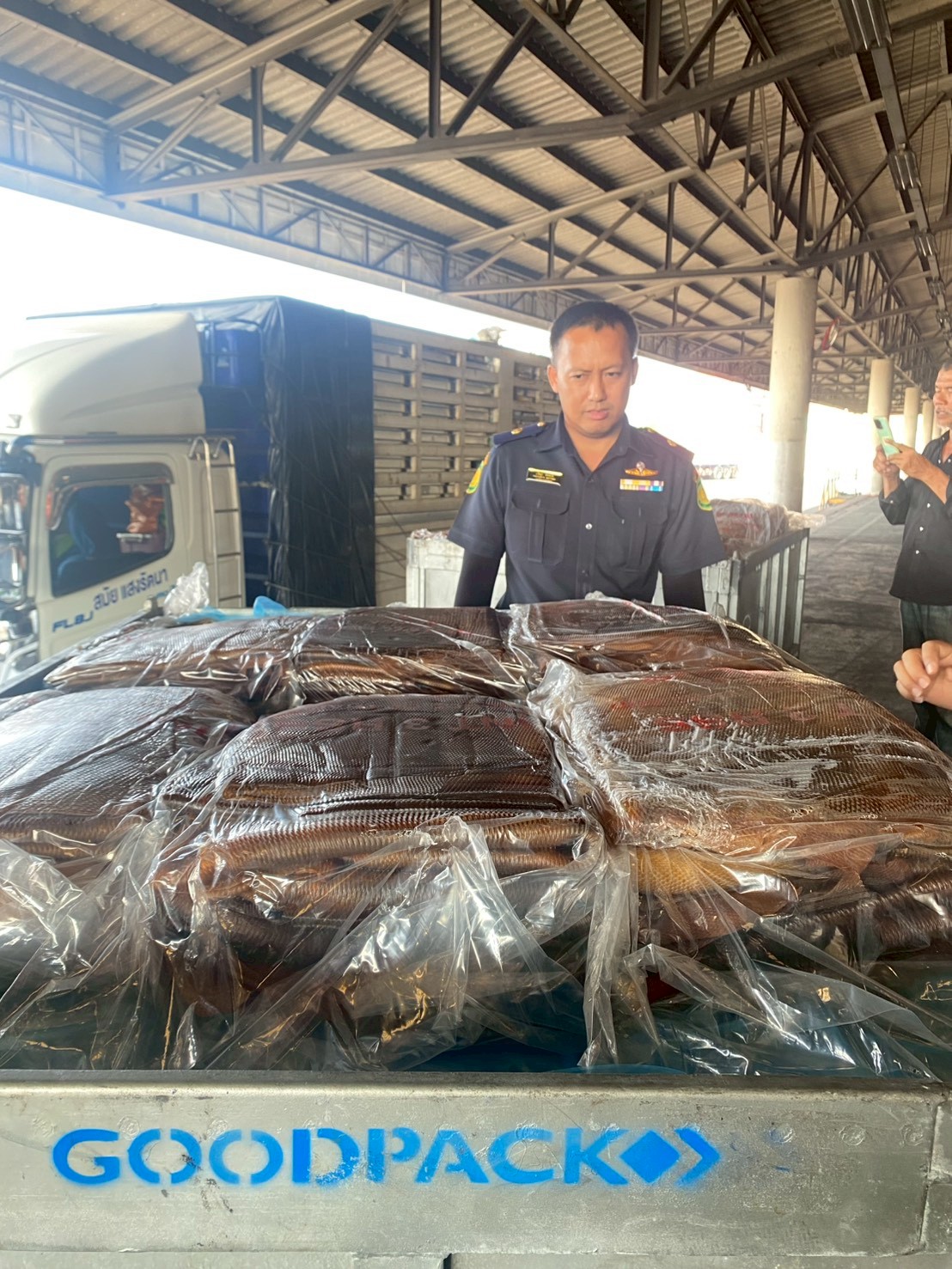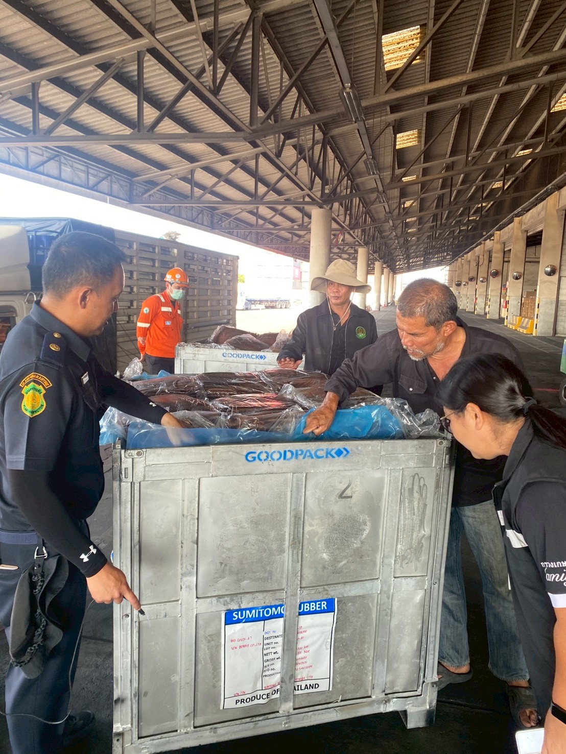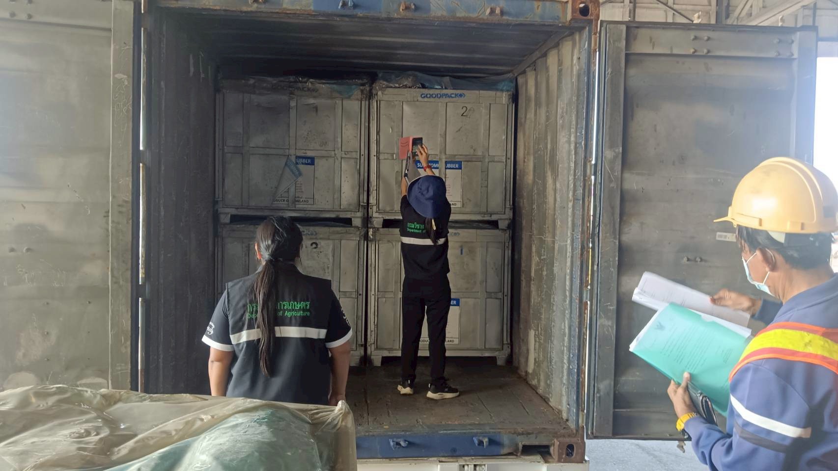 นางเนาวรัตน์ ทองคำ และ นายสิทธา พันทา ดำเนินตรวจสอบความถูกต้องของยางตามคำขอนำยางกลับเข้ามาราชอาณาจักร ร่วมกับด่านตรวจพืชท่าเรือแหลมฉบัง และเจ้าหน้าที่ศุลกากร ณ ด่านศุลกากรท่าเรือแหลมฉบัง
