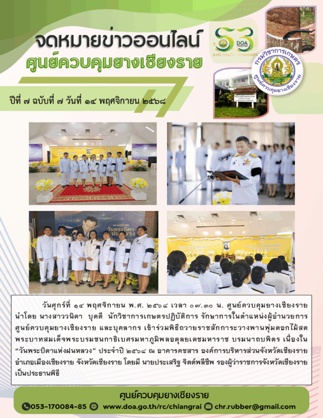 ข่าว จดหมายข่าวออนไลน์ศูนย์ควบคุมยางเชียงราย ปีที่ 7 ฉบับที่ 7 วันที่ 14 พฤศจิกายน 2568 admin 14 พฤศจิกายน 2568 FacebookFacebook Post navigation Previous: จดหมายข่าวออนไลน์ศูนย์ควบคุมยางเชียงราย ปีที่ 7 ฉบับที่ 6 วันที่ 11 พฤศจิกายน 2568Next: จดหมายข่าวออนไลน์ศูนย์ควบคุมยางเชียงราย ปีที่ 7 ฉบับที่ 8 วันที่ 18 พฤศจิกายน 2568 More Stories ข่าว จดหมายข่าวออนไลน์ศูนย์ควบคุมยางเชียงราย ปีที่ 7 ฉบับที่ 8 วันที่ 18 พฤศจิกายน 2568 admin 18 พฤศจิกายน 2568 ข่าว จดหมายข่าวออนไลน์ศูนย์ควบคุมยางเชียงราย ปีที่ 7 ฉบับที่ 6 วันที่ 11 พฤศจิกายน 2568 admin 11 พฤศจิกายน 2568 ข่าว สาระน่ารู้ ประกาศให้ผู้นำยางเข้าใน ผ่าน ออกจากเขตควบคุมการขนย้ายยางในเขตควบคุมการขนย้ายยางฯ admin 21 ตุลาคม 2568
