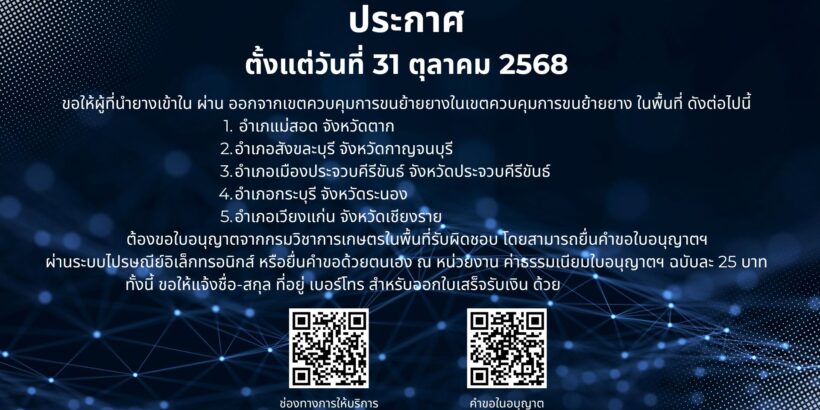 “ประกาศกระทรวงเกษตรและสหกรณ์ เรื่องเขตควบคุมการขนย้ายยาง” Posted on 18 กันยายน 2568 by admin ประกาศกระทรวงเกษตรและสหกรณ์ เรื่อง กำหนดเขตควบคุมการขนย้ายยาง พ.ศ. 2568 (152 downloads ) ประกาศกระทรวงเกษตรและสหกรณ์ เรื่อง การกำหนดมาตรฐานยางและวิธีการมัดยาง และการบรรจุหีบห่อเพื่อการส่งออก พ.ศ. 2568 (131 downloads ) FacebookFacebookXTwitter แนะแนวเรื่อง « ศูนย์ควบคุมยางสงขลา มีความประสงค์จะขายทอดตลาดพัสดุชำรุดและเสื่อมสภาพ ประจำปีงบประมาณ 2567 โดยมีรายละเอียดและเงื่อนไขการประมูล ดังนี้