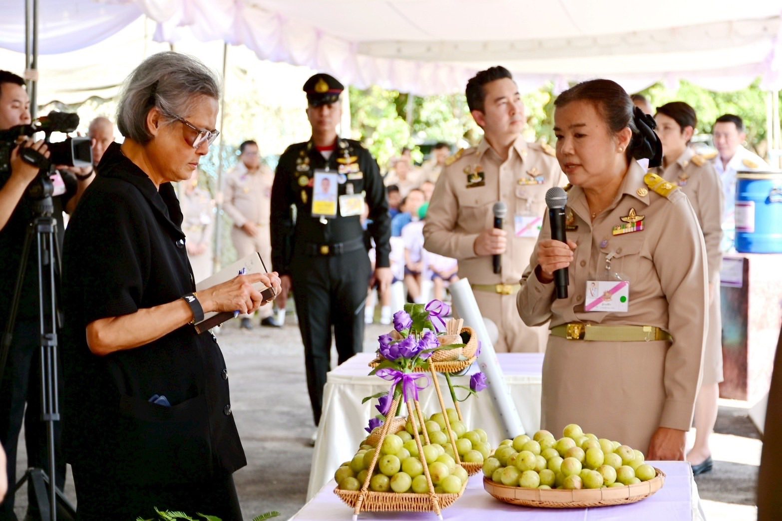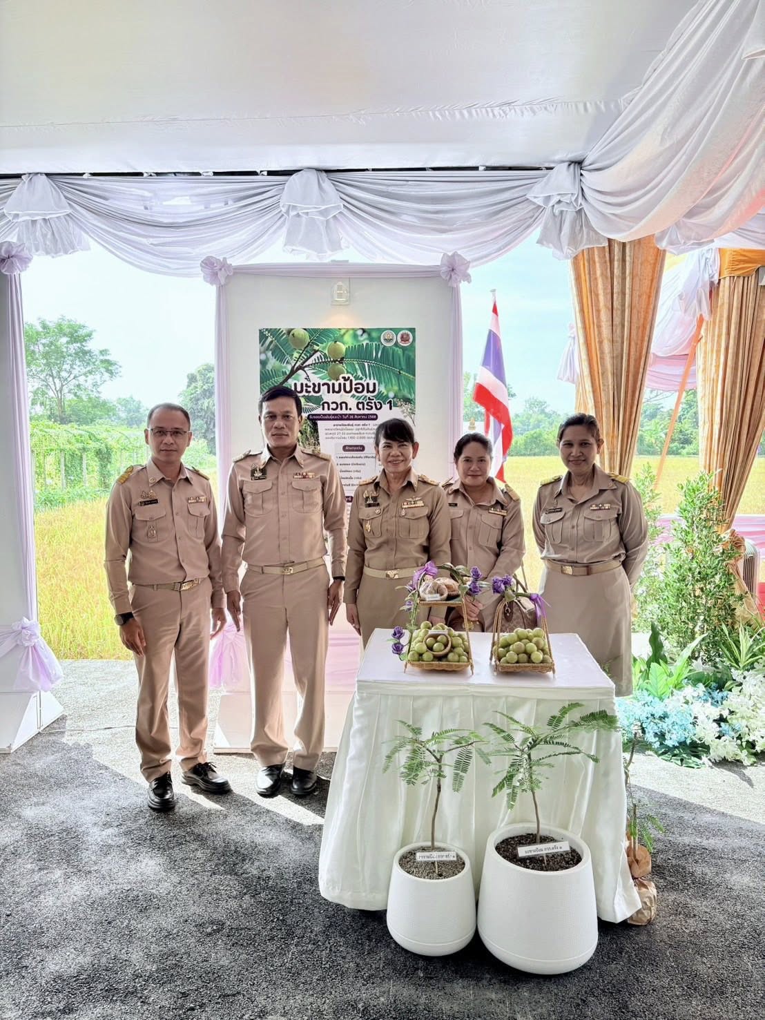 ในการนี้ นายรพีภัทร์ จันทรศรีวงศ์ อธิบดีกรมวิชาการเกษตร มอบหมายให้นางวิลาวัณย์ ใคร่ครวญ รองอธิบดีกรมวิชาการเกษตร กราบบังคมทูลรายงาน เรื่อง พืชพันธุ์ดีจากงานวิจัยและพัฒนาของกรมวิชาการเกษตร “มะขามป้อม พันธุ์ กวก. ตรัง 1” โดยศูนย์วิจัยพืชสวนตรัง ซึ่งได้รับรองเป็นพันธุ์แนะนำ เมื่อวันที่ 26 สิงหาคม 2568 มีลักษณะเด่น คือ ขนาดผลใหญ่ น้ำหนักเนื้อเยอะ วิตามินซีสูง ให้ผลผลิตต่อต้นเฉลี่ย 41.89 กิโลกรัม พร้อมมอบหมายให้นางอารดา มาสริ ผู้อำนวยการสำนักวิจัยและพัฒนาการเกษตรเขตที่ 5 ร่วมเกี่ยวข้าวพันธุ์ กข 99 ในแปลงนาสาธิตการเกษตรโรงเรียนนายร้อยพระจุลจอมเกล้า จังหวัดนครนายก