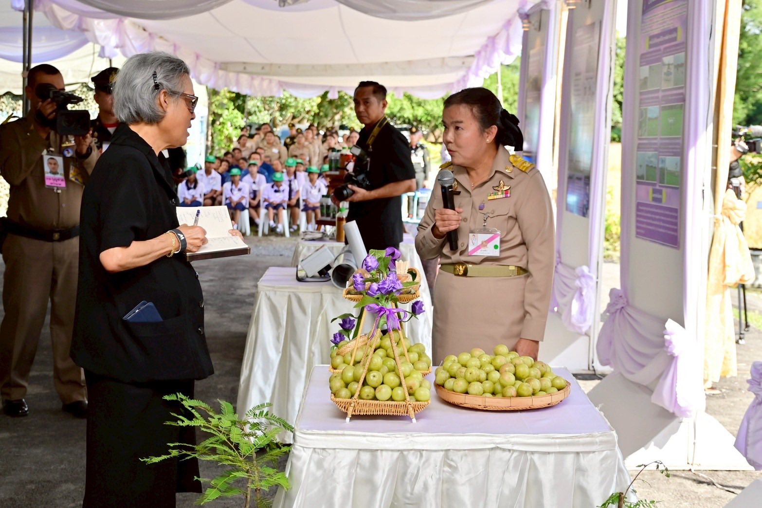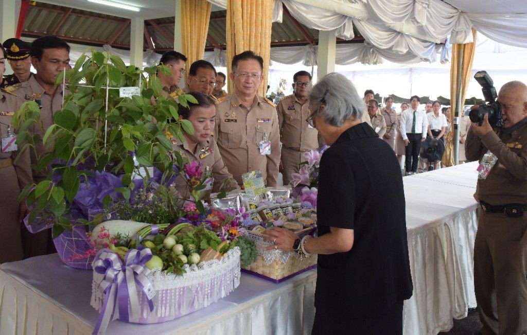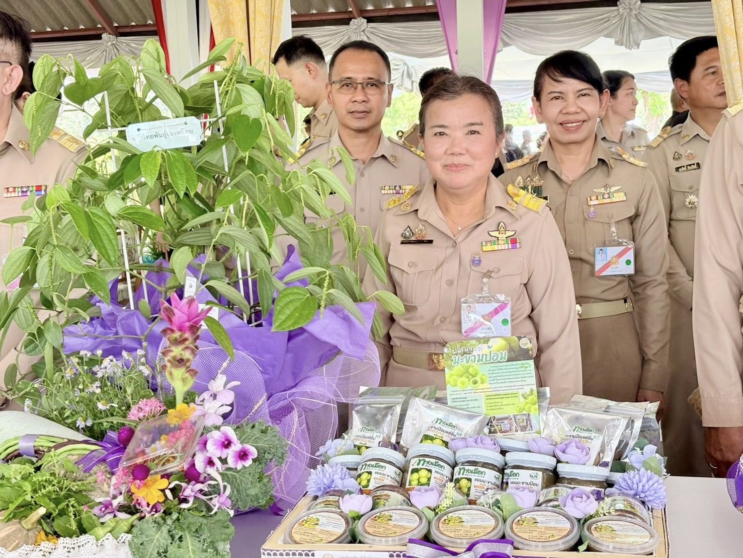 โอกาสเดียวกันนี้ กรมวิชาการเกษตร ได้ทูลเกล้าฯ ถวาย ผลผลิตและผลิตภัณฑ์แปรรูปจากมะขามป้อม กวก.ตรัง 1 ต้นพริกไทย”พันธุ์ปะเหลียน” และผลผลิตที่ได้จากการปลูกพืชผักบนคันนา ได้แก่ กระเจี๊ยบเขียวพันธุ์ (กวก. กาญจนบุรี 1) ถั่วฝักยาวพันธุ์ (กวก. พิจิตร 3) ถั่วฝักยาวม่วงพันธุ์ (กวก. พิจิตร 1) อัญชันพันธุ์เทพรัตน์ไพลิน 63 ฟักทองบัตเตอร์นัท ฟักทอง ฟักแฟง น้ำเต้า แตงกวา กะเพรา และไม้ดอกทานได้
