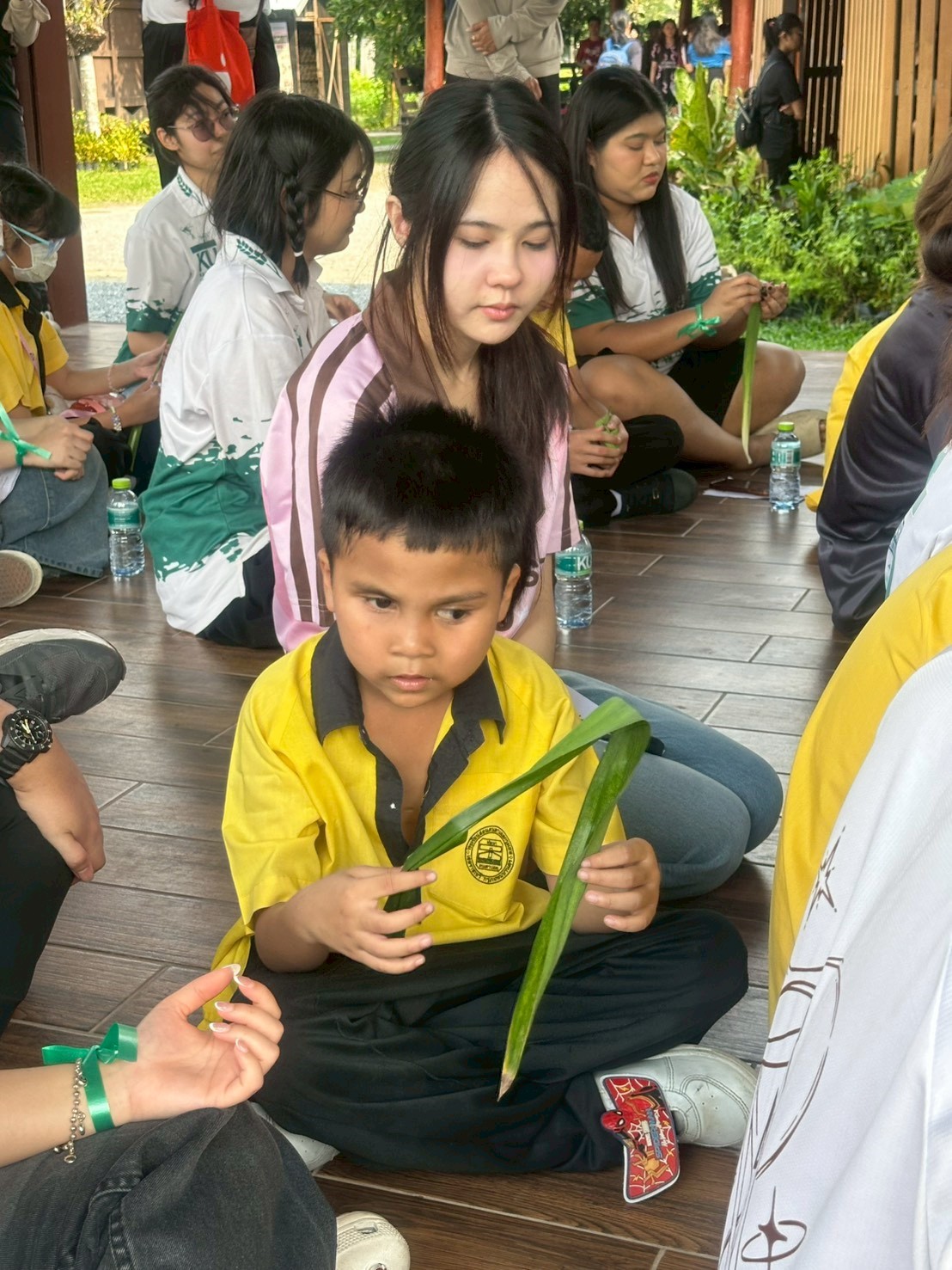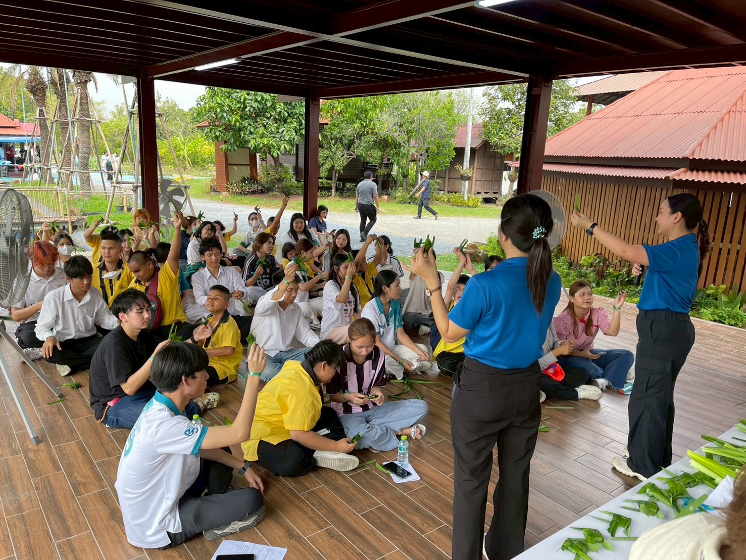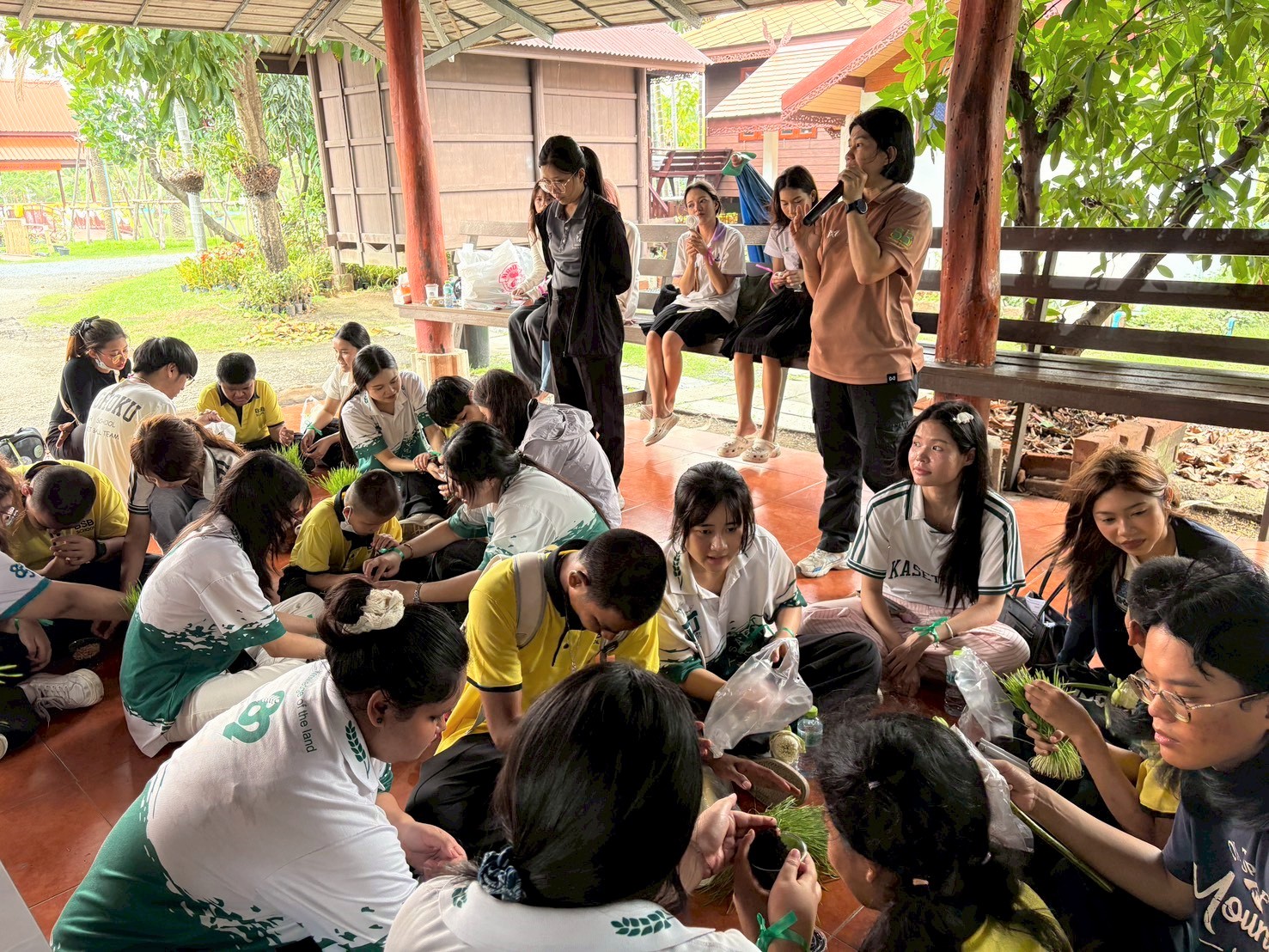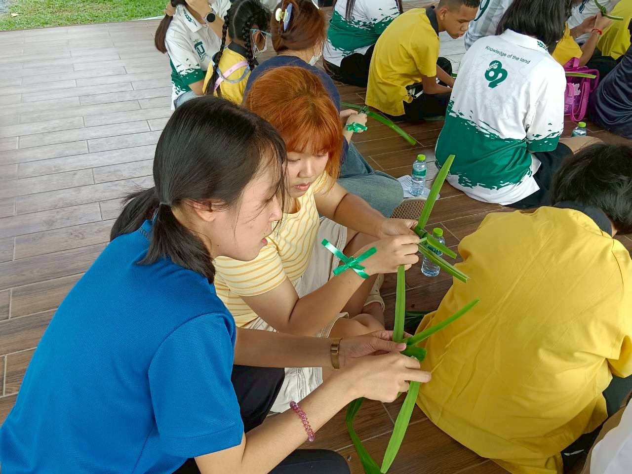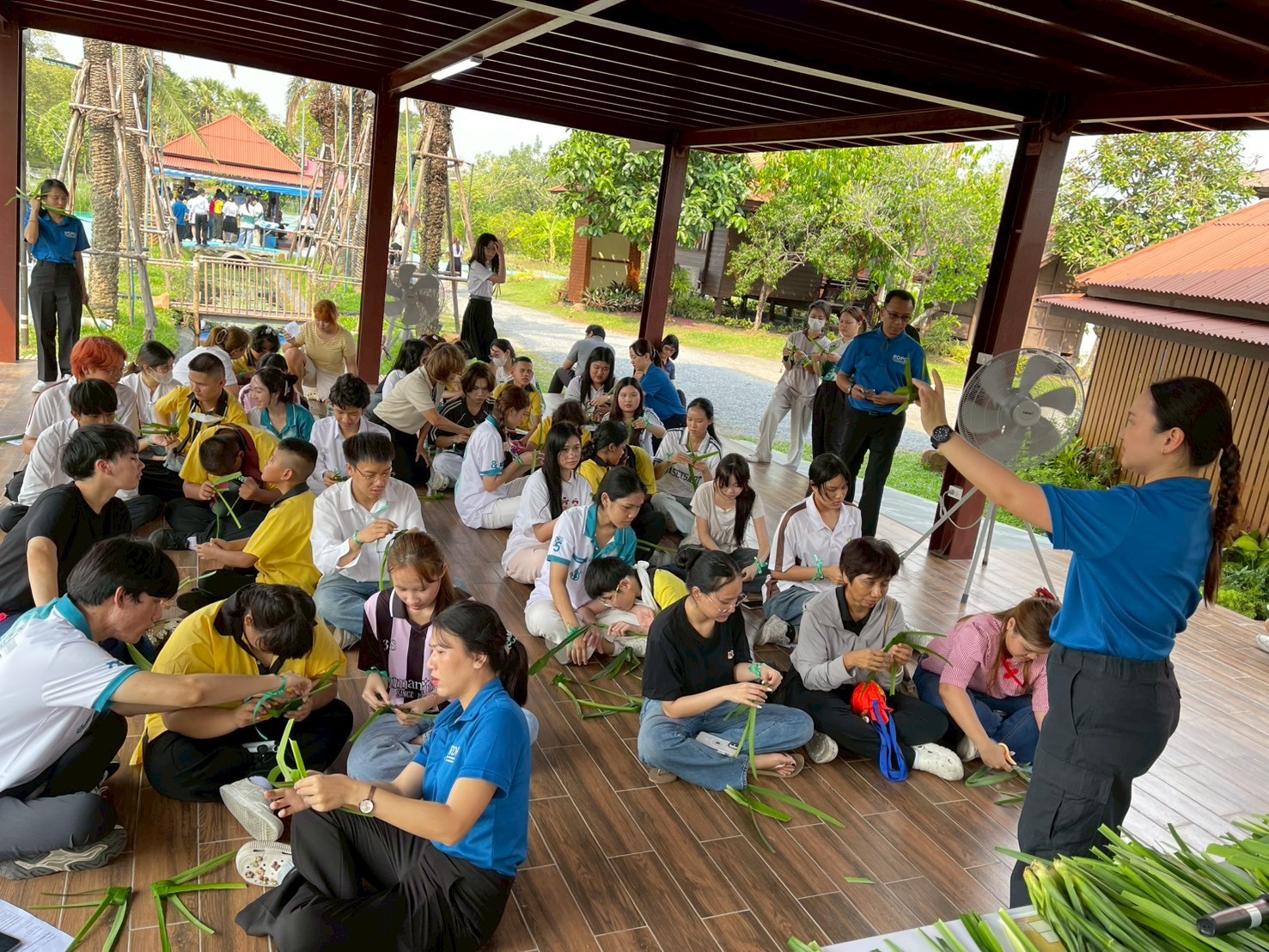 ฐานที่ 1 กิจกรรมสานใบเตย + ต้มน้ำใบเตย [Weaving pandan leaves + boiling pandan leaf water] ณ ศาลา 2 ชั้น