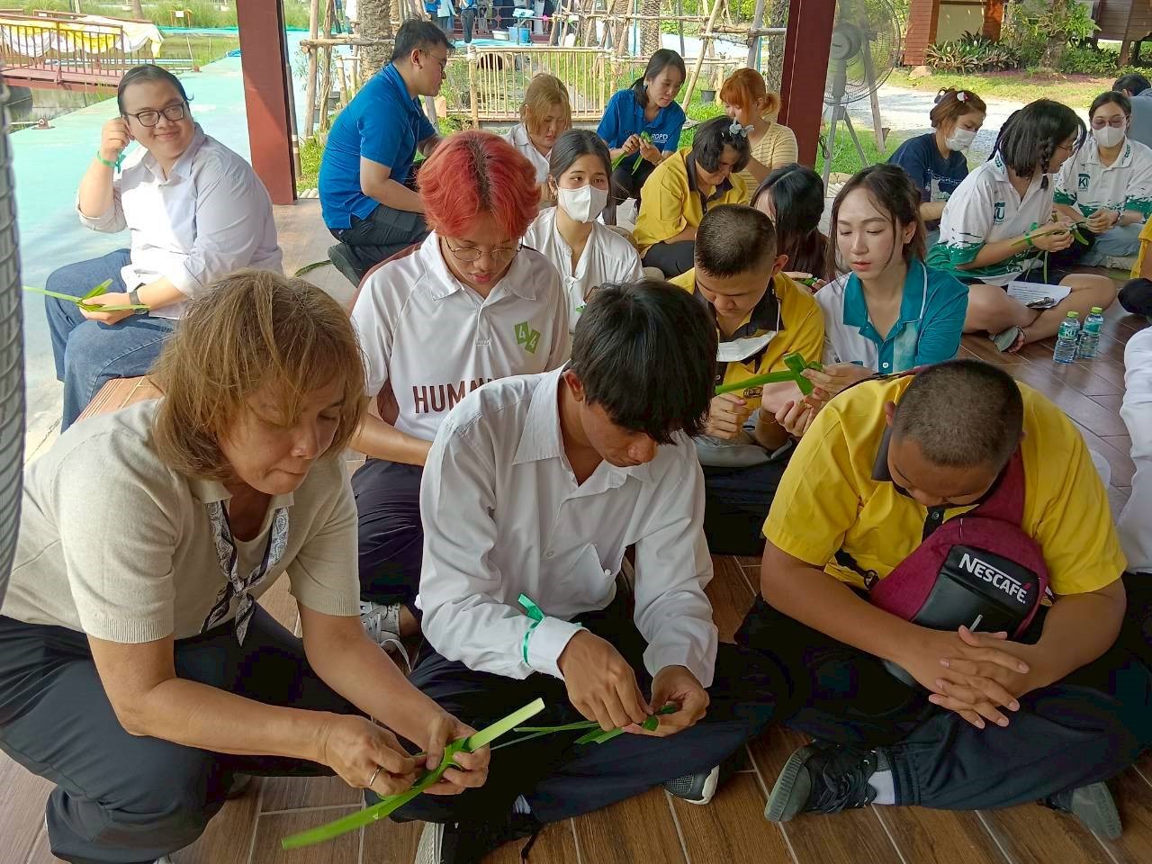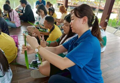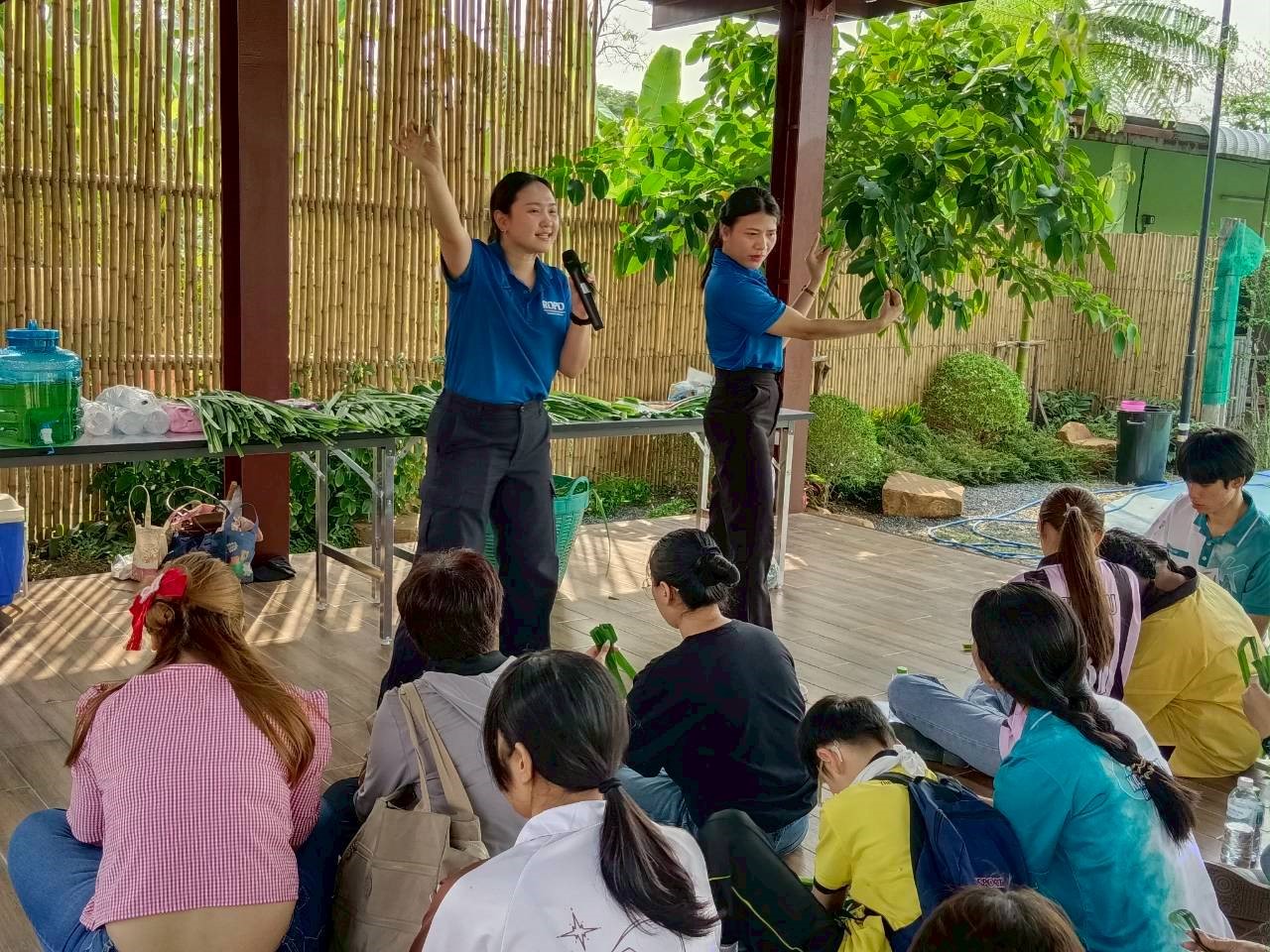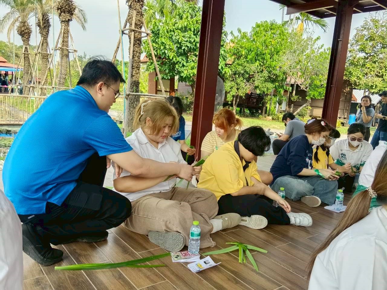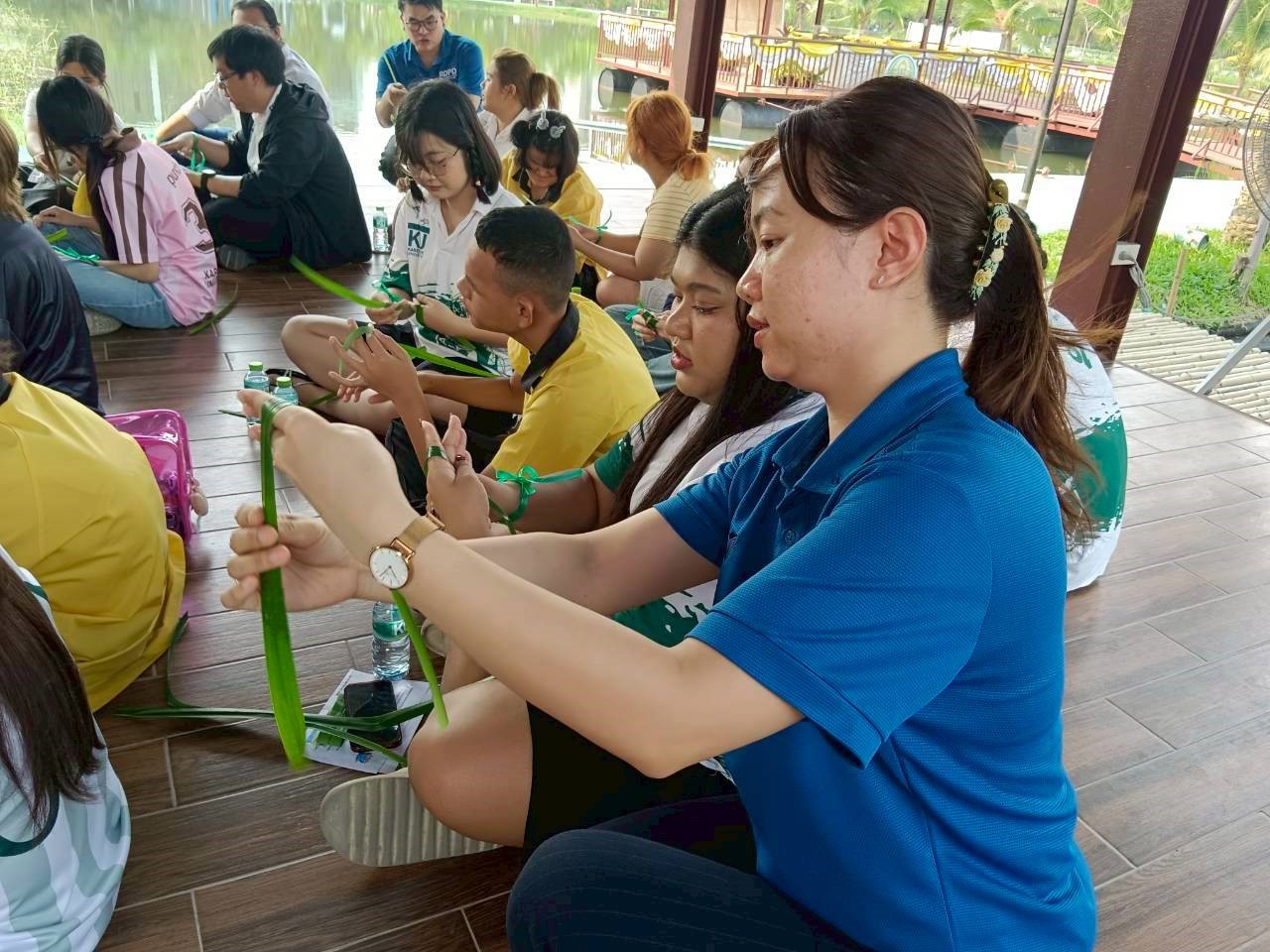 ฐานที่ 1 กิจกรรมสานใบเตย + ต้มน้ำใบเตย [Weaving pandan leaves + boiling pandan leaf water] ณ ศาลา 2 ชั้น