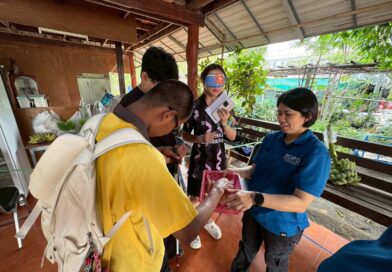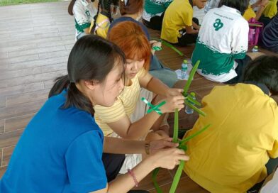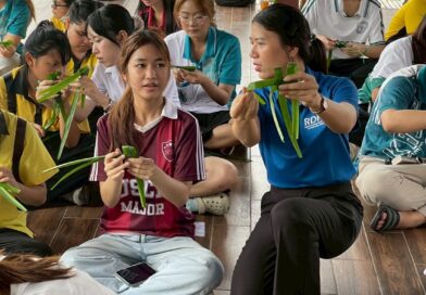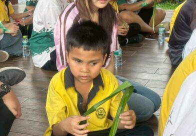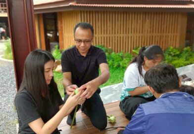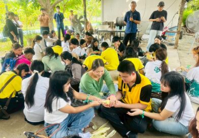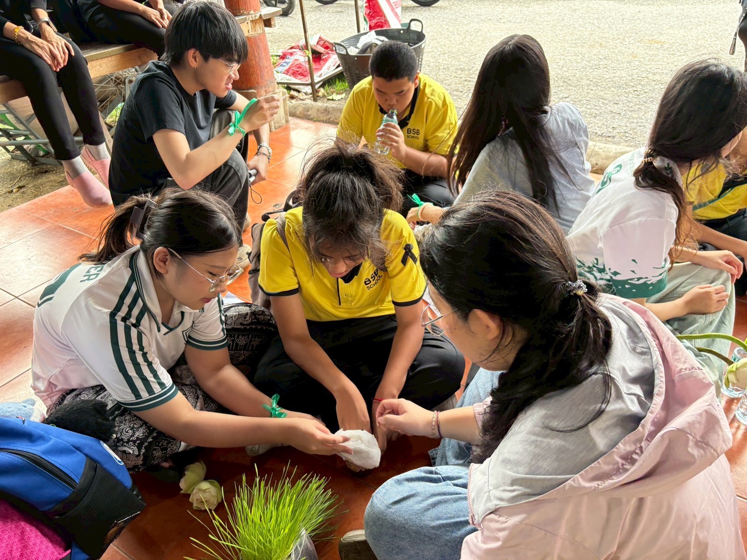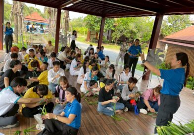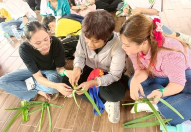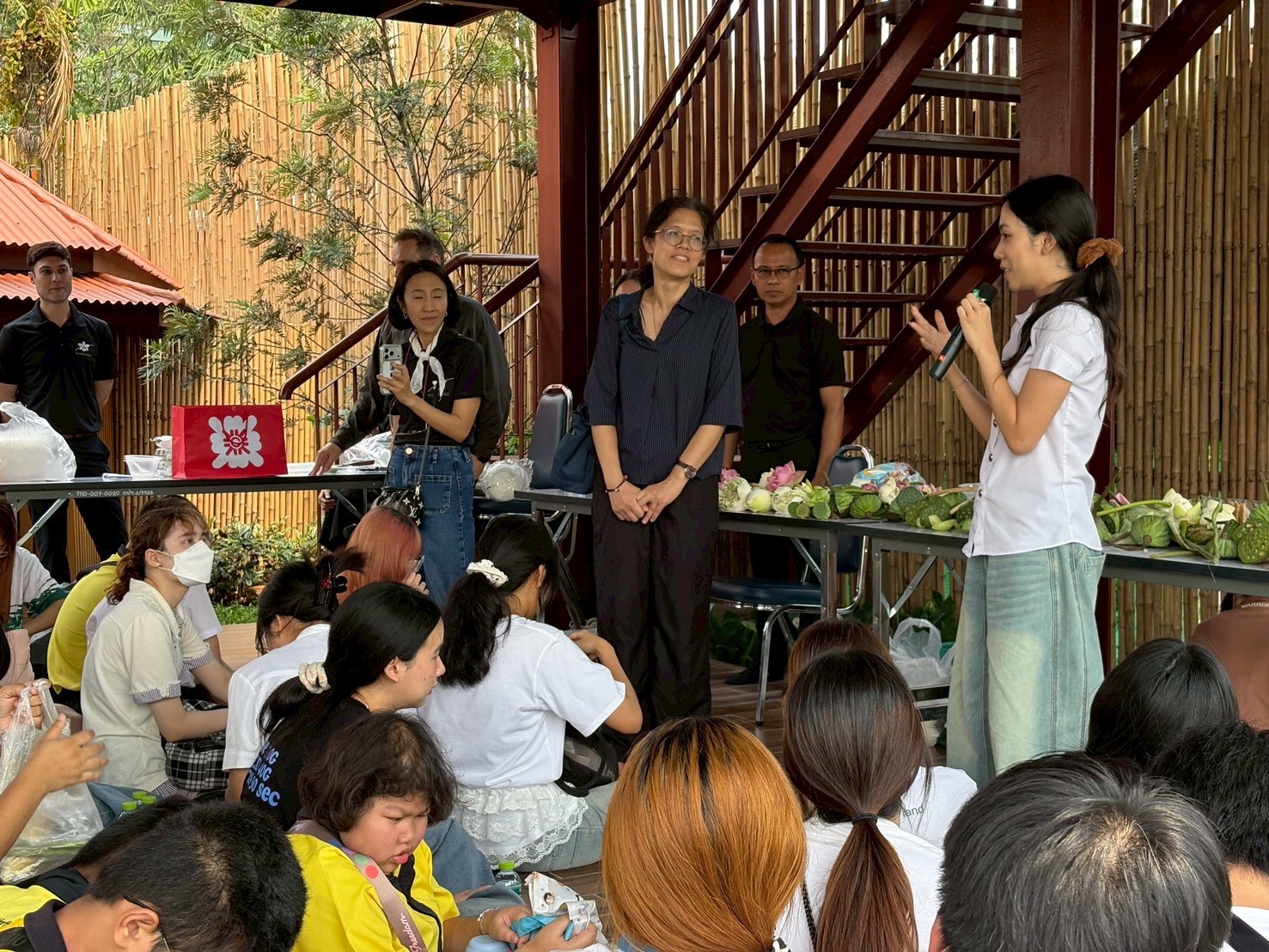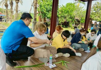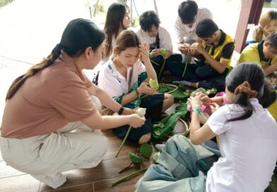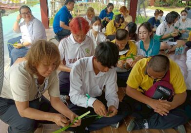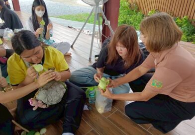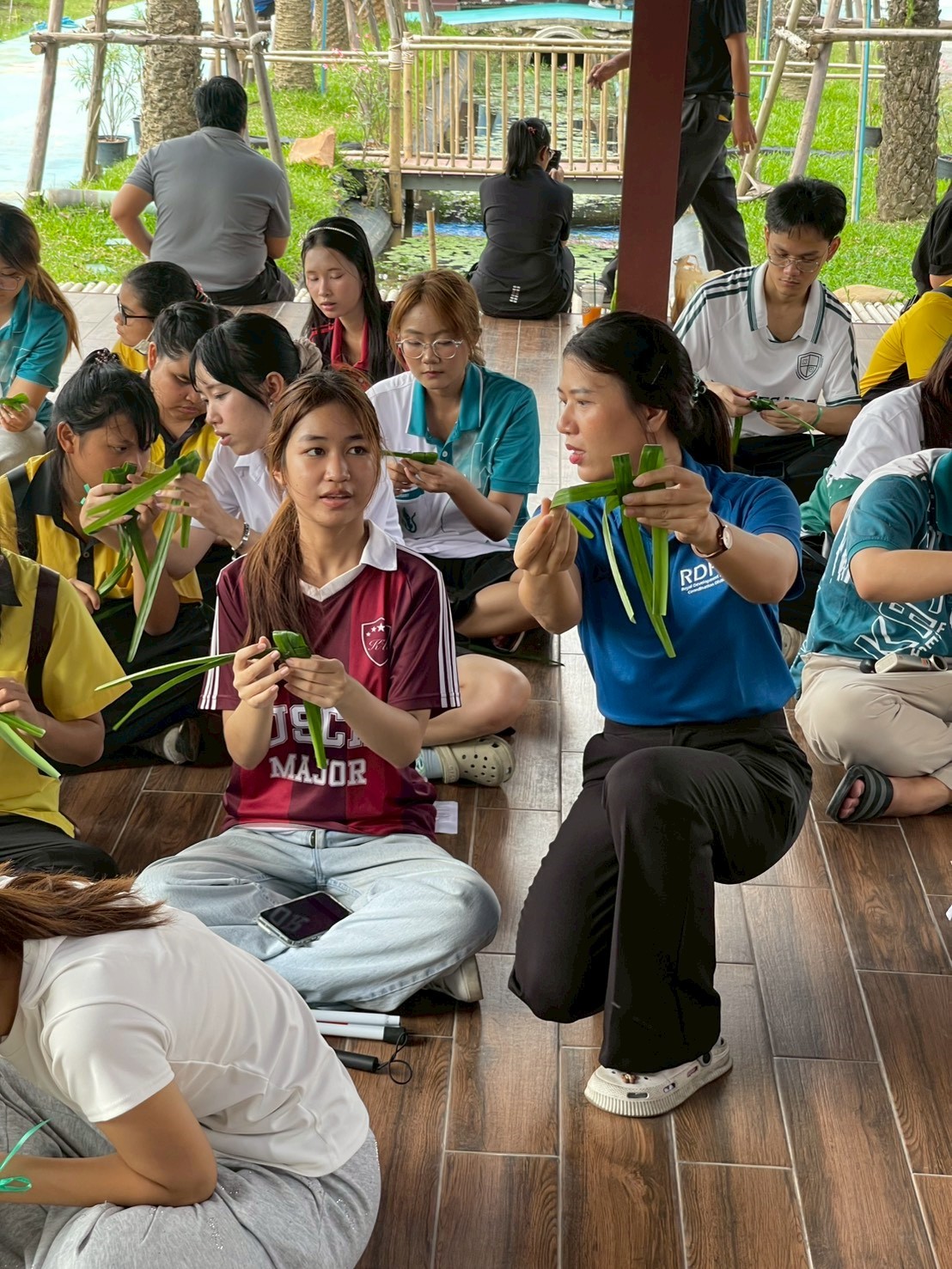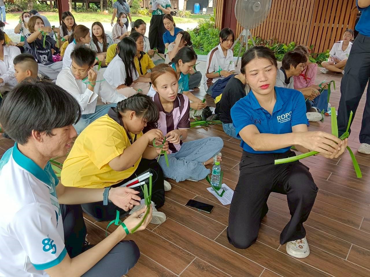 ฐานที่ 1 กิจกรรมสานใบเตย + ต้มน้ำใบเตย [Weaving pandan leaves + boiling pandan leaf water] ณ ศาลา 2 ชั้น