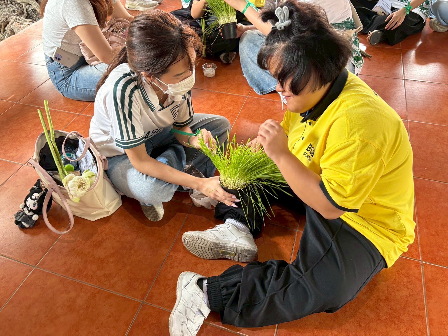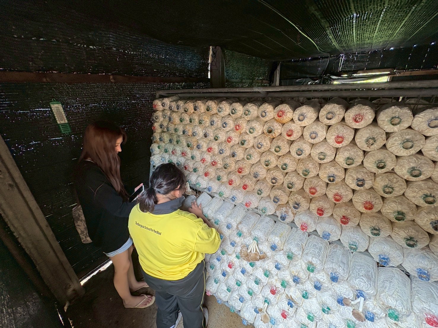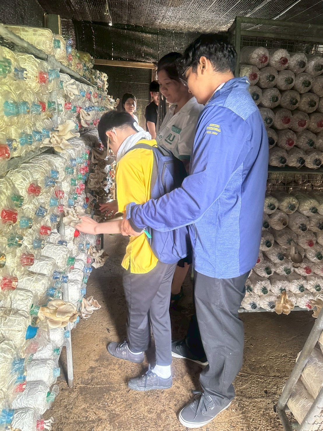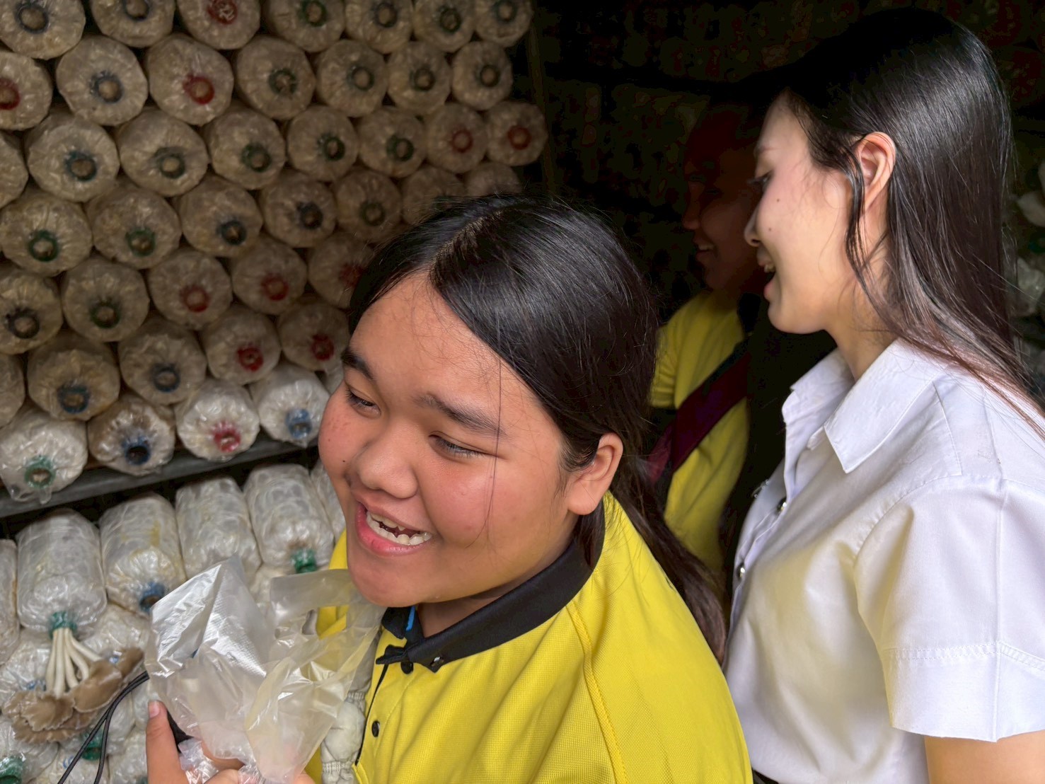 ฐานที่ 3 กิจกรรมปลูกหญ้าแมว (ต้นข้าวสาลี) และเพาะเห็ด [Growing cat grass (wheatgrass) and cultivating mushrooms] ณ บ้านชาวนา