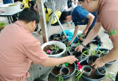 ฐานที่ 2 กิจกรรมปลูกผักลงแปลง (ต้นไม้จากกระถางลงแปลงผัก = ข้าวโพด) [Planting vegetable seedlings (from potted plants to vegetable plots = corn)] ณ โรงจอดรถ