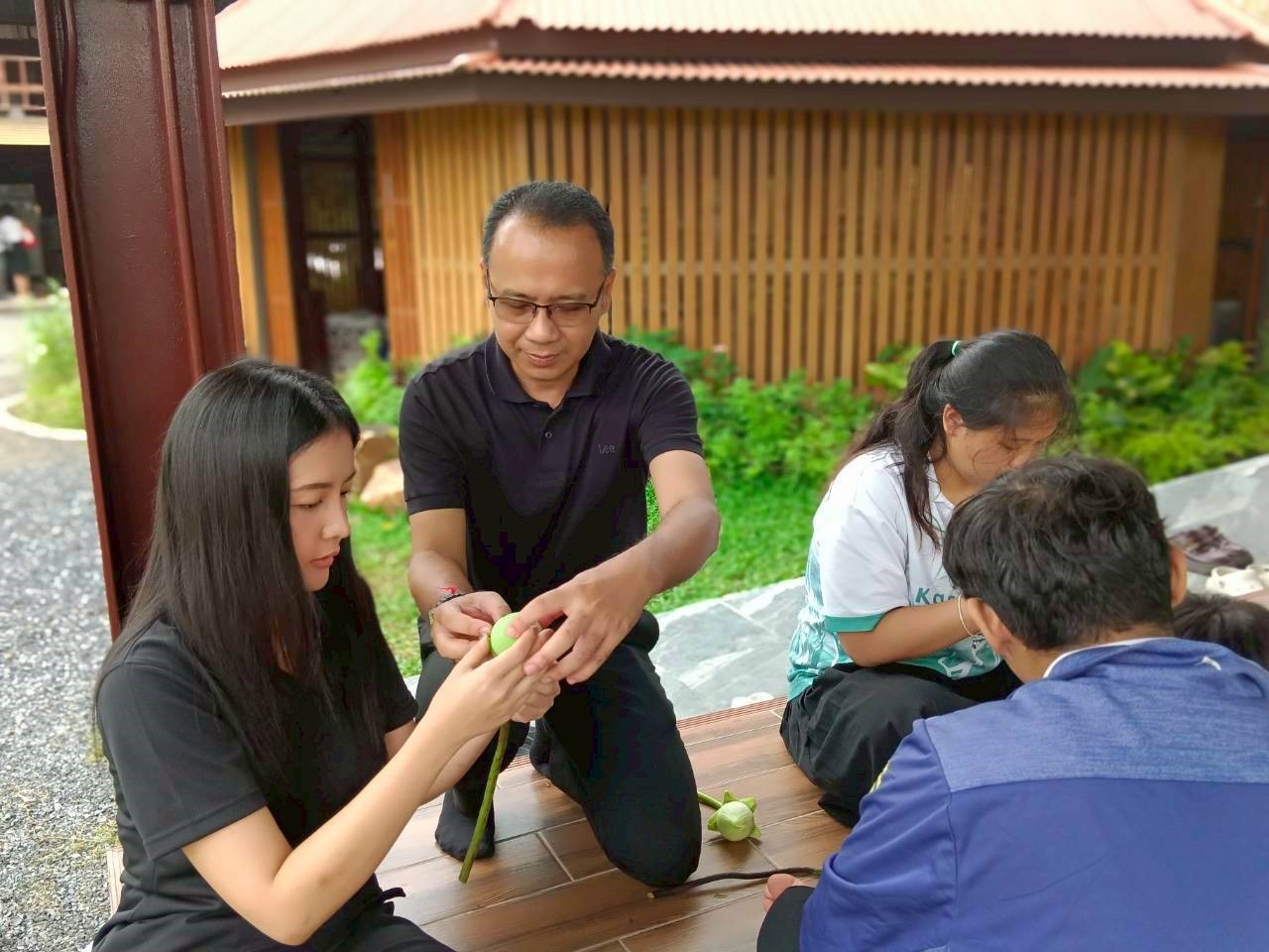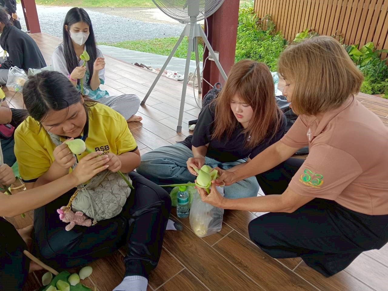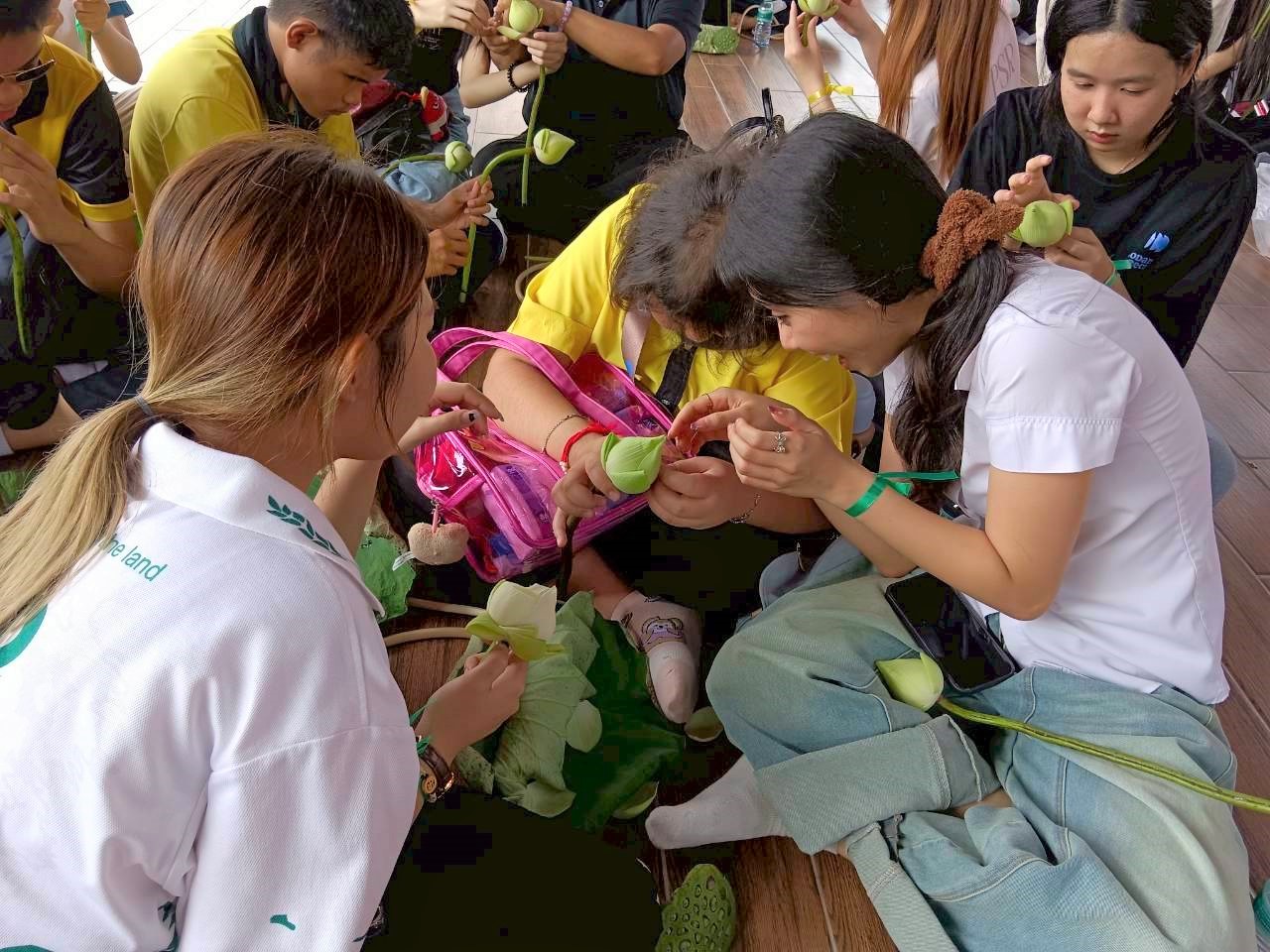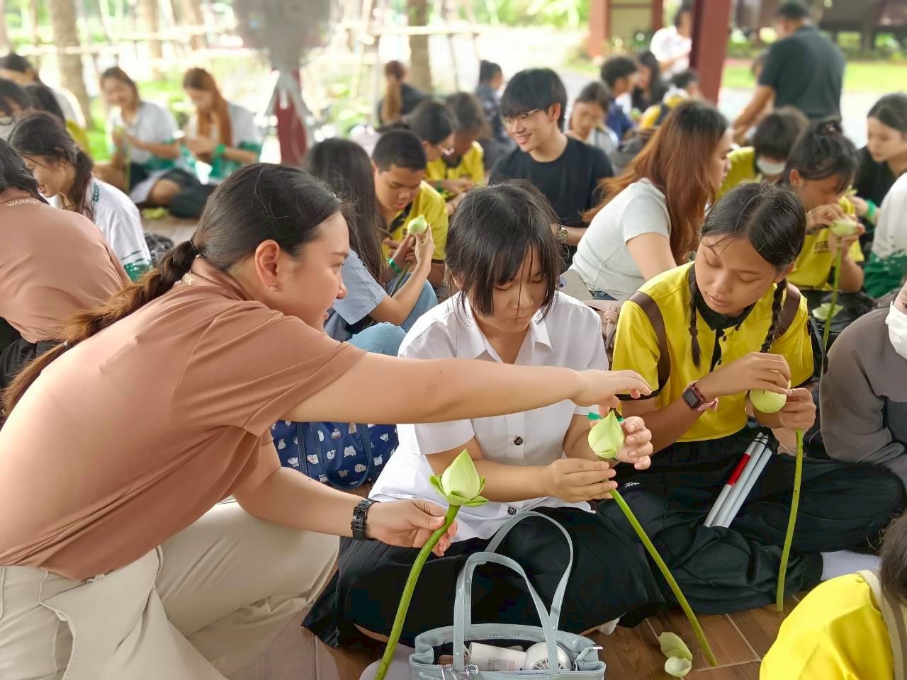 ฐานที่ 1 กิจกรรมพับดอกบัว [Folding a lotus flower] {กิน (Eat) -> เรียนรู้ (Lean) -> พับ (Fold)} ณ ศาลา 2 ชั้น