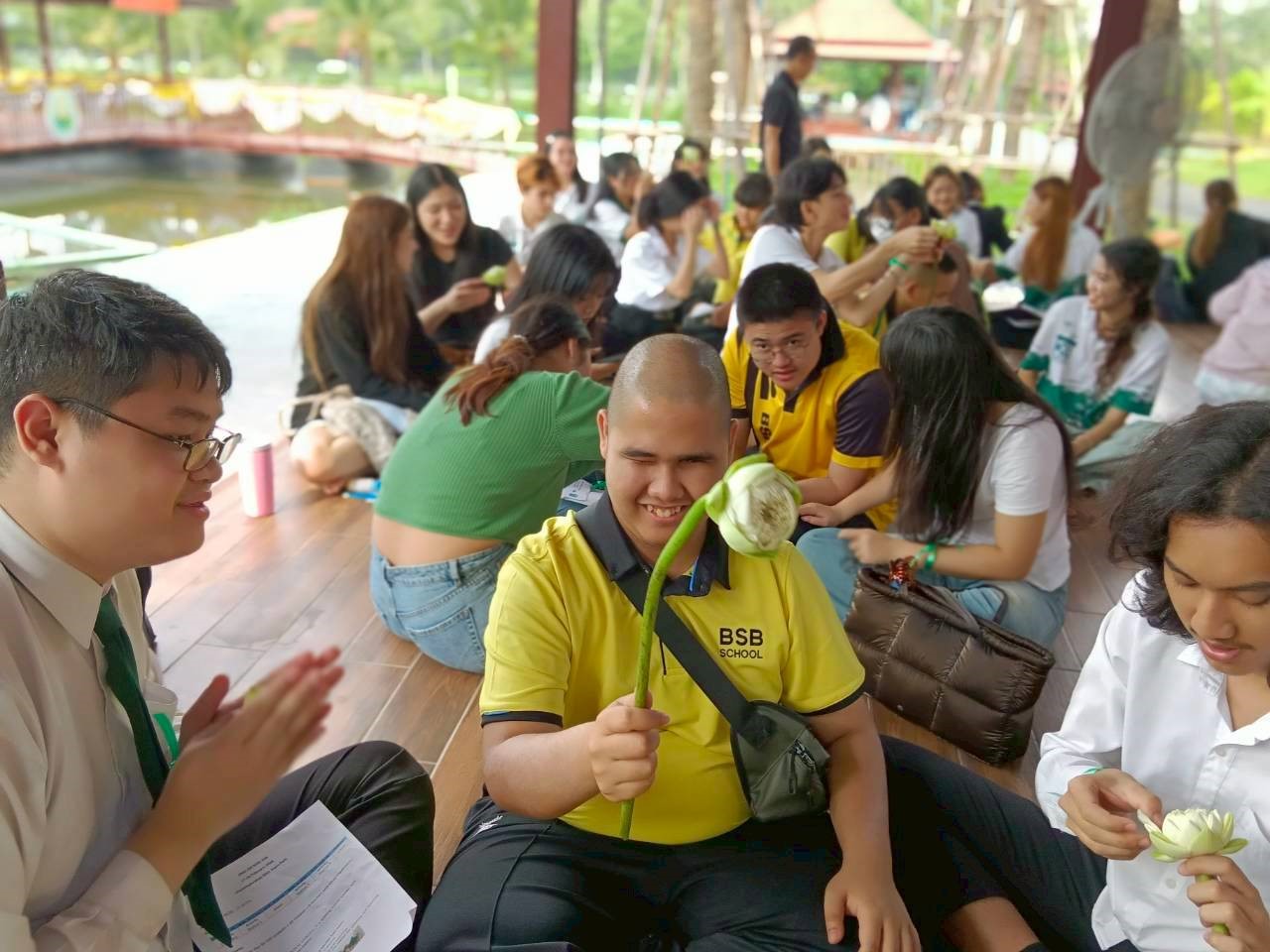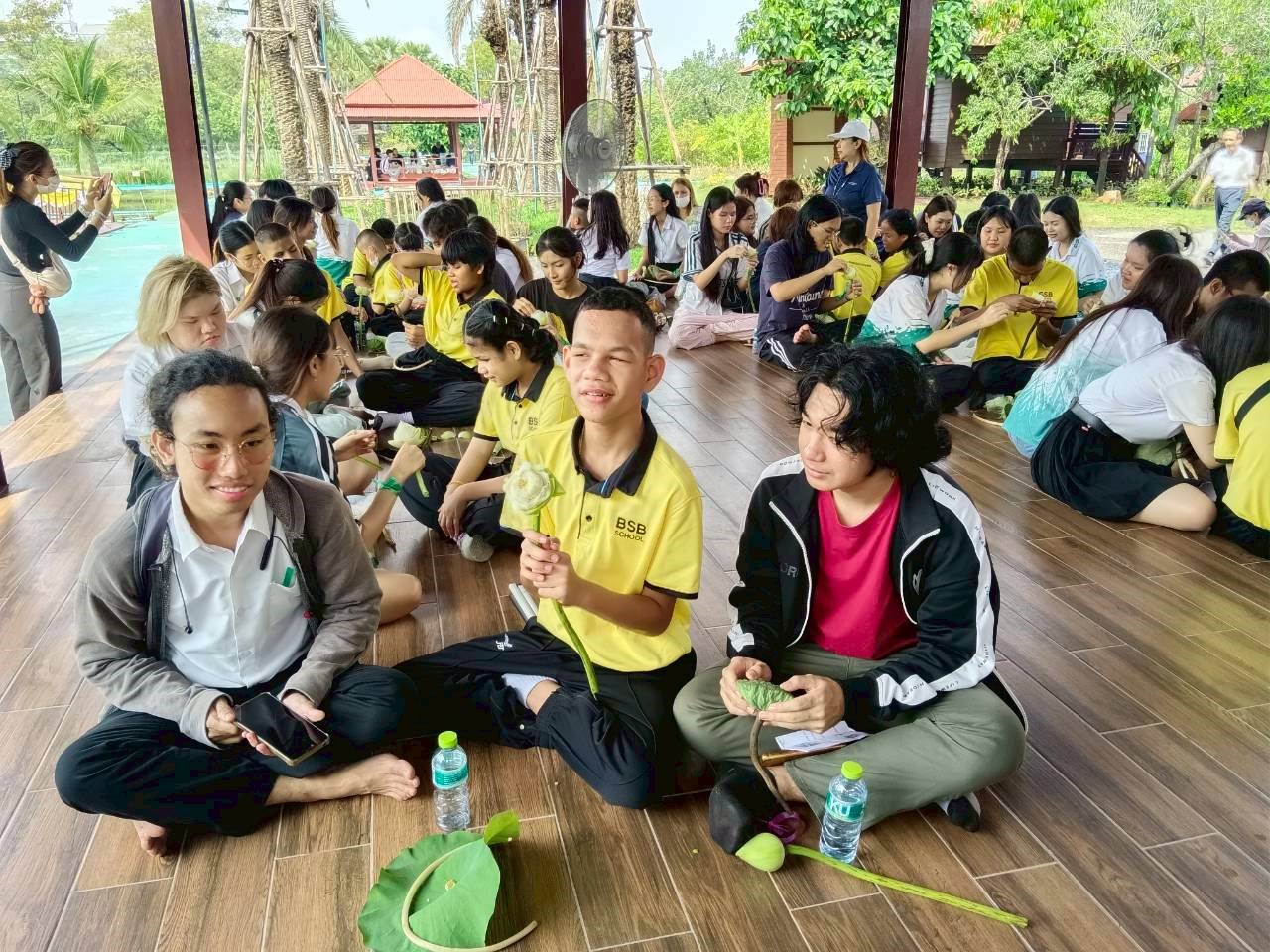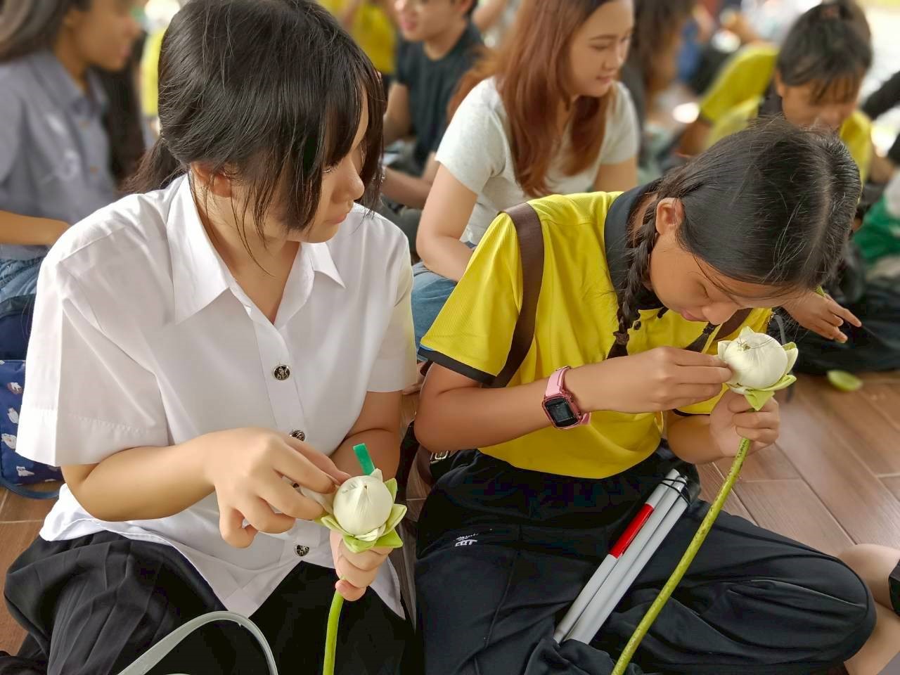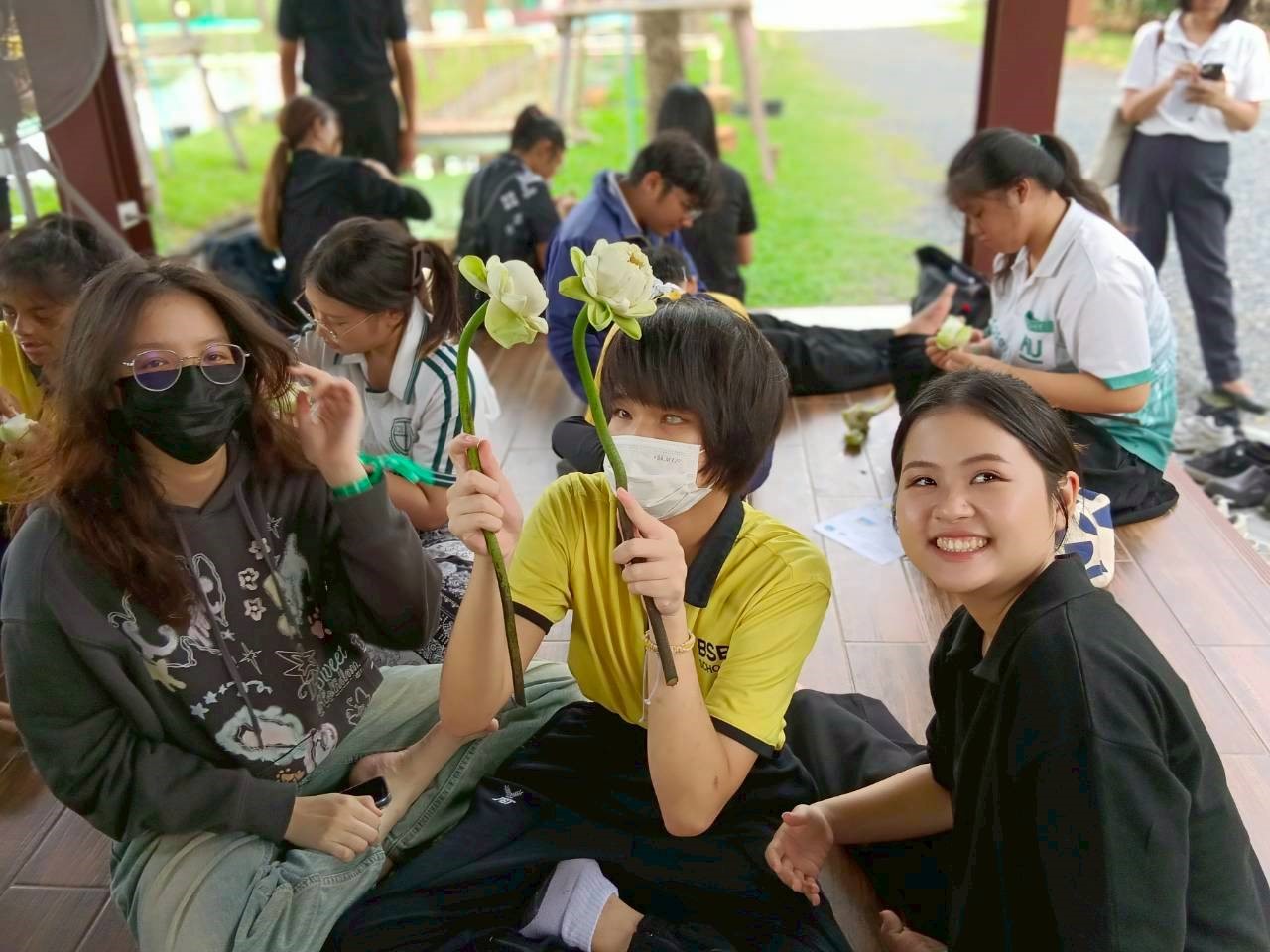 ฐานที่ 1 กิจกรรมพับดอกบัว [Folding a lotus flower] {กิน (Eat) -> เรียนรู้ (Lean) -> พับ (Fold)} ณ ศาลา 2 ชั้น