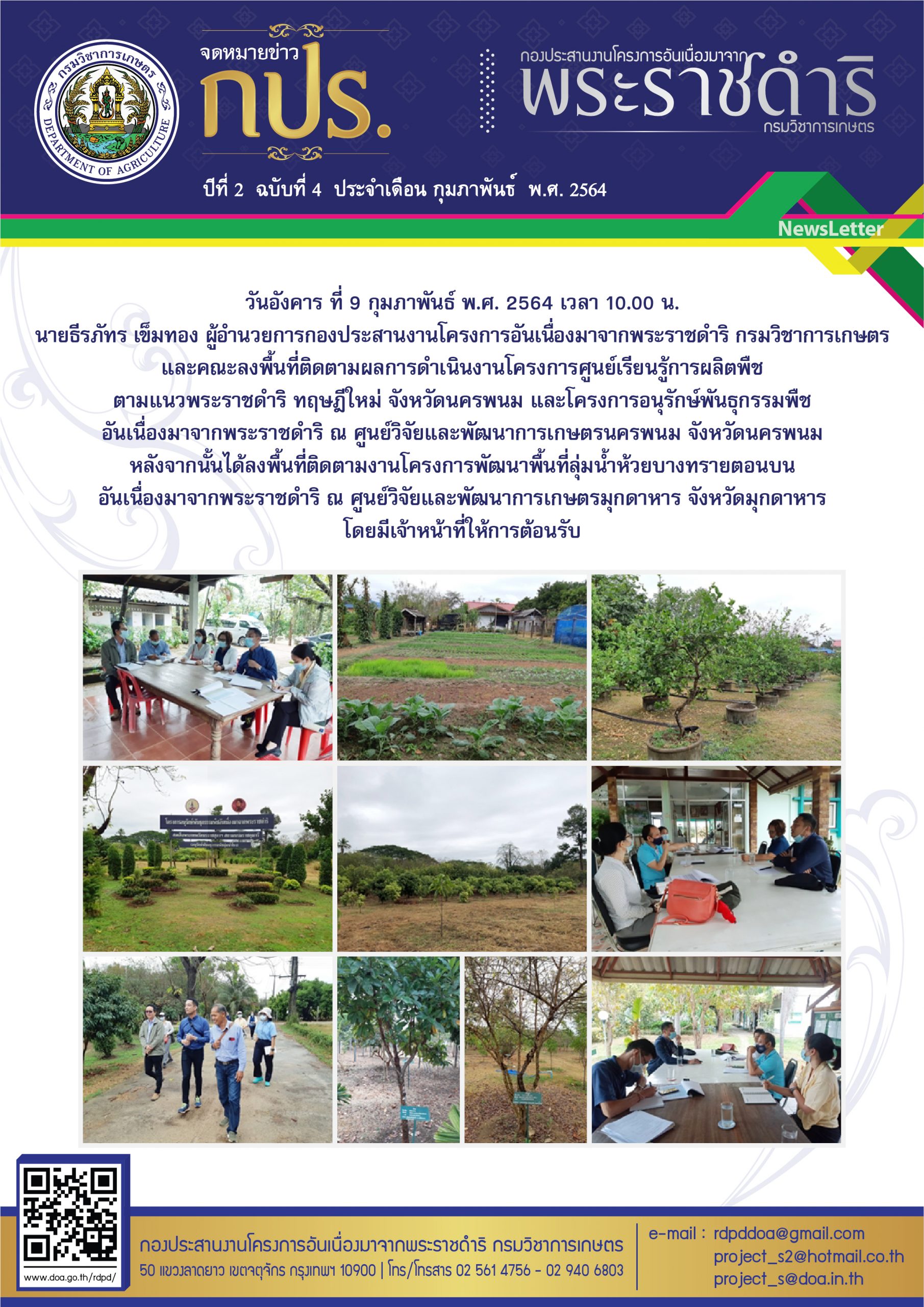 วันอังคาร ที่ 9 กุมภาพันธ์ พ.ศ. 2564 เวลา 10.00 น. นายธีรภัทร เข็มทอง ผู้อำนวยการกองประสานงานโครงการอันเนื่องมาจากพระราชดำริ กรมวิชาการเกษตร และคณะลงพื้นที่ติดตามผลการดำเนินงานโครงการศูนย์เรียนรู้การผลิตพืชตามแนวพระราชดำริ ทฤษฎีใหม่ จังหวัดนครพนม และโครงการอนุรักษ์พันธุกรรมพืชอันเนื่องมาจากพระราชดำริ ณ ศูนย์วิจัยและพัฒนาการเกษตรนครพนม จังหวัดนครพนม และหลังจากนั้นได้ลงพื้นที่ติดตามงานโครงการพัฒนาพื้นที่ลุ่มน้ำห้วยบางทรายตอนบนอันเนื่องมาจากพระราชดำริ ณ ศูนย์วิจัยและพัฒนาการเกษตรมุกดาหาร จังหวัดมุกดาหาร โดยมีเจ้าหน้าที่ให้การต้อนรับ