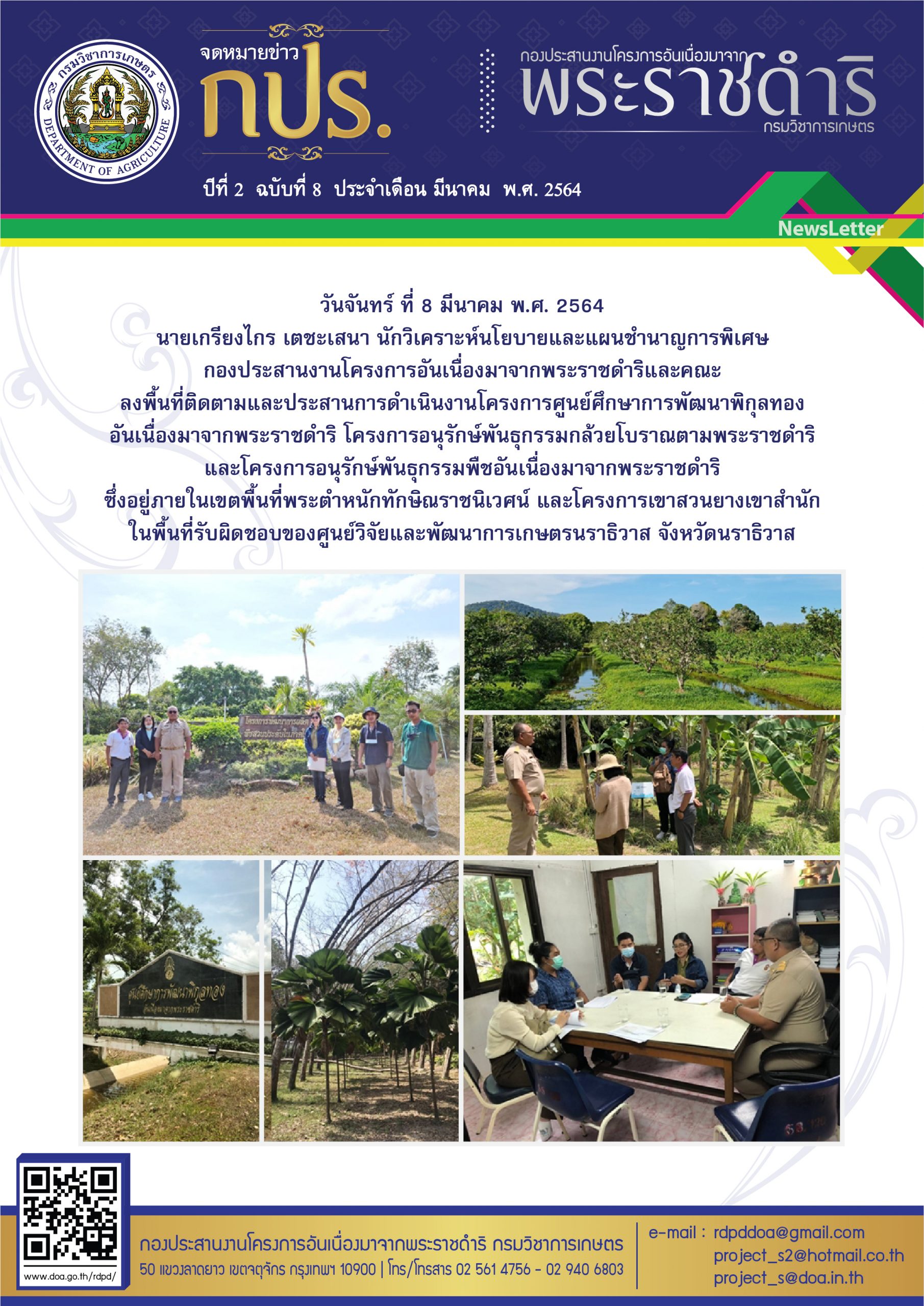 วันจันทร์ ที่ 8 มีนาคม พ.ศ. 2564 นายเกรียงไกร เตชะเสนา นักวิเคราะห์นโยบายและแผนชำนาญการพิเศษ และคณะ ลงพื้นที่ติดตามผลการดำเนินงานโครงการศูนย์ศึกษาการพัฒนาพิกุลทองอันเนื่องมาจากพระราชดำริ โครงการอนุรักษ์พันธุกรรมกล้วยโบราณตามพระราชดำริ และโครงการอนุรักษ์พันธุกรรมพืชอันเนื่องมาจากพระราชดำริ ซึ่งอยู่ภายในเขตพื้นที่พระตำหนักทักษิณราชนิเวศน์และโครงการเขาสวนยางเขาสำนัก ในพื้นที่รับผิดชอบของศูนย์วิจัยและพัฒนาการเกษตรนราธิวาส