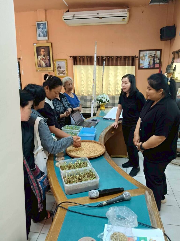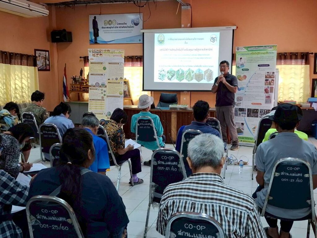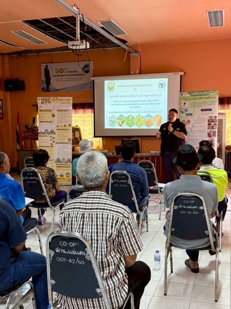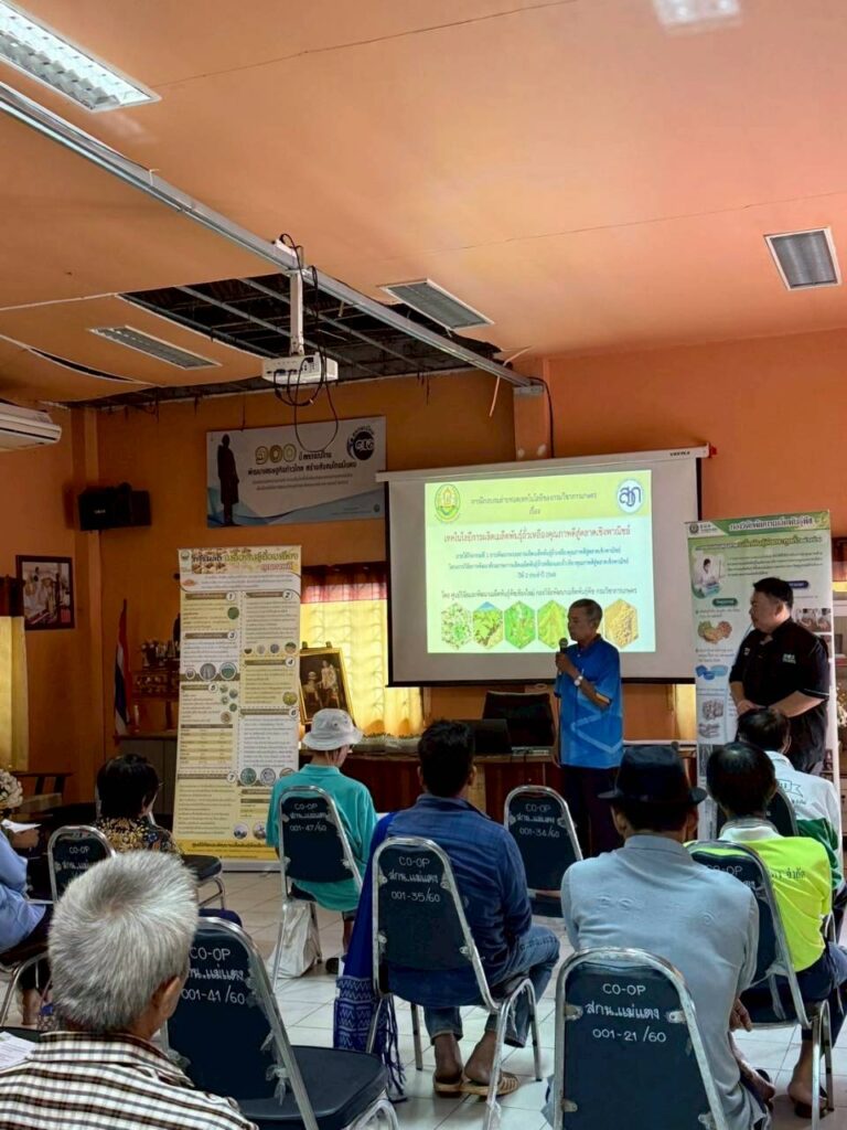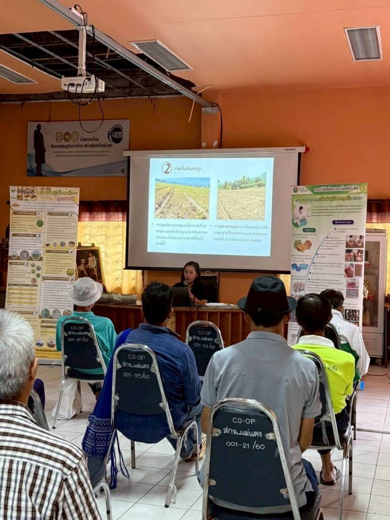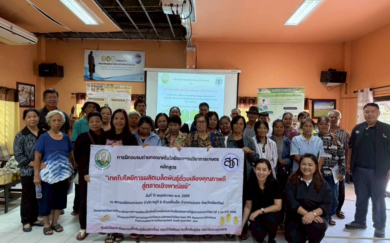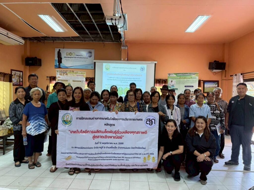 วันที่ 12 พฤศจิกายน 2568 ศูนย์วิจัยและพัฒนาเมล็ดพันธุ์พืชเชียงใหม่ ดำเนินโครงการวิจัย การพัฒนาศักยภาพการผลิตเมล็ดพันธุ์ถั่วเหลืองและถั่วเขียวคุณภาพดีสู่ตลาดเชิงพาณิชย์ ปีที่ 2 ประจำปี 2568 ที่ได้รับงบประมาณสนับสนุนทุนวิจัยด้านการนำผลงานวิจัยและนวัตกรรมไปใช้ประโยชน์ (RU: Research Utilization) สำนักงานพัฒนาการวิจัยการเกษตร (องค์การมหาชน) : สวก.โดยนักวิชาการเกษตรและเจ้าหน้าที่ศูนย์ฯ ได้จัดฝึกอบรมหลักสูตร “เทคโนโลยีการผลิตเมล็ดพันธุ์ถั่วเหลืองคุณภาพดีสู่ตลาดเชิงพาณิชย์” ภายใต้กิจกรรมที่ 1 การพัฒนาระบบการผลิตเมล็ดพันธุ์ถั่วเหลืองคุณภาพดีสู่ตลาดเชิงพาณิชย์การฝึกอบรมจัดขึ้นเพื่อถ่ายทอดองค์ความรู้และเทคโนโลยีการผลิตเมล็ดพันธุ์ถั่วเหลืองคุณภาพดีให้แก่สหกรณ์นิคมแม่แตง จำกัด หมู่ที่ 9 ตำบลขี้เหล็ก อำเภอแม่แตง จังหวัดเชียงใหม่ จำนวน 30 ราย ณ สหกรณ์นิคมแม่แตง จำกัด จังหวัดเชียงใหม่