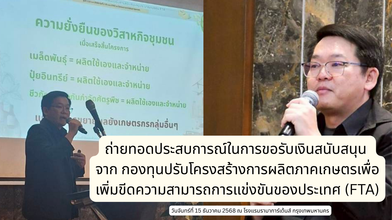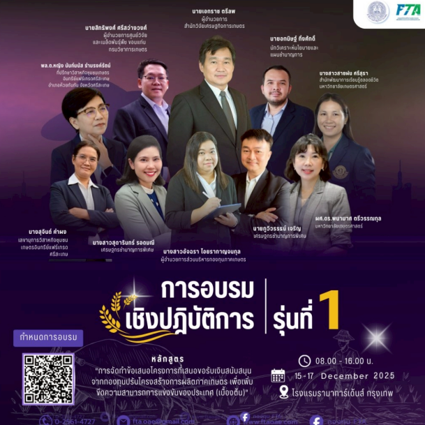 วันจันทร์ที่ 15 ธันวาคม 2568 กองทุนปรับโครงสร้างการผลิตภาคเกษตรฯ จัดการอบรมเชิงปฏิบัติการ รุ่นที่ 1 หลักสูตร “การจัดทำข้อเสนอโครงการที่เสนอขอรับเงินสนับสนุนจากกองทุนปรับโครงสร้างการผลิตภาคเกษตรเพื่อเพิ่มขีดความสามารถการแข่งขันของประเทศ (เบื้องต้น)” ระหว่างวันที่ 15–17 ธันวาคม 2568 ณ โรงแรมรามาการ์เด้นส์ กรุงเทพมหานคร โดยมีเกษตรกรผู้ผ่านการคัดเลือกเข้าร่วมอบรม จำนวน 55 คน การอบรมครั้งนี้มุ่งเสริมสร้างความรู้ ความเข้าใจเกี่ยวกับแนวทางการสนับสนุนเงินของกองทุนฯ เพื่อให้ผู้เข้าร่วมสามารถจัดทำข้อเสนอโครงการได้อย่างเหมาะสม ครบถ้วนสมบูรณ์ และมีโอกาสได้รับการสนับสนุนเงินจากกองทุนฯ รวมทั้งมีความรู้ความเข้าใจเกี่ยวกับเขตการค้าเสรี และผลกระทบที่เกิดขึ้นจากการทำข้อตกลงการค้าเสรี