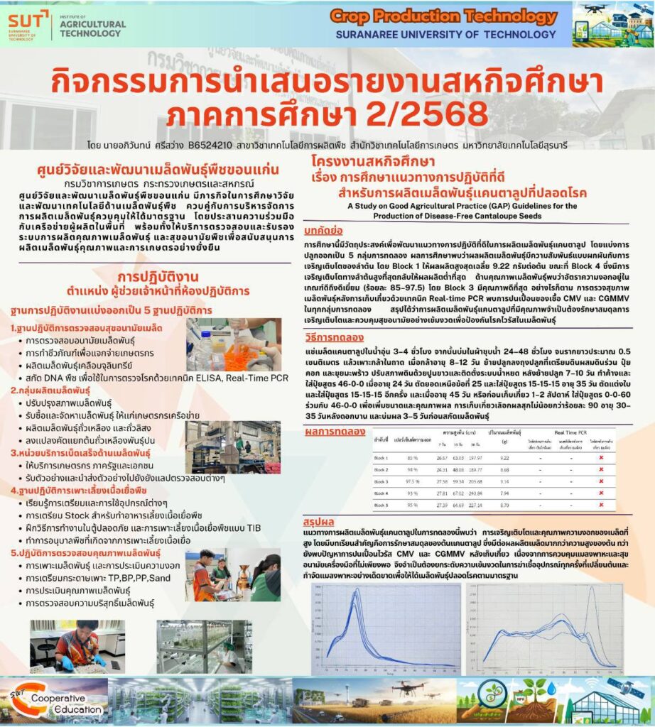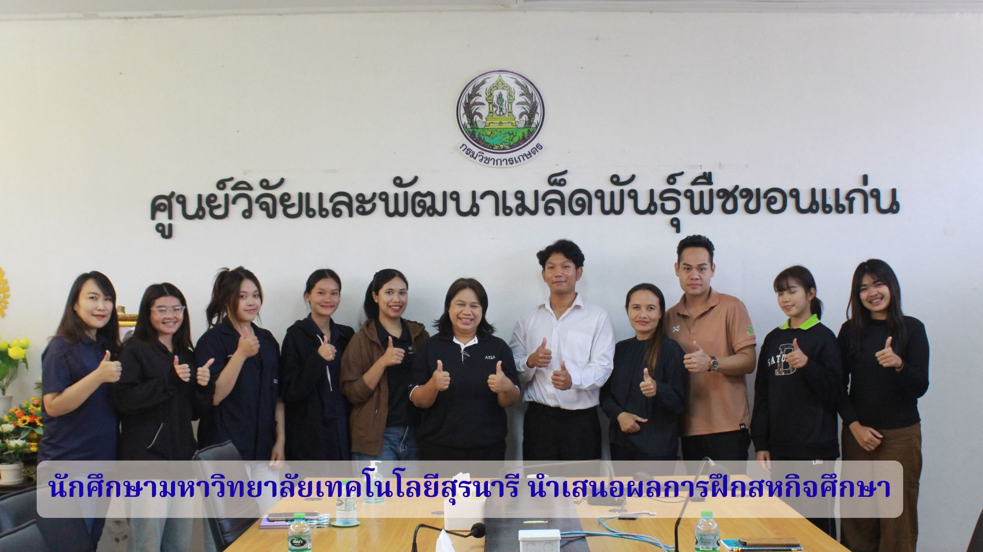 เมื่อวันที่ 30 มกราคม 2569 นางศิริลักษณ์ พุทธวงค์ นักวิชาการเกษตรชำนาญการ พร้อมด้วย เจ้าหน้าที่ ศวม.ขอนแก่น เข้ารับฟังการ นำเสนอผลการฝึกสหกิจศึกษาของนักศึกษา มทส.โดยสรุปผลการดำเนินโครงงานเรื่อง “การศึกษาแนวทางการปฏิบัติที่ดีสำหรับการผลิตเมล็ดพันธุ์แคนตาลูปปลอดโรค” ซึ่งเป็นผลจากการปฏิบัติงานจริงในภาคสนามและห้องปฏิบัติการ ณ.ห้องประชุมศูนย์วิจัยและพัฒนาเมล็ดพันธุ์พืชขอนแก่น