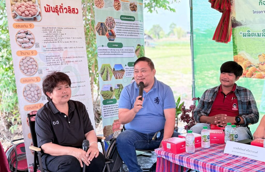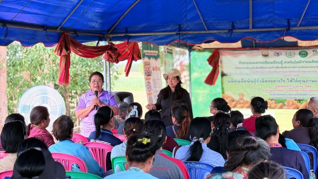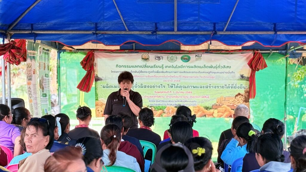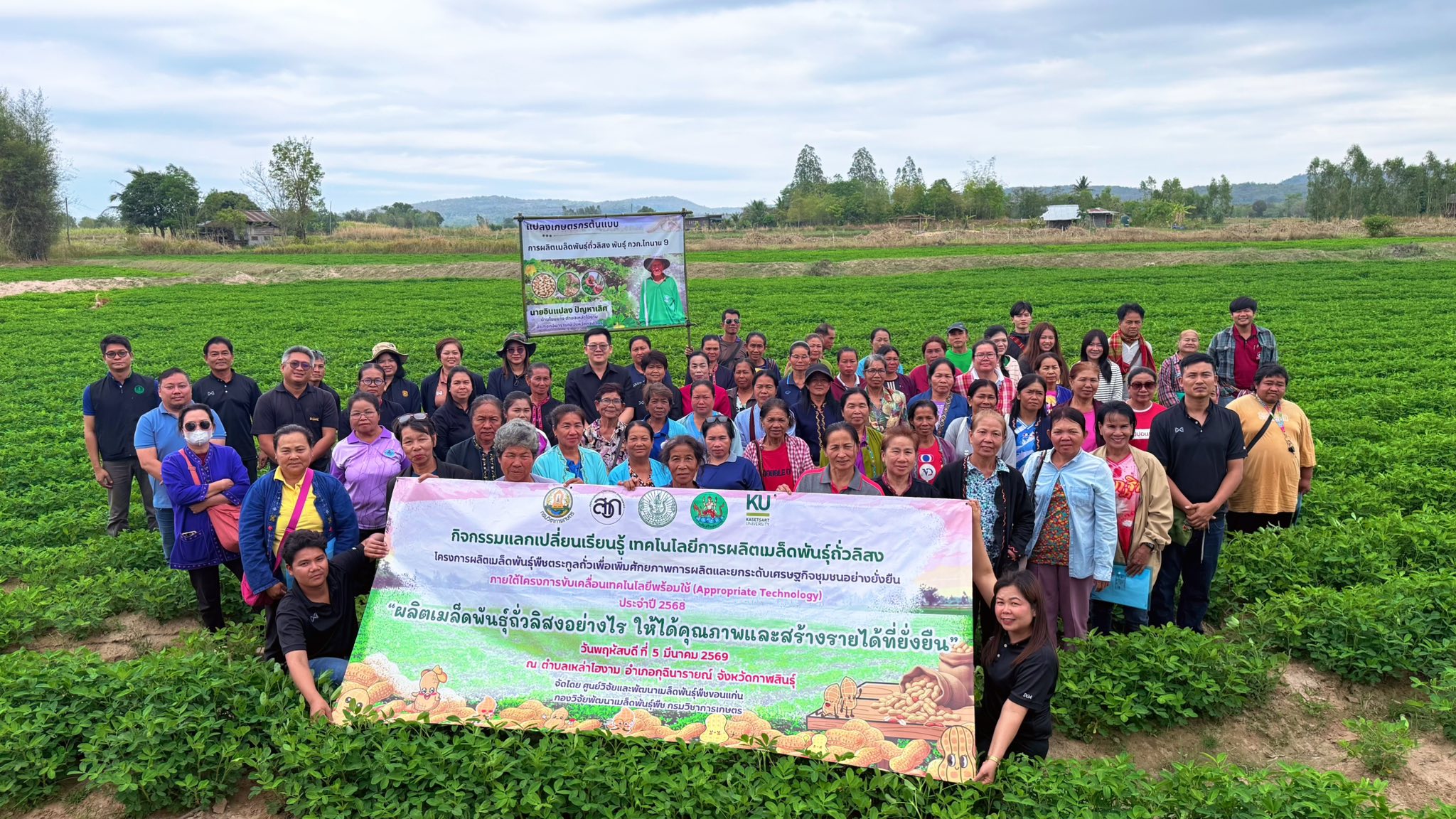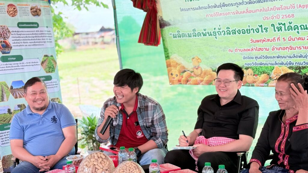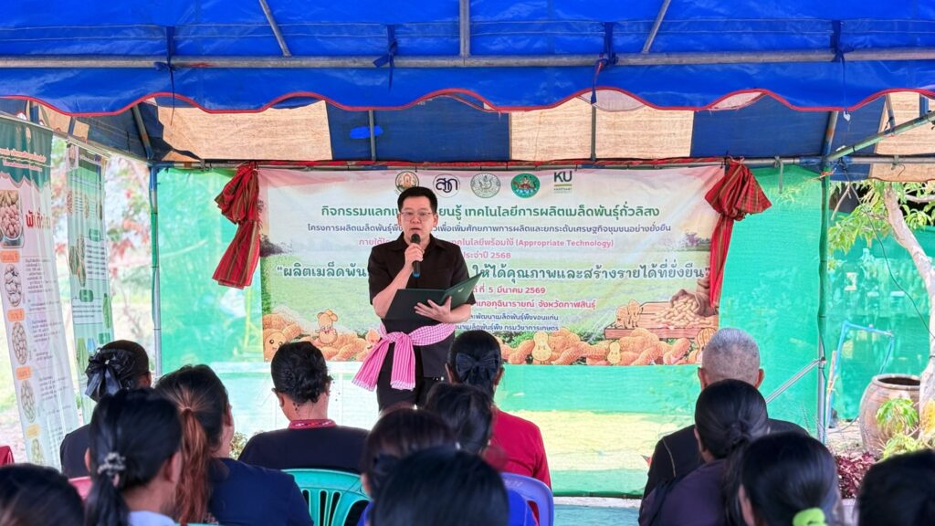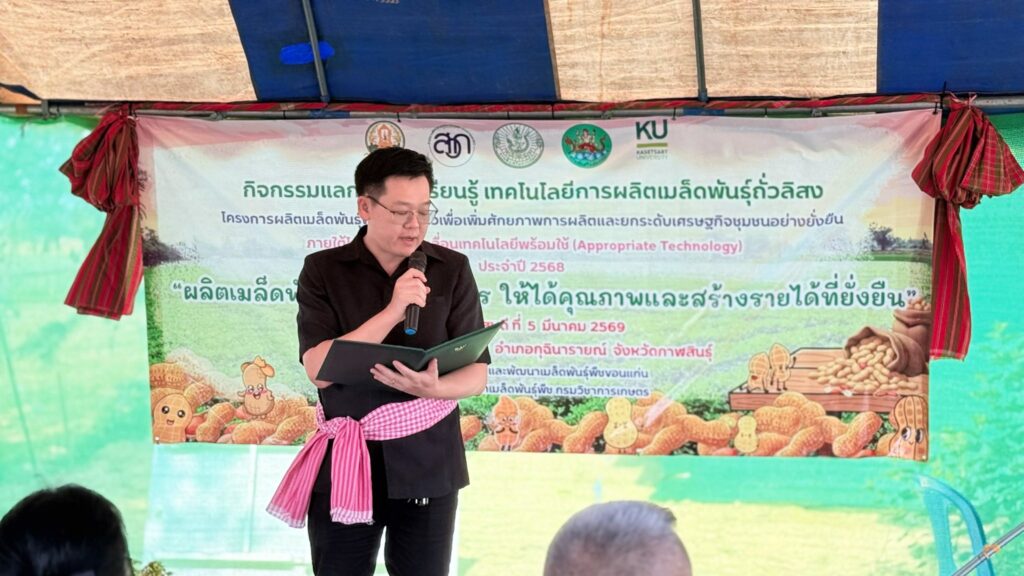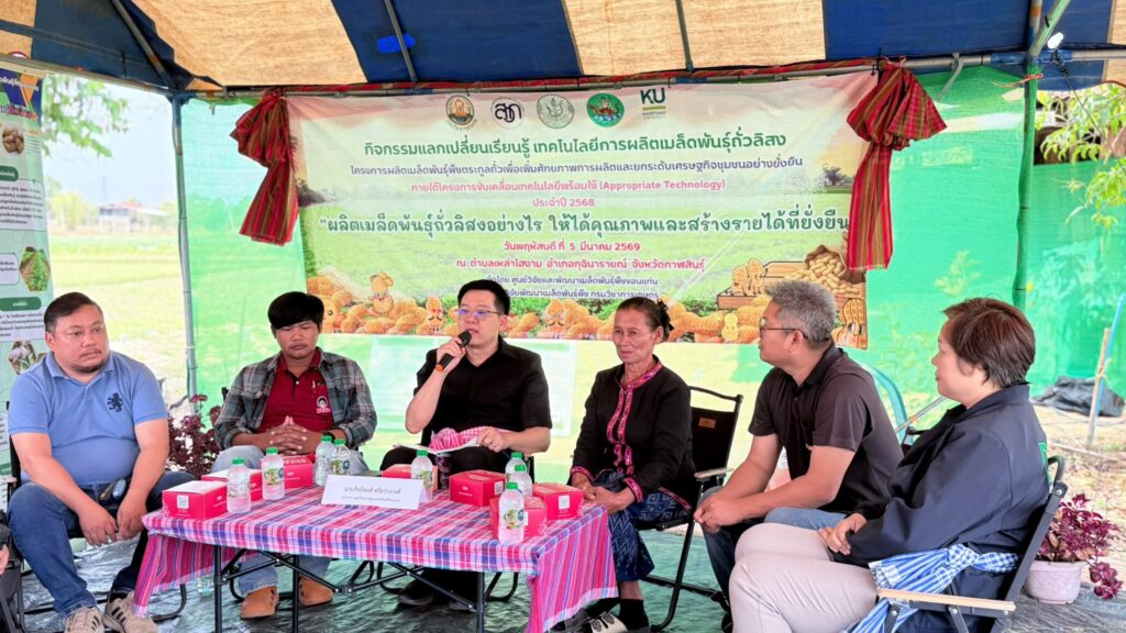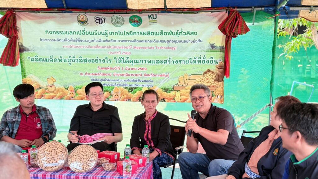 วันพฤหัสบดีที่ 5 มีนาคม 2569 ศูนย์วิจัยและพัฒนาเมล็ดพันธุ์พืชขอนแก่น จัดกิจกรรมแลกเปลี่ยนเรียนรู้ เทคโนโลยีการผลิตเมล็ดพันธุ์ถั่วลิสง การดูงานแปลงต้นแบบ ภายใต้โครงการผลิตเมล็ดพันธุ์พืชตระกูลถั่วเพื่อเพิ่มศักยภาพการผลิตและยกระดับเศรษฐกิจชุมชนอย่างยั่งยืน ภายใต้โครงการขับเคลื่อนเทคโนโลยีพร้อมใช้ (Appropriate Technology) โดยมี นายสิทธิพงศ์ ศรีสว่างวงค์ ผู้อำนวยการศูนย์วิจัยและพัฒนาเมล็ดพันธุ์พืชขอนแก่น พร้อมด้วยเจ้าหน้าที่ของศูนย์ฯ ร่วมจัดกิจกรรมแลกเปลี่ยนเรียนรู้ ในหัวข้อ “ผลิตเมล็ดพันธุ์ถั่วลิสงอย่างไร ให้ได้คุณภาพและสร้างรายได้ที่ยั่งยืน” และได้รับเกียรติจากหน่วยงานภาคี ได้แก่ สำนักงานเกษตรอำเภอกุฉินารายณ์ ศูนย์ขยายพันธุ์พืชที่ 7 จังหวัดมหาสารคาม ศูนย์วิจัยพืชไร่ขอนแก่น ศูนย์วิจัยและพัฒนาการเกษตรร้อยเอ็ด และบริษัท แม่รวยการเกษตร (โก๋แก่) จำกัด