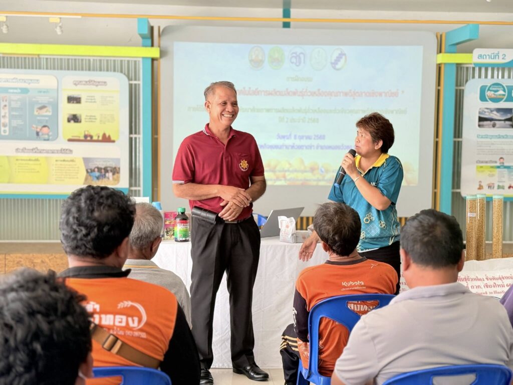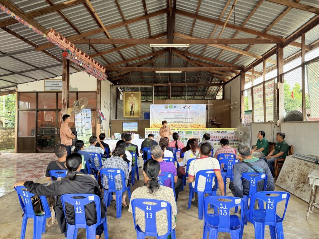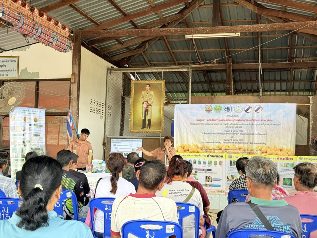 นางสาววิมลรัตน์ ดำขำ ตำแหน่งนักวิชาการเกษตรชำนาญการ ผู้อำนวยการกลุ่มผลิตเมล็ดพันธุ์ และเจ้าหน้าที่ของศูนย์วิจัยและพัฒนาเมล็ดพันธุ์พืชขอนแก่น ร่วมกับสำนักงานสหกรณ์จังหวัดอุดรธานี พร้อมด้วยเจ้าหน้าที่สหกรณ์ การเกษตรหนองวัวซอ จำกัด และเจ้าหน้าที่สหกรณ์การเกษตรบ้านผือ จำกัด จัดฝึกอบรม หลักสูตร “เทคโนโลยีการผลิตเมล็ดพันธุ์ถั่วเหลืองคุณภาพดีสู่ตลาดเชิงพาณิชย์ ปีที่ 2 ปี 2568” ภายใต้โครงการวิจัยการพัฒนาศักยภาพการผลิตเมล็ดพันธุ์ถั่วเหลืองและถั่วเขียวคุณภาพดีสู่ตลาดเชิงพาณิชย์ โดยมีเกษตรกรเข้าร่วมฝึกอบรม ณ กลุ่มวิสาหกิจชุมชนทำนาห้วยตาดข่า อำเภอหนองวัวซอ จังหวัดอุดรธานี วันที่ 8 ตุลาคม 2568 จำนวน 20 รายและ ณ ศาลาเอนกประสงค์ หมู่ที่ 13 ตำบลบ้านโคก อำเภอสุวรรณคูหา จังหวัดหนองบัวลำภู วันที่ 8 ตุลาคม 2568 จำนวน 20 ราย