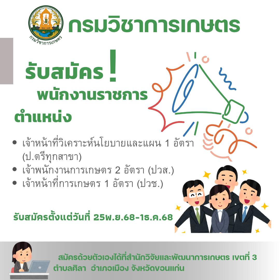 ด้วยกรมวิชาการเกษตร โดยสำนักวิจัยและพัฒนาการเกษตรเขตที่3 จังหวัดขอนแก่น (สวพ.3) ประสงค์จะรับสมัครบุคคลเพื่อจัดจ้างเป็นพนักงานราชการทั่วไป ฉะนั้น อาศัยอำนาจตามประกาศคณะกรรมการบริหารพนักงานราชการ เรื่อง หลักเกณฑ์ วิธีการ และเงื่อนไขการสรรหาและเลือกสรรพนักงานราชการและแบบสํญญาจ้างของพนักงานราชการ พ.ศ.2552 ลงวันที่11กันยายน2552ระเบียบสำนักนายกรัฐมนตรีว่าด้วยพนักงานราชการ พ.ศ.2547ประกาศคณะกรรมการการบริหารพนักงานราชการ เรื่อง การกำหนดลักษณะงานและคุณสมบัติเฉพาะของกลุ่มงาน และจัดกรอบอัตรากำลังพนักงานราชการ พ.ศ.2544 ลงวันที่ 28กุมภาพันธ์2544 และฉบับที่2 พ.ศ.2545 ลงวันที่ 26กันยายน 2555 จึงประกาศรับสมัครบุคคลเพื่อเลือกสรรเป็นพนักงานราชการทั่วไป ของสำนักวิจัยและพัฒนาการเกษตรเขตที่3 จังหวัดขอนแก่น