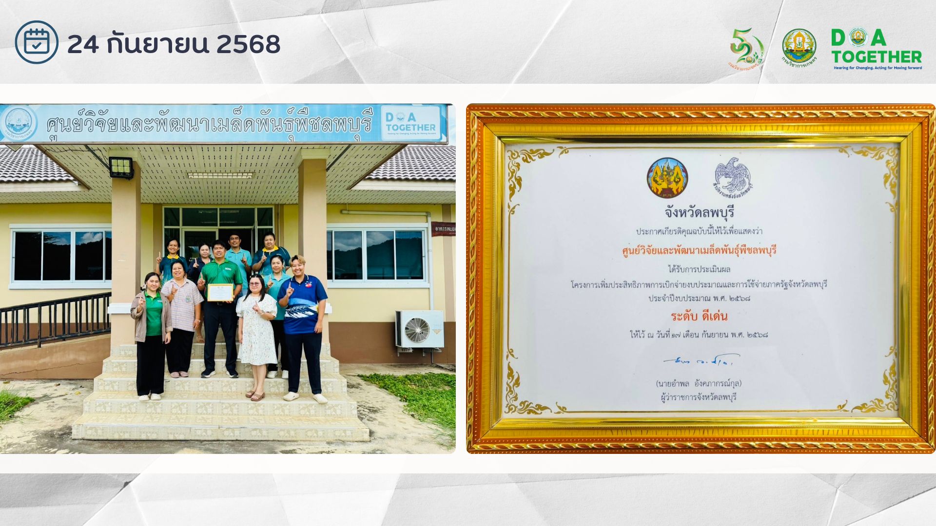 ศูนย์วิจัยและพัฒนาเมล็ดพันธุ์พืชลพบุรี ได้รับเกียรติบัตรประกาศเกียรติคุณ ตามโครงการเพิ่มประสิทธิภาพการเบิกจ่ายงบประมาณและการใช้จ่ายภาครัฐจังหวัดลพบุรี ประจำปีงบประมาณ พ.ศ. 2568 ระดับ ดีเด่น